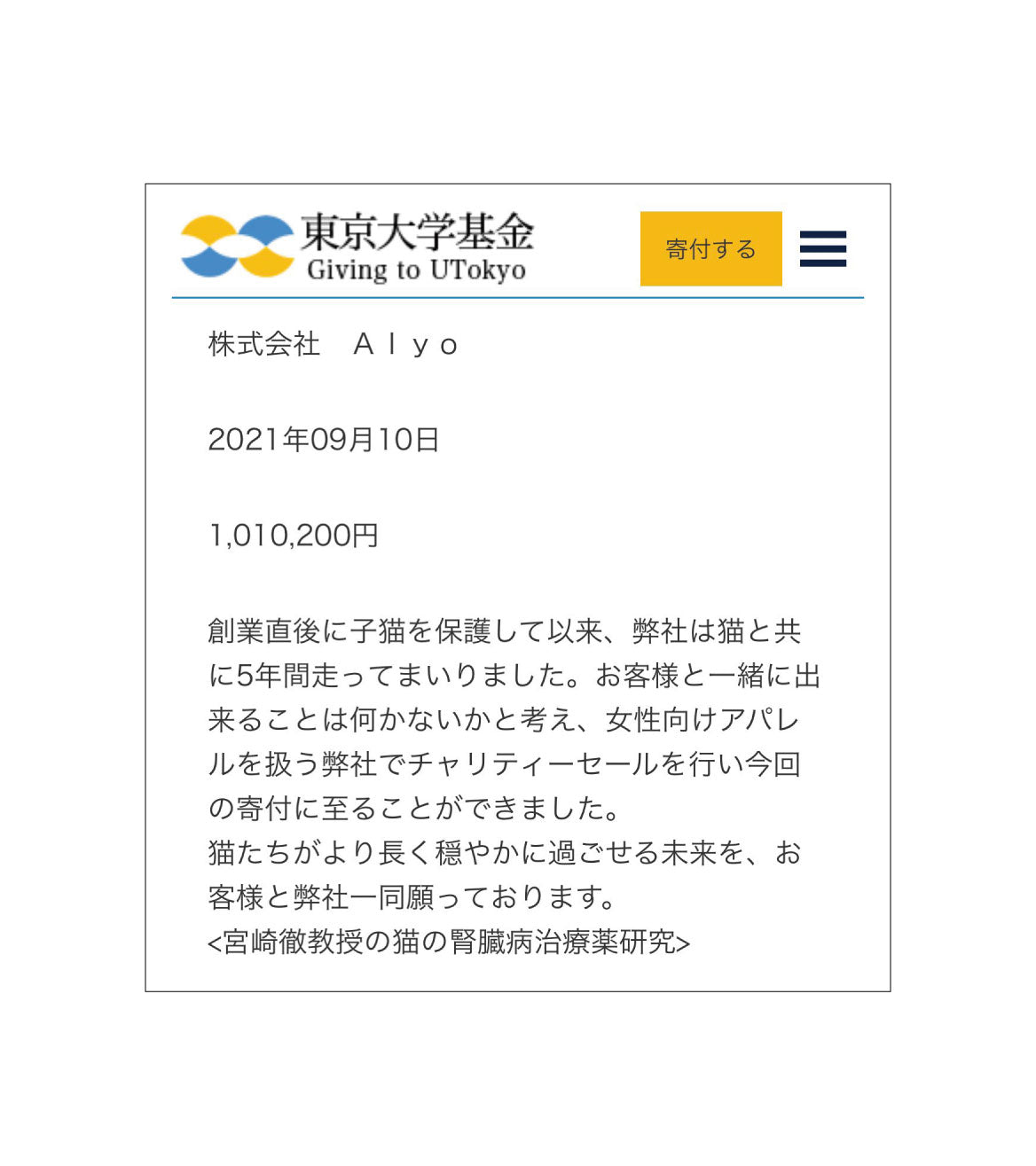 チャリティセールを通して東京大学基金様へ「1,010,200円」の寄付をすることができました。猫と歩んできた会社として、猫たちがより長く穏やかに過ごせる未来を願っております。