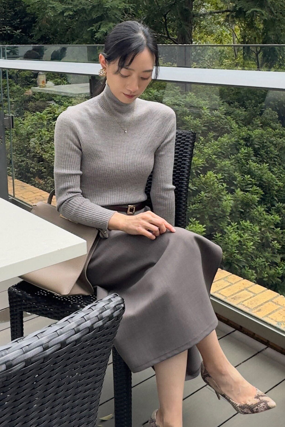 I paired the SERPENTINA roll collar peplum set skirt with a gray high neck knit for a sophisticated look✨