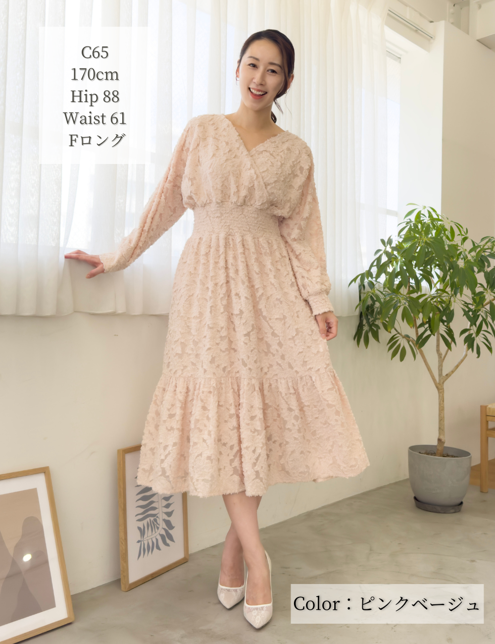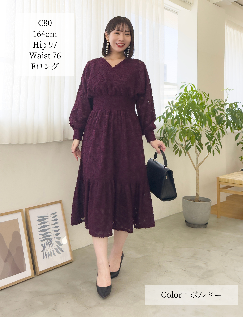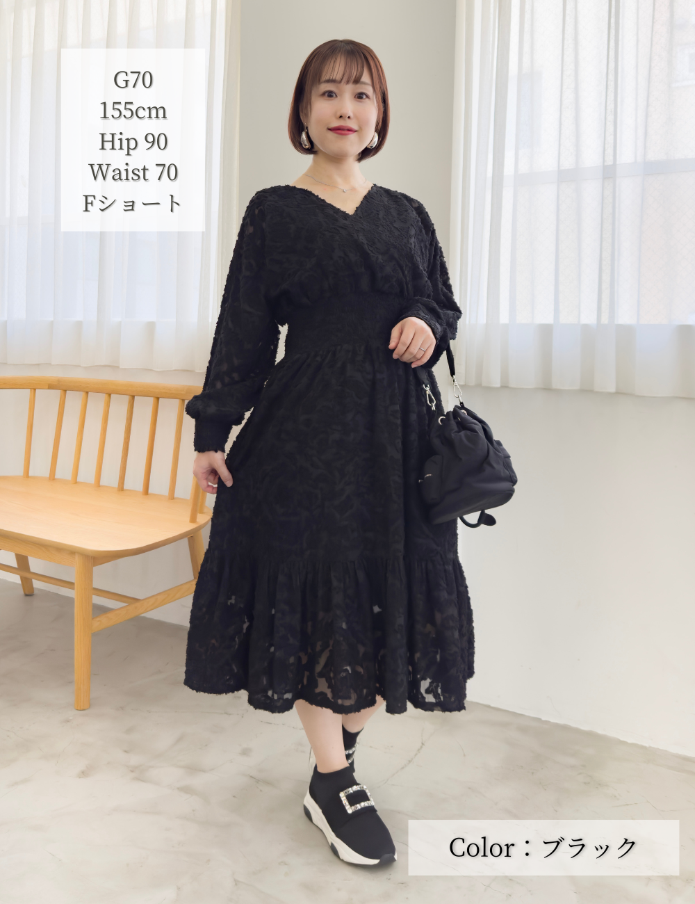 Shirring on both sides allows the waist to stretch. The short sleeves are not too short, so they hide your upper arms while still allowing you to enjoy the sheerness of the scallops.