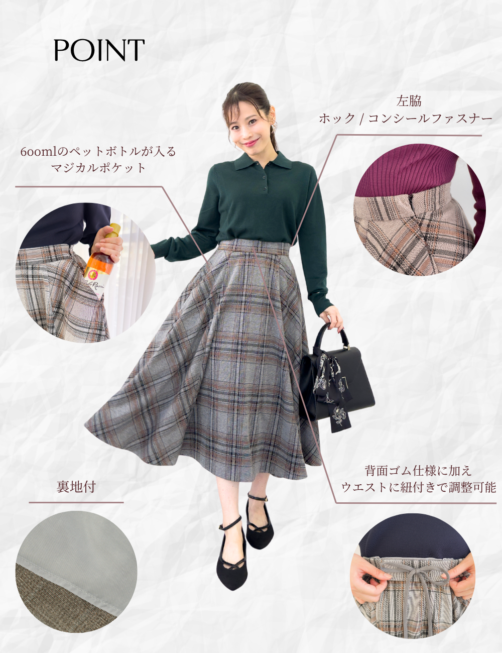600mlボトルが入るマジカルポケット付きで、クラシカルな装いにぴったりな小さなバッグも涼しい顔で持てます。