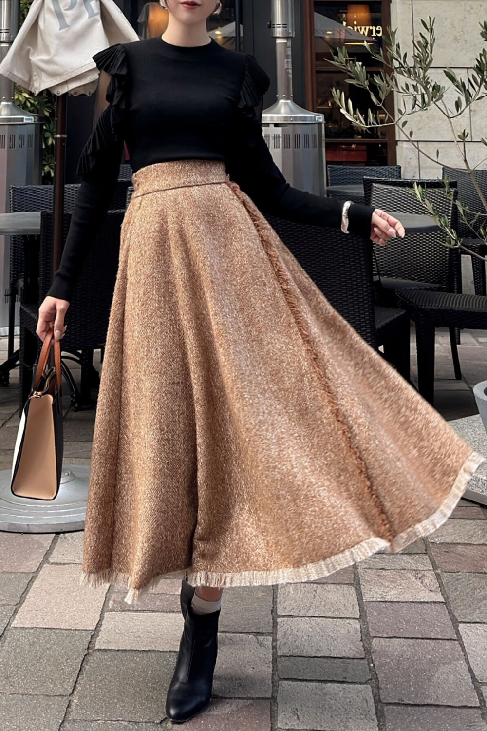 着用アイテム:ツイードフリンジAラインスカート着用カラー:ブラウン着用サイズ:スリムロングトップスをブラックにすると、より高級な印象になります✨