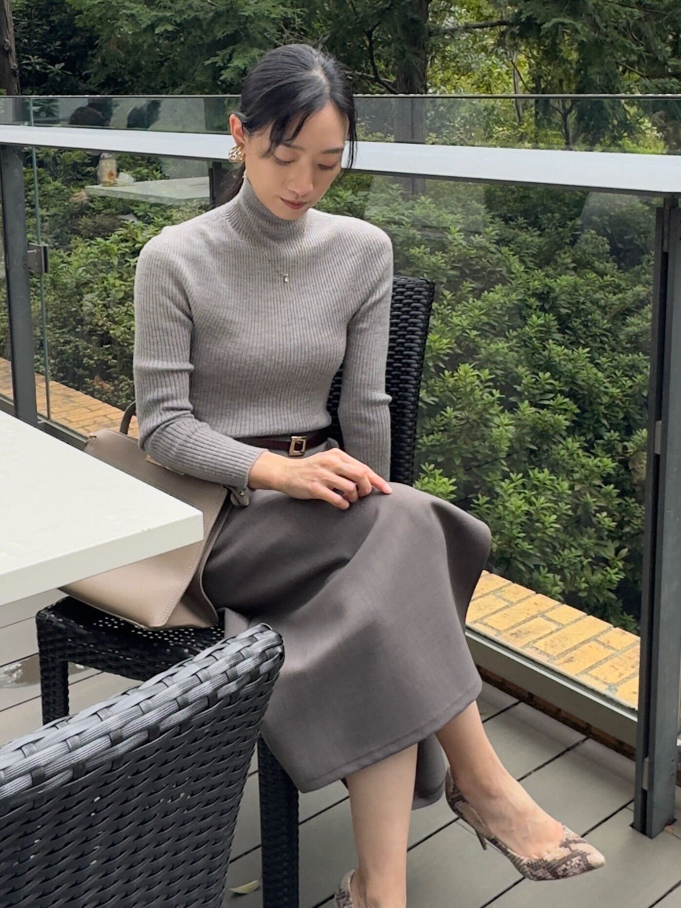 SERPENTINAのロールカラーペプラムセットアップのスカートとグレーのハイネックニットを合わせて大人な着回しコーディネートになりました✨忙しい大人のための走れる上品スカートです!SERPENTINAの商品はこちら