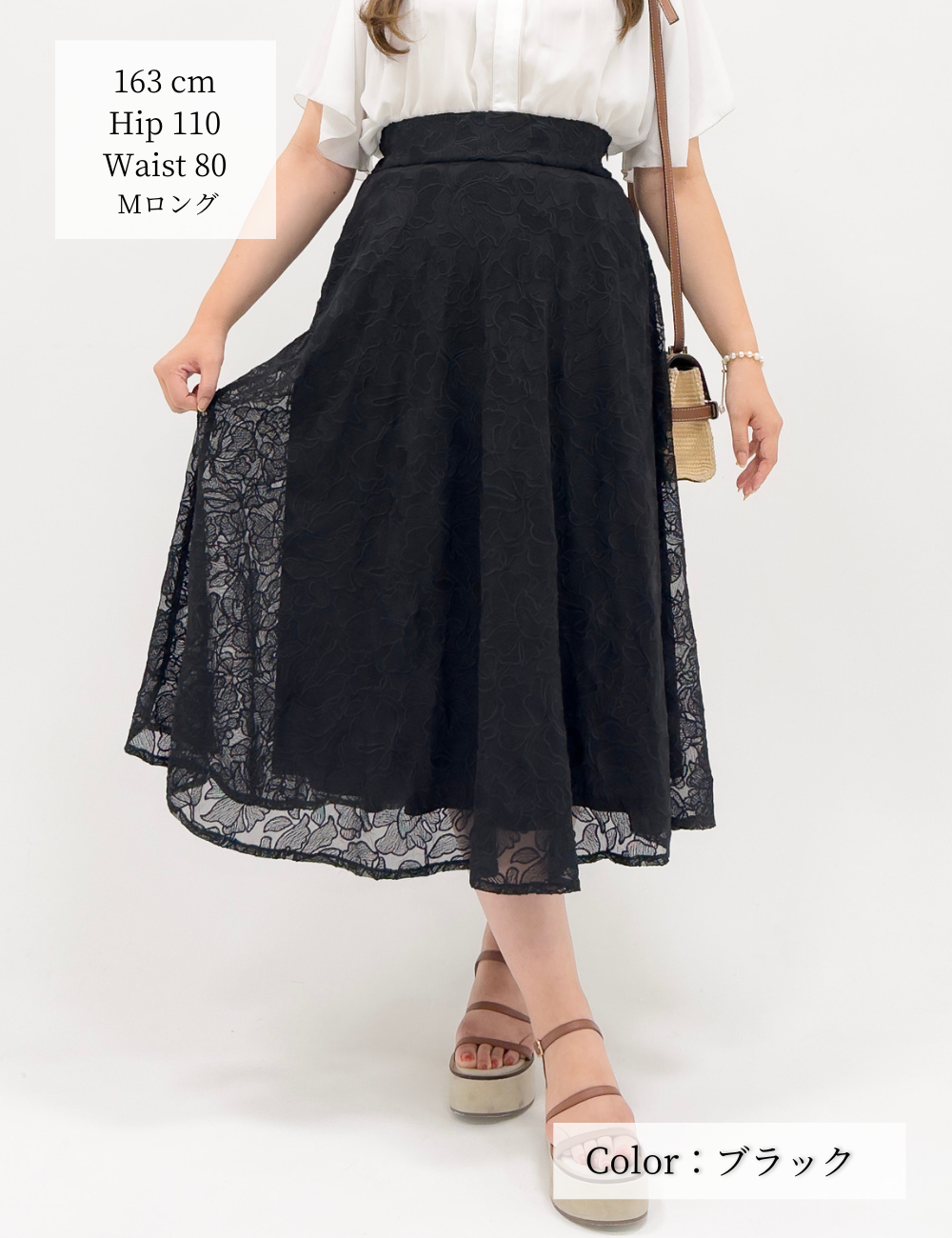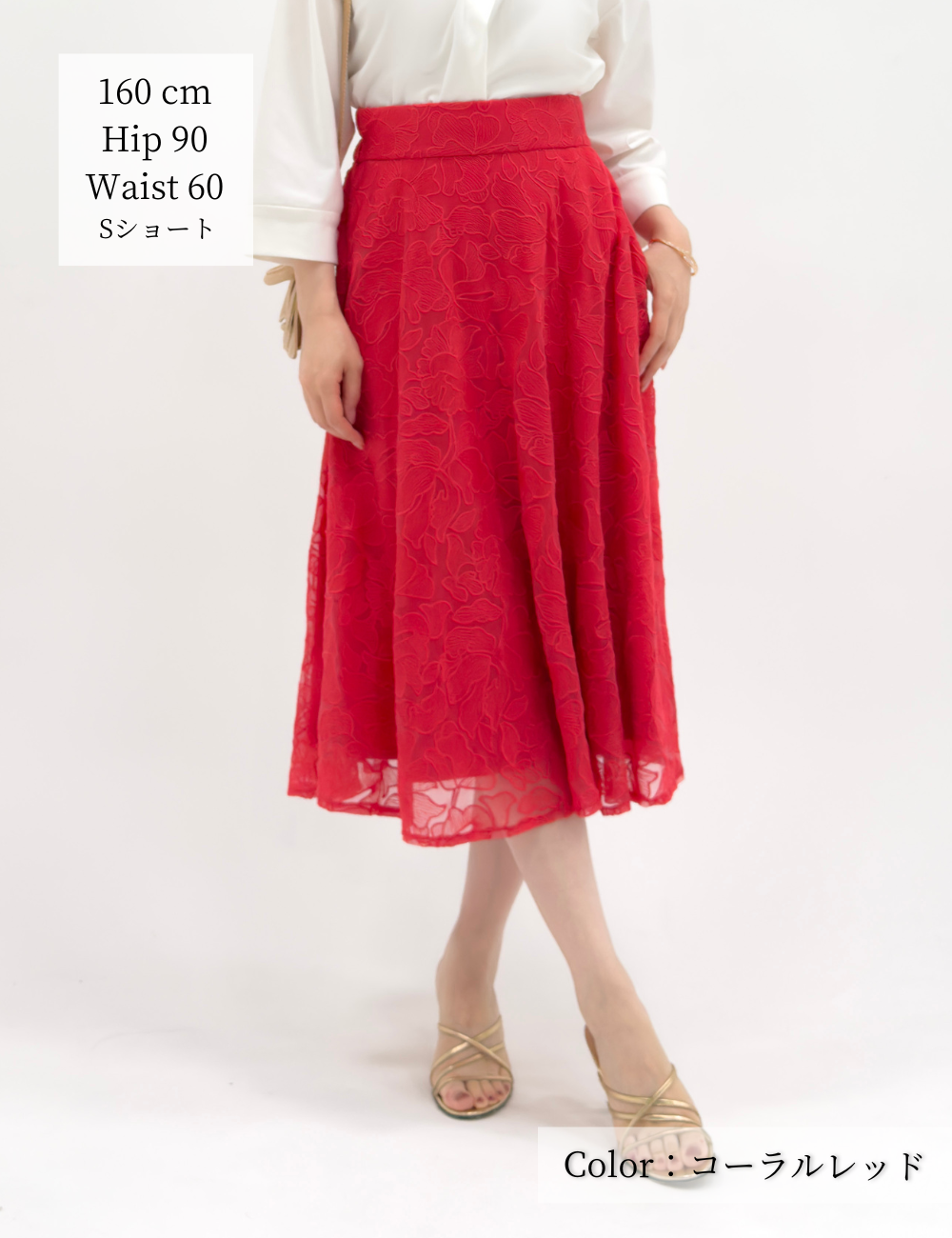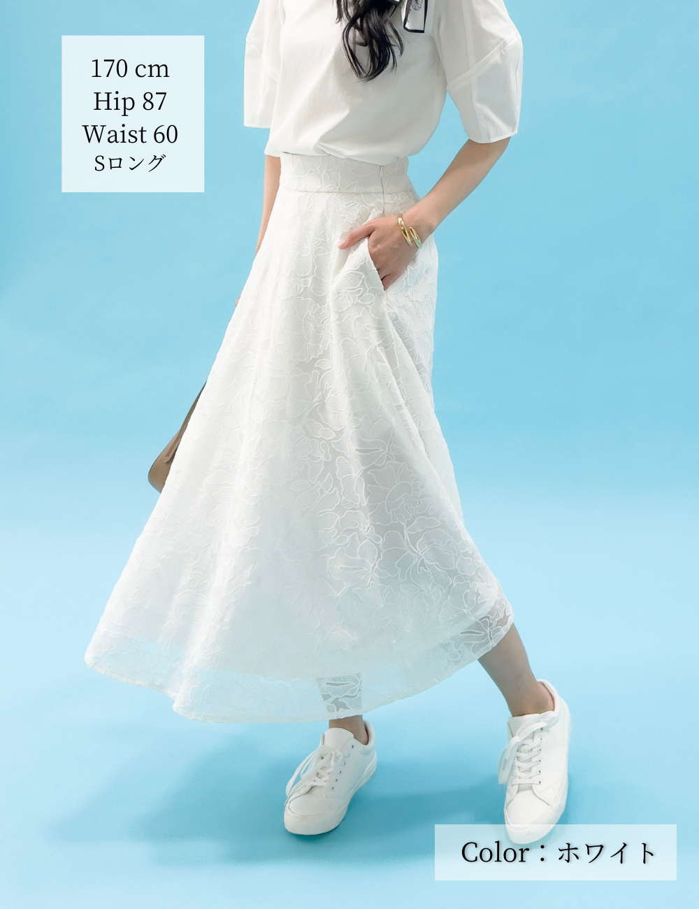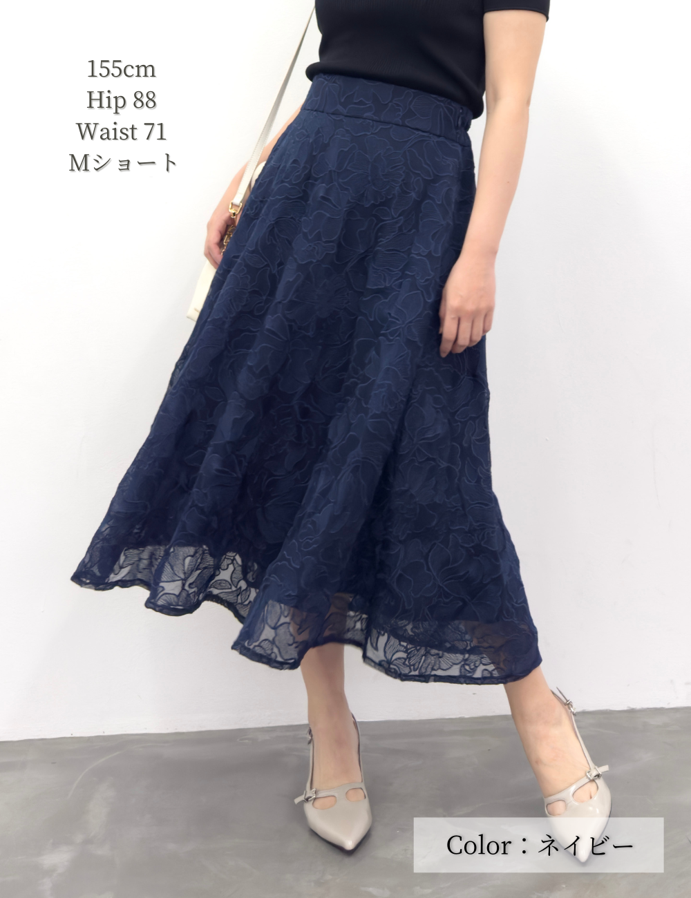 チュールに立体的な花の刺繍を施したAラインのレーススカートです。