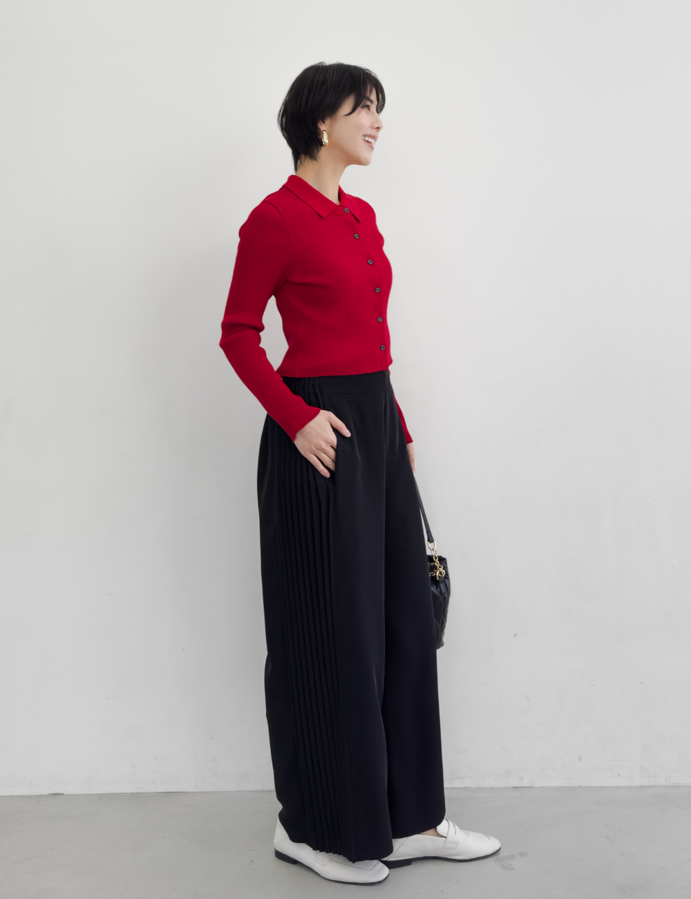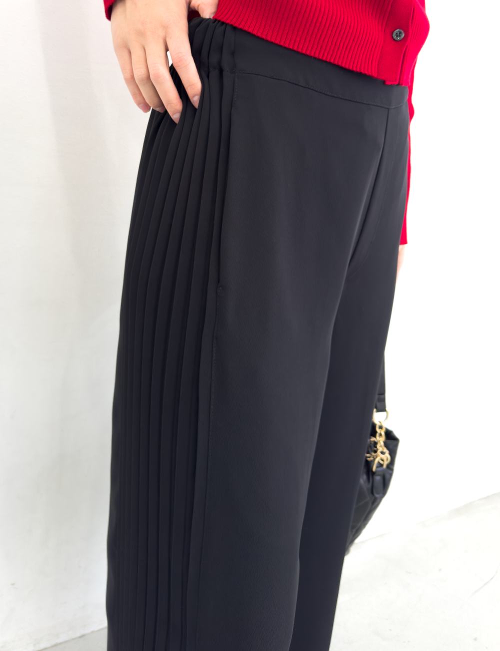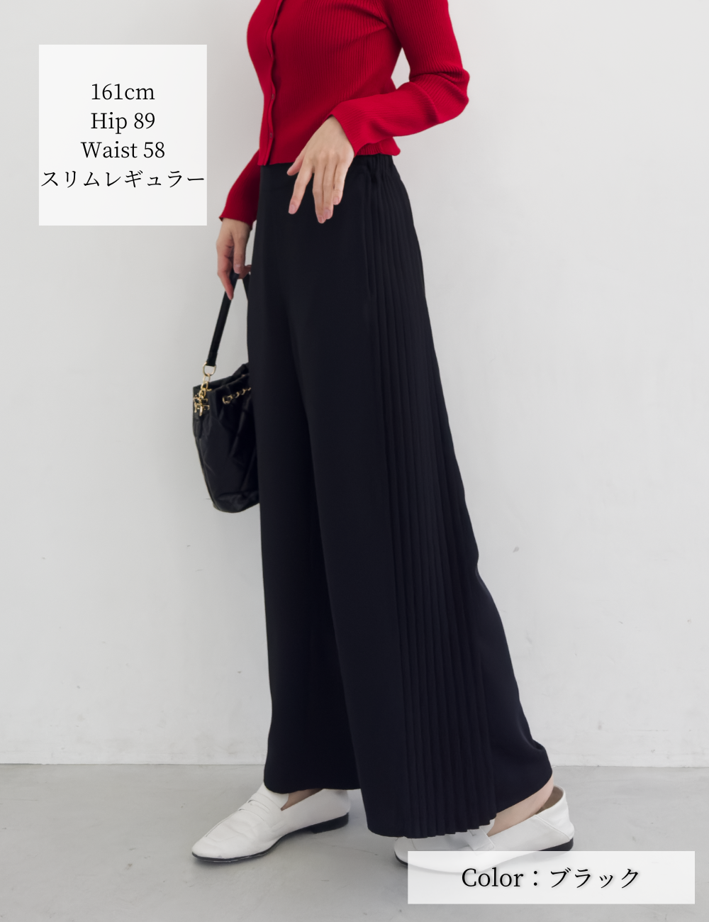 シャリ感のある、爽やかな生地は過ごしやすく、高級感のあるしっかりしたプリーツが脚長効果◎。