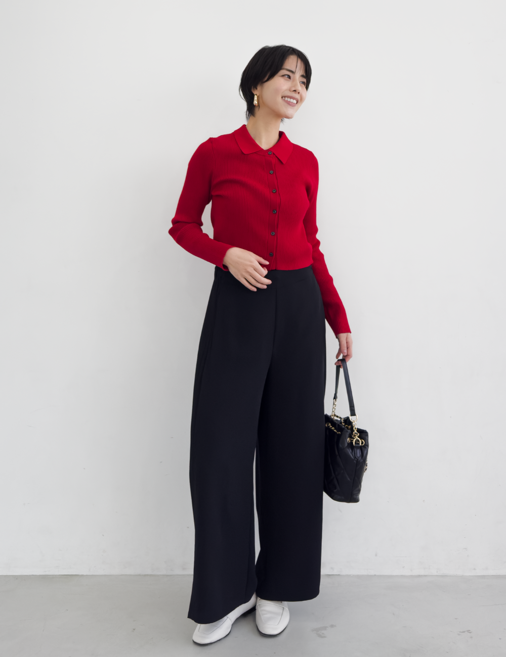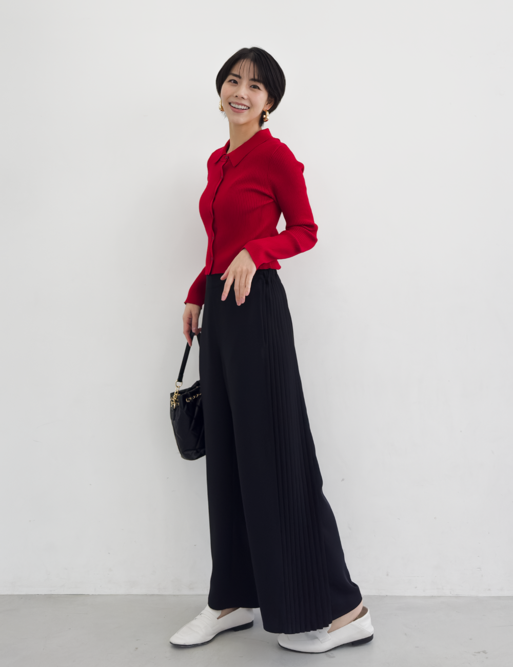 落ち感のある素材なので秋冬のニットやコートとも相性抜群。季節をまたいで長く楽しめる一本です。
