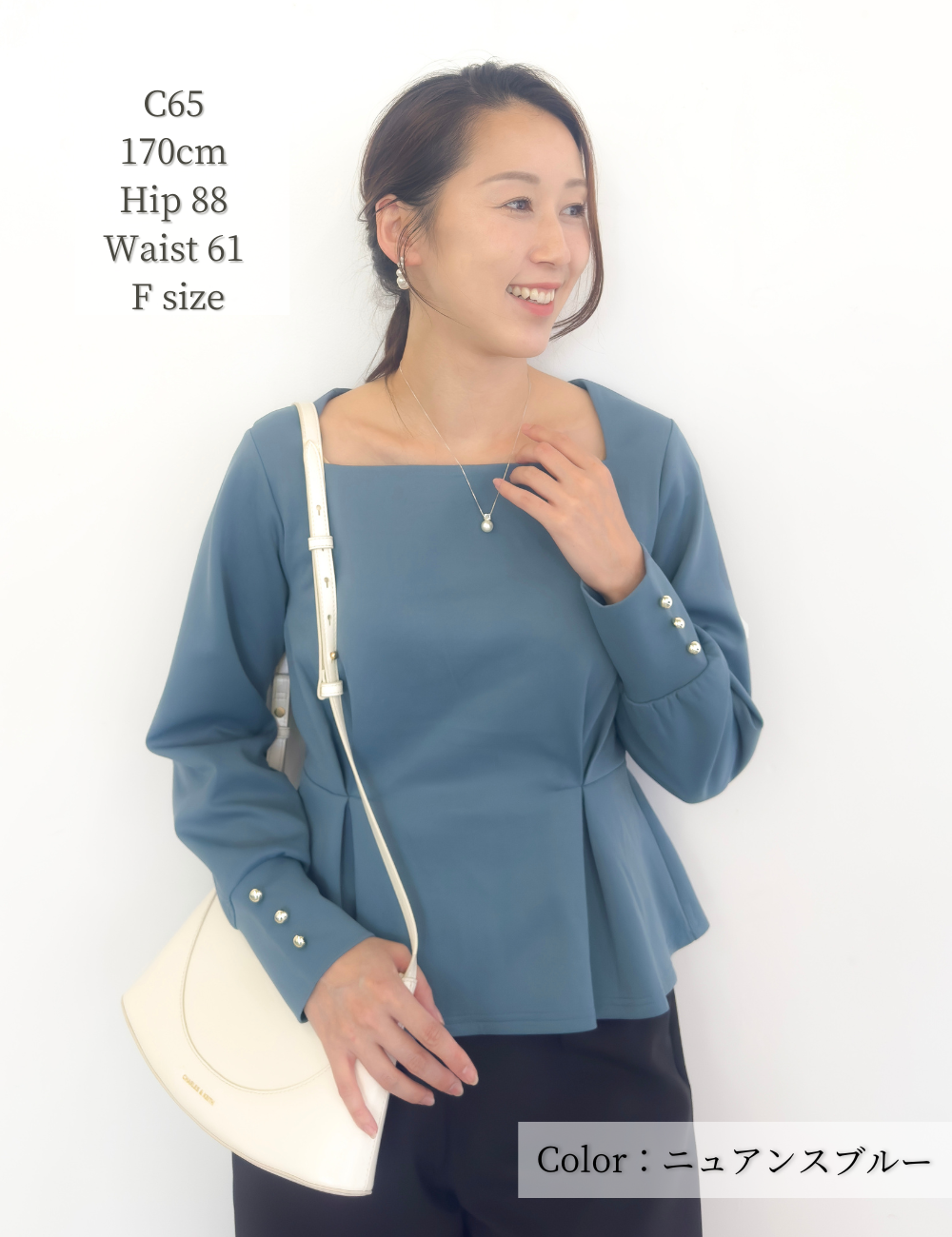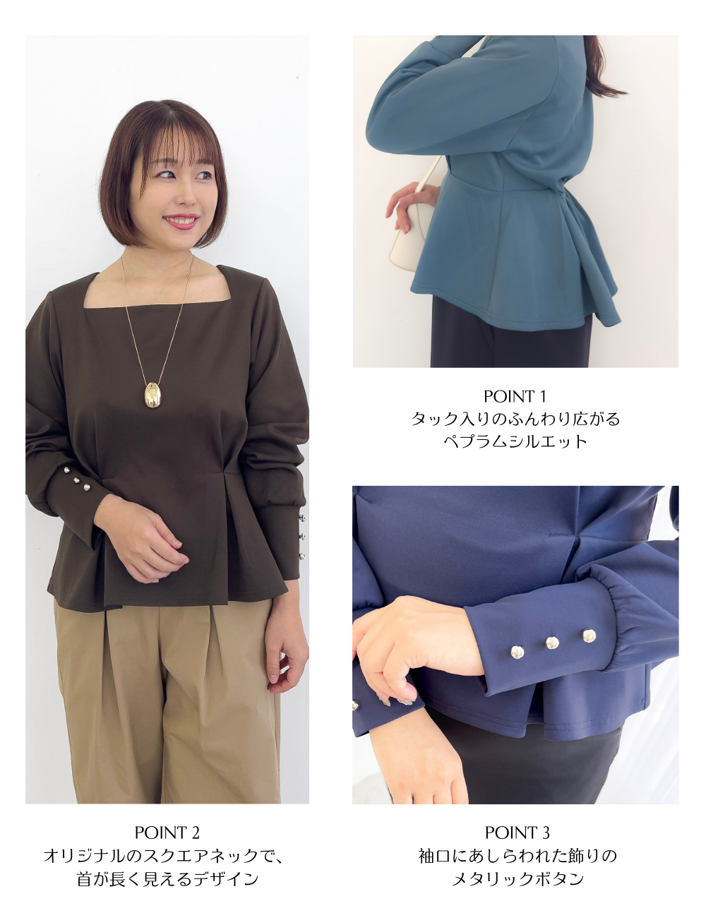 ・オリジナルのスクエアネックで、首が長く見えるデザイン