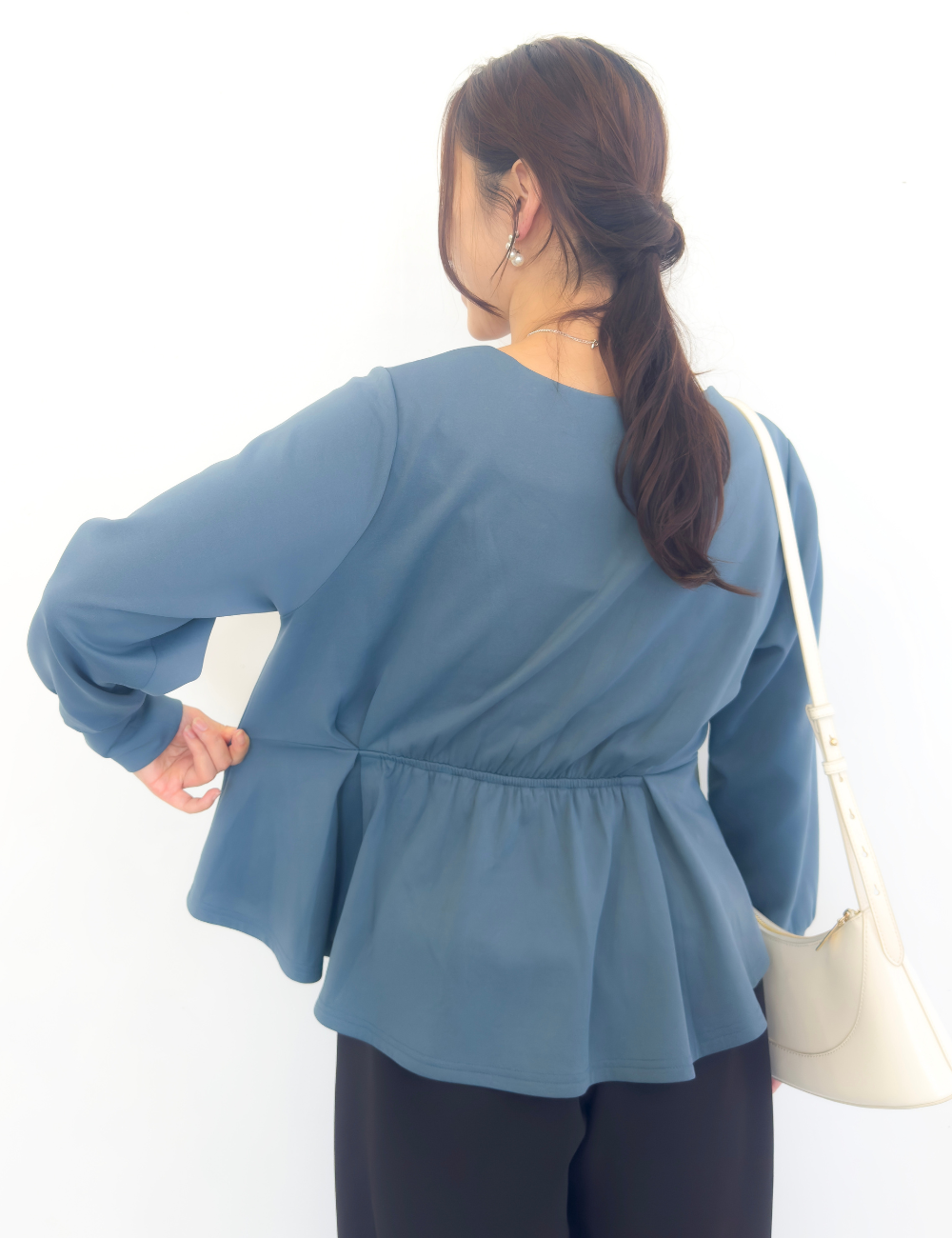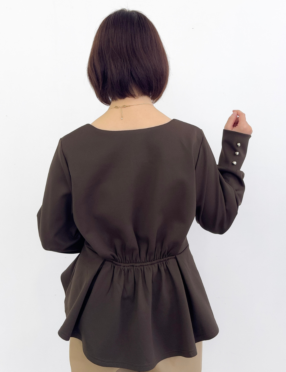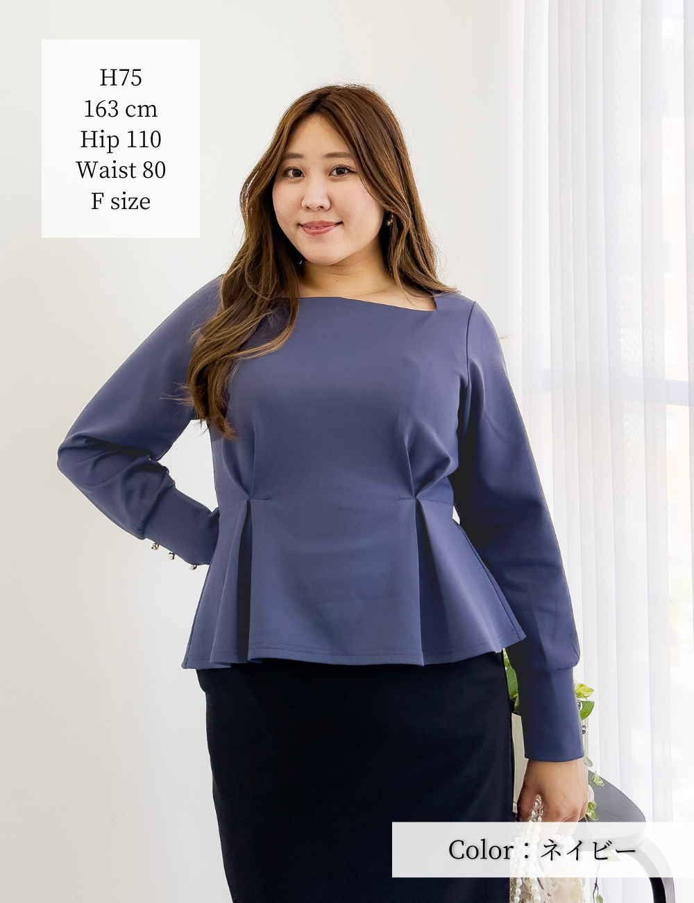 タック入りのふんわり広がるペプラムシルエットがウエスト位置をマークし、着膨れを防ぎます。