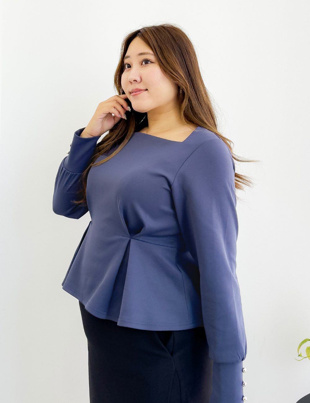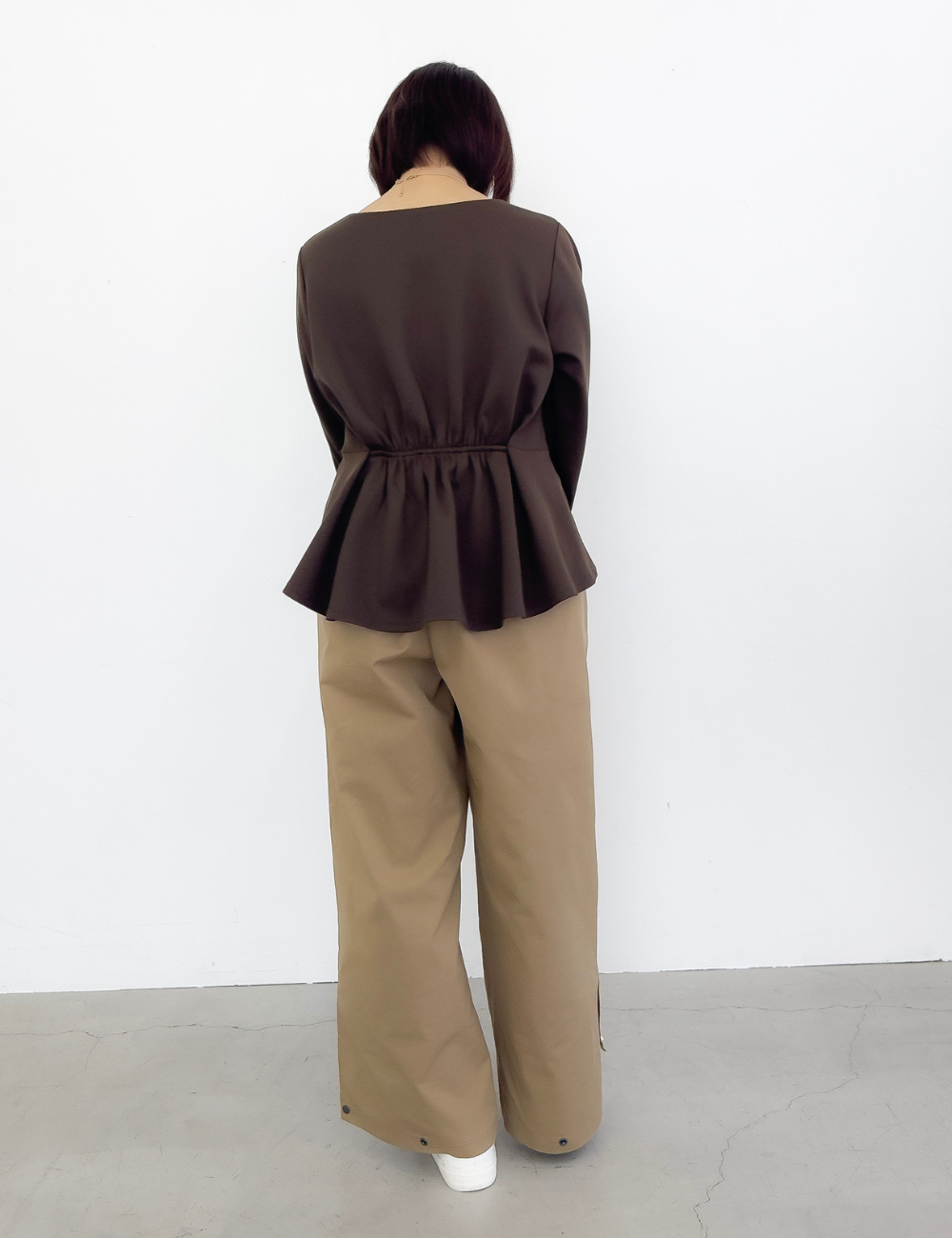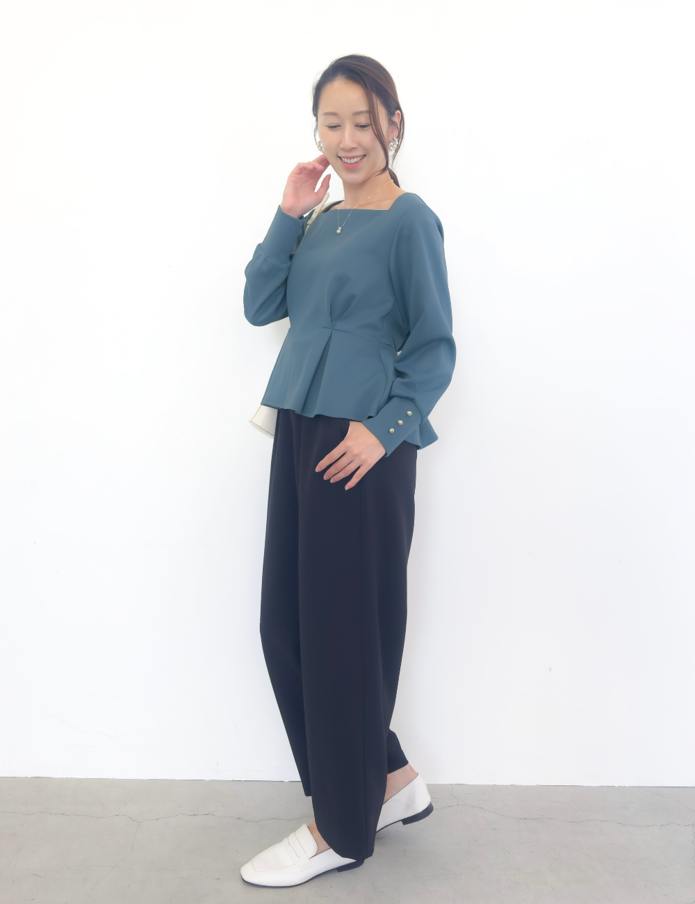 タック入りのふんわり広がるペプラムシルエットがウエスト位置をマークし、着膨れを防ぎます。