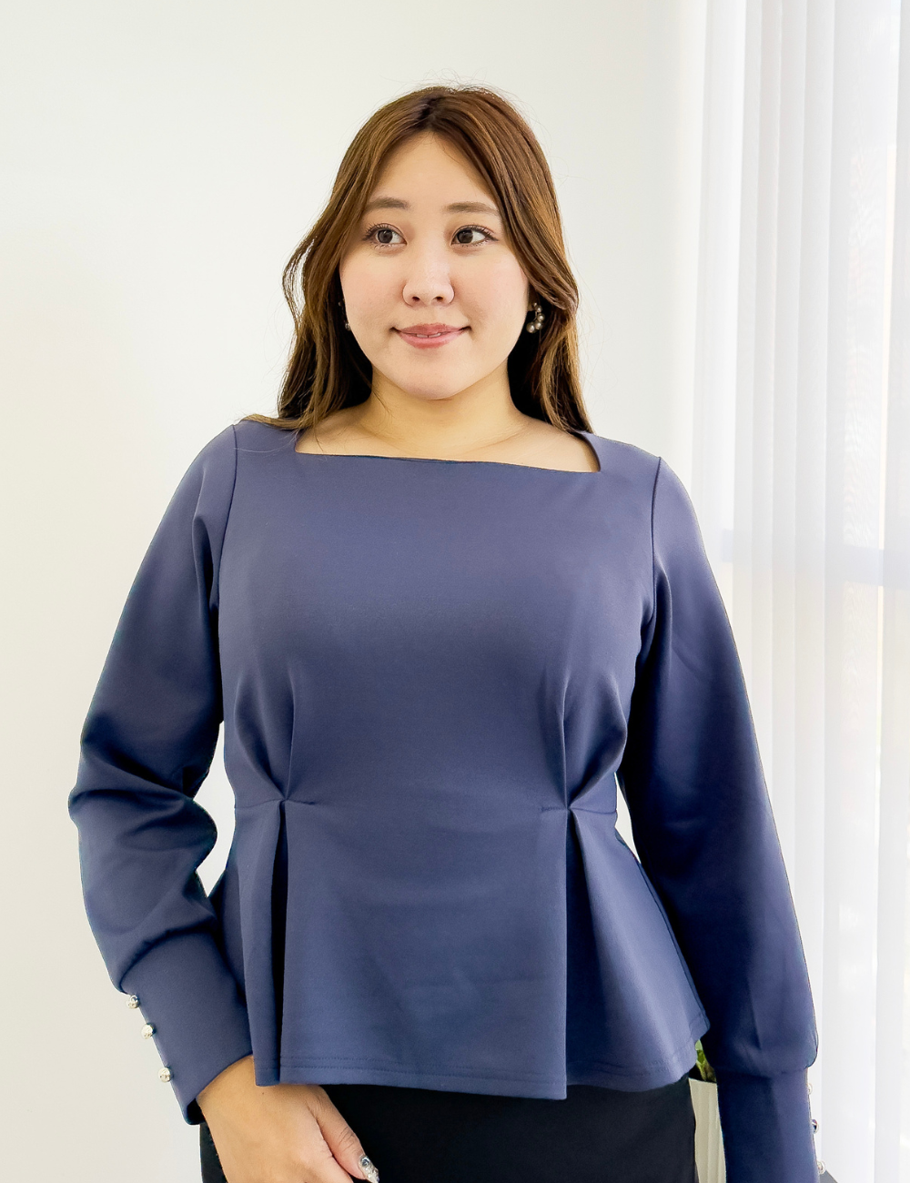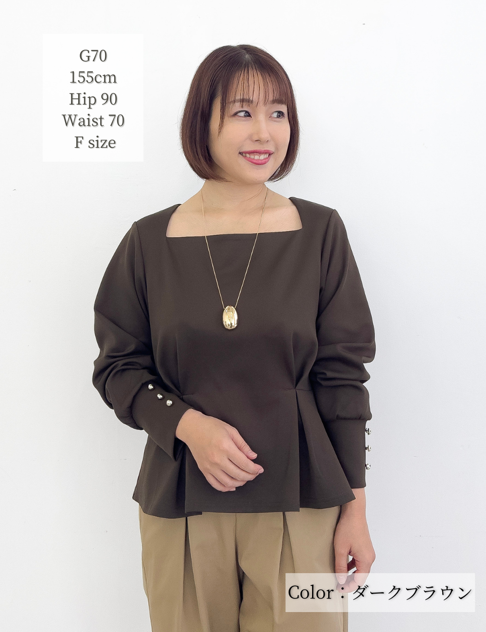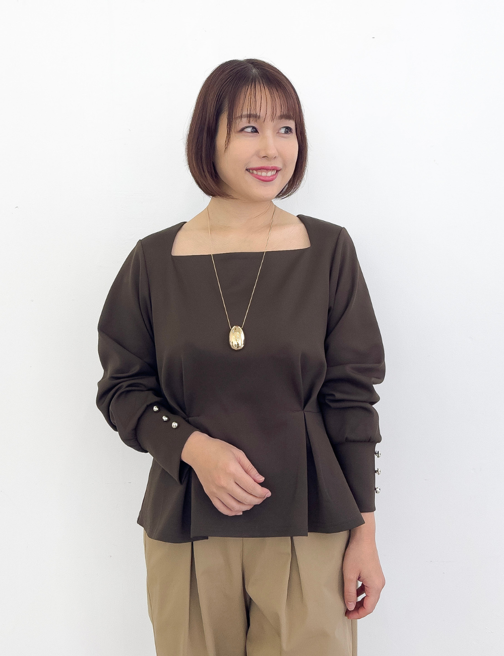 首の付け根から台形に広がる、オリジナルのスクエアネックが首を長く見せてくれるトップス。また、顔まわりをすっきりと見せてくれます。