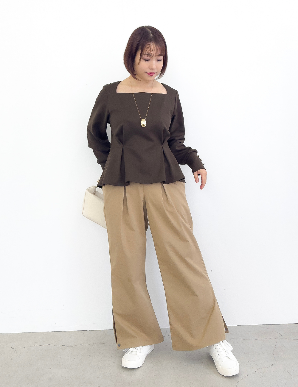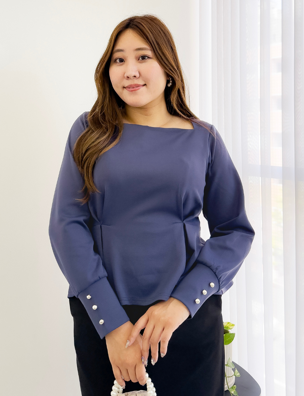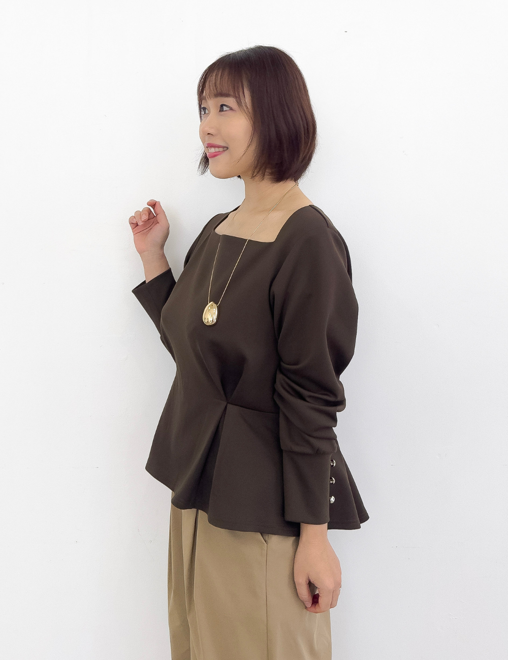 首の付け根から台形に広がる、オリジナルのスクエアネックが首を長く見せてくれるトップス。また、顔まわりをすっきりと見せてくれます。