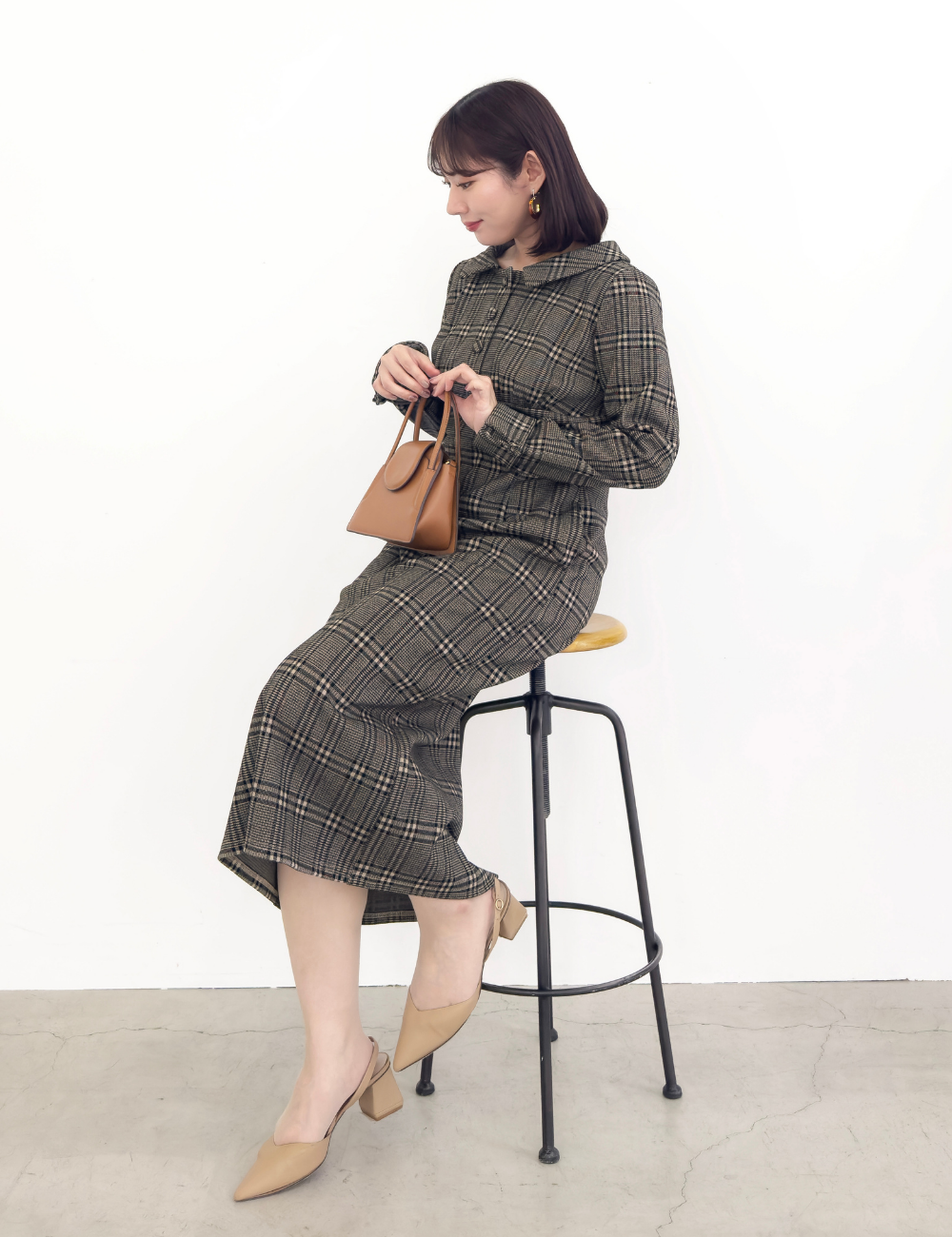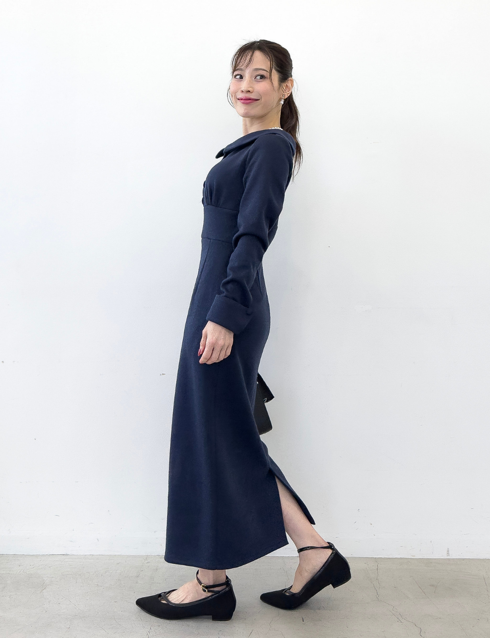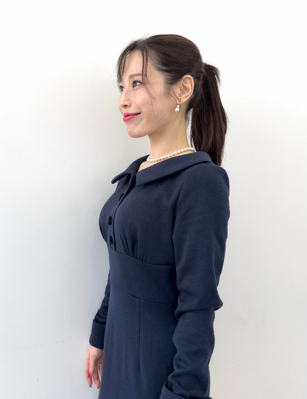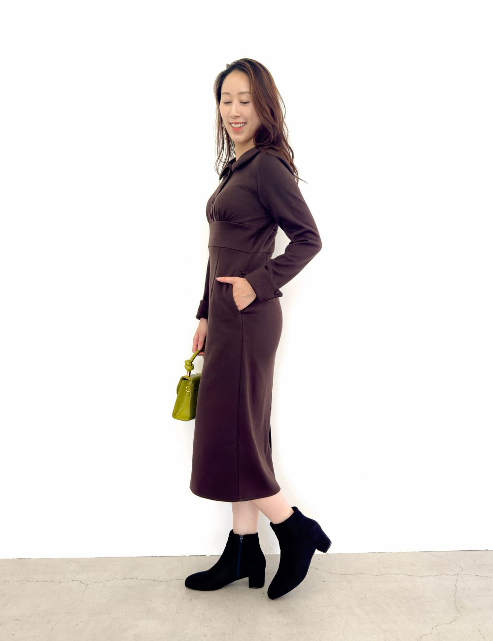 秋冬らしい落ち感のある素材でクラシカルな雰囲気に仕上げました。生地に厚みをある程度持たせることで、下着のラインも気になりにくい。