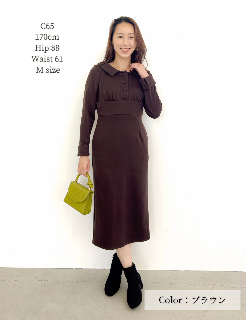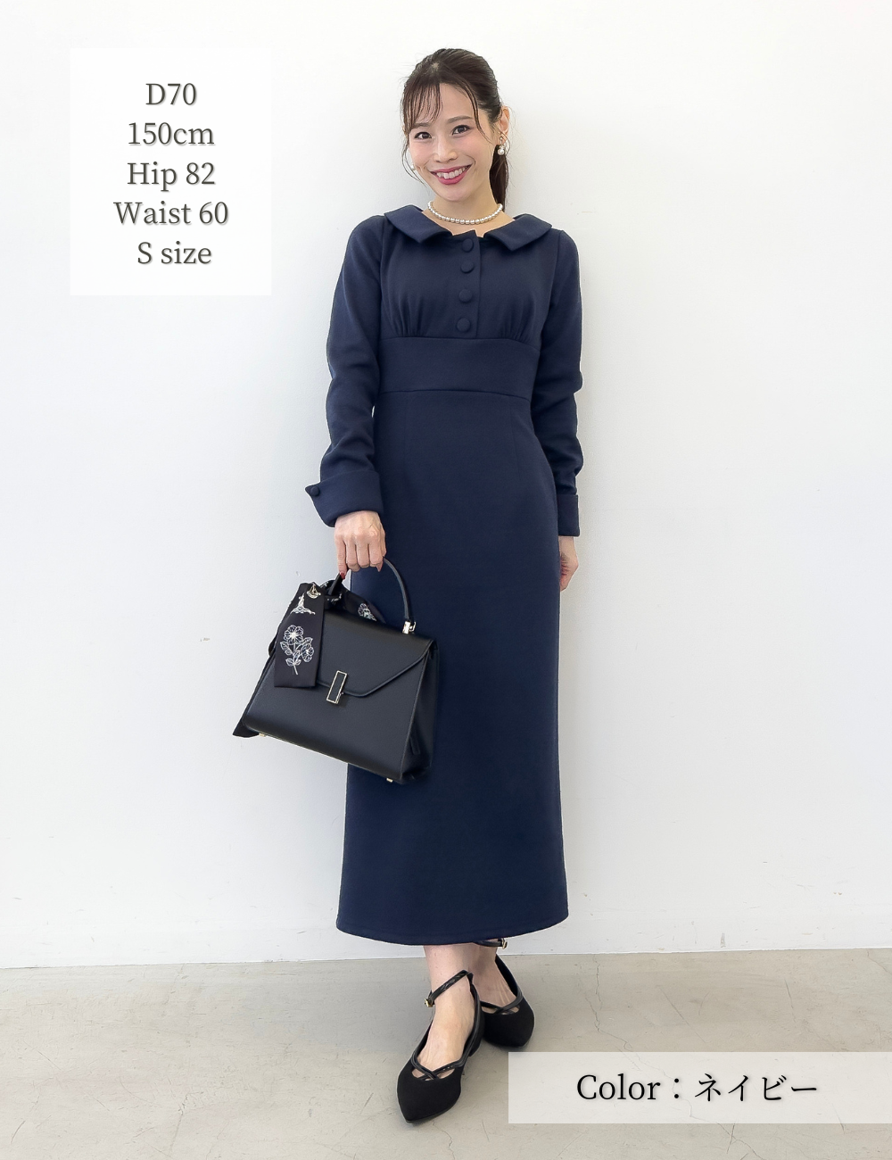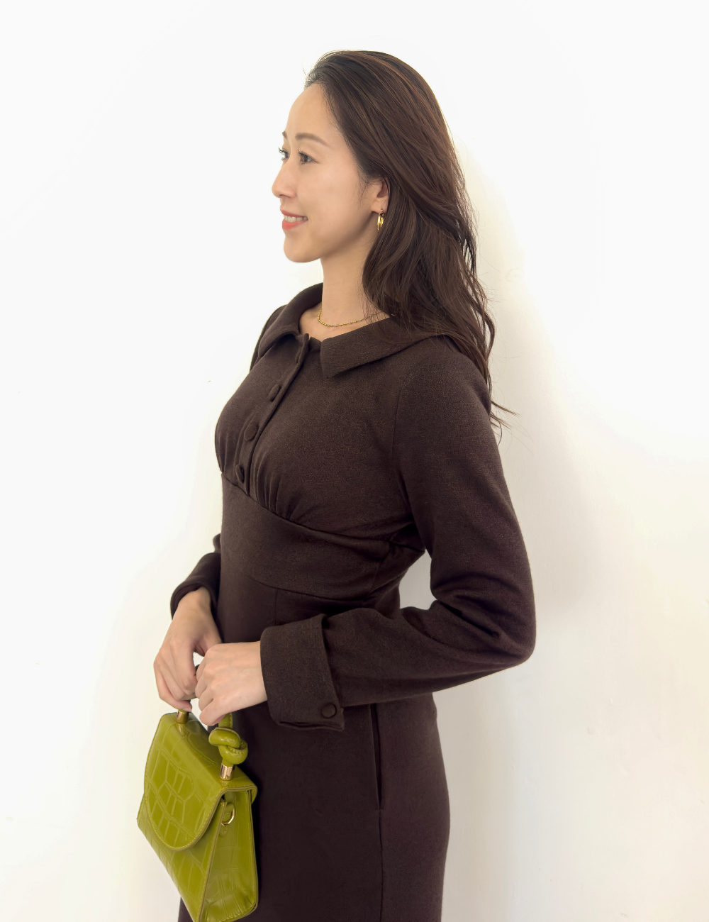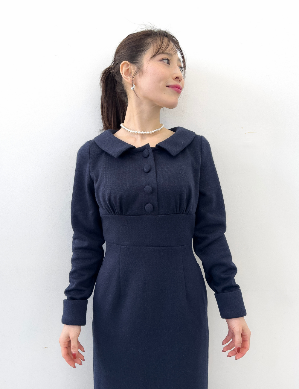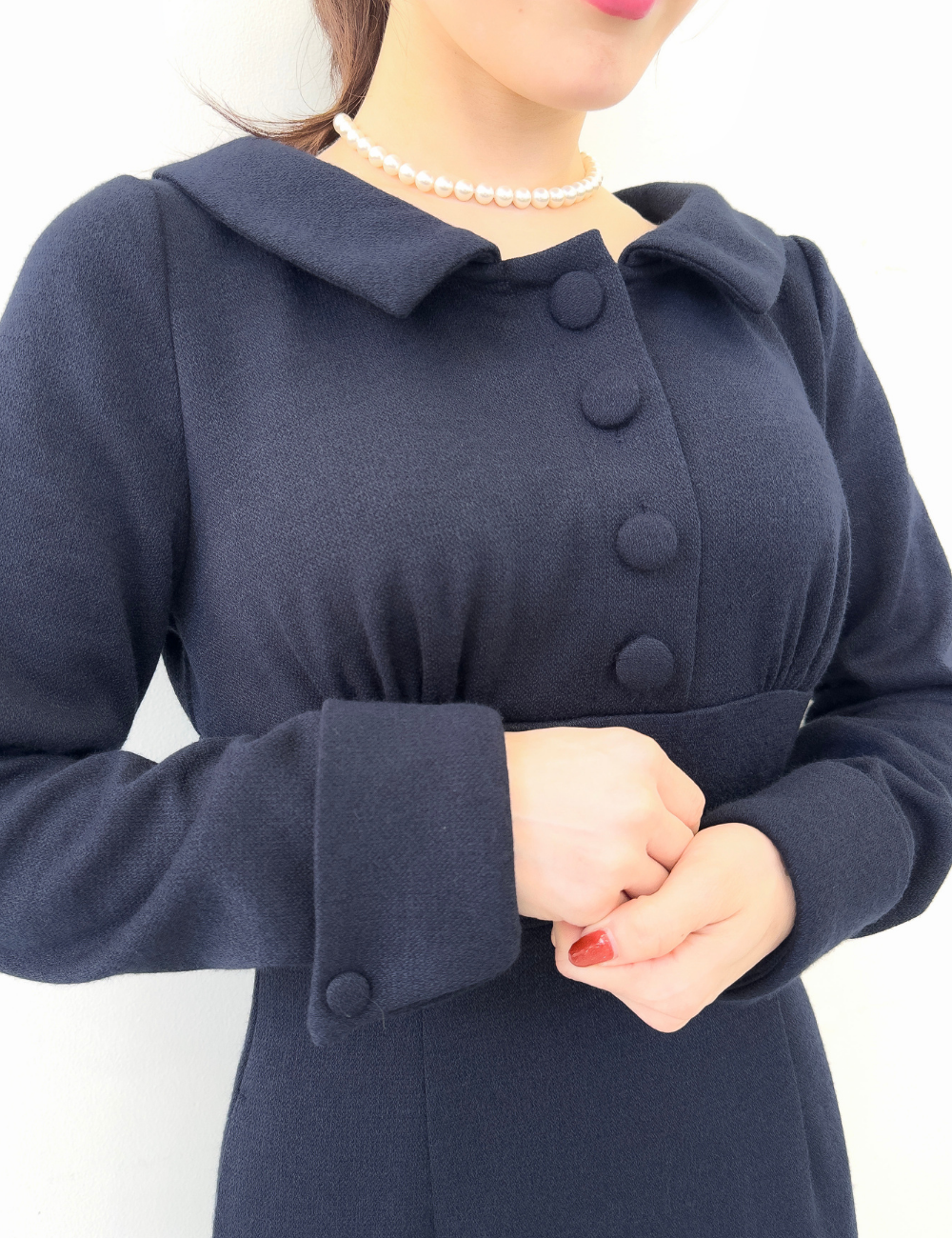袖口のカフスに並んだクルミボタンがクラシカルな可愛さを添え、バスト下からの切り替えでスタイルアップを叶えます。