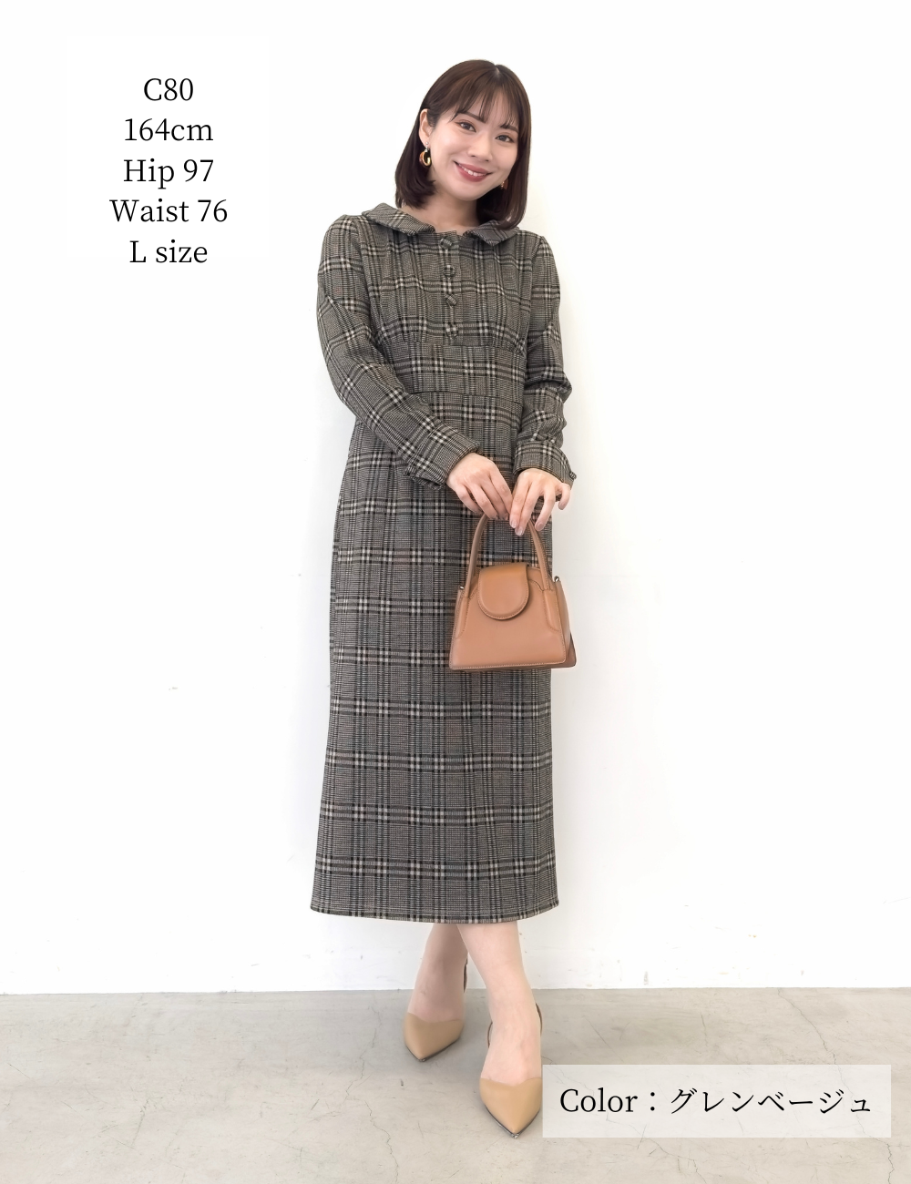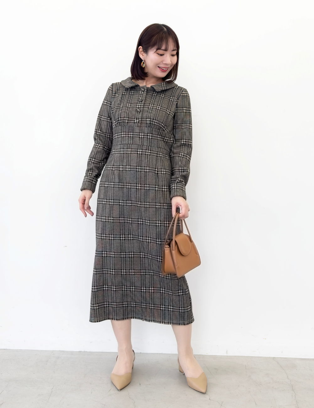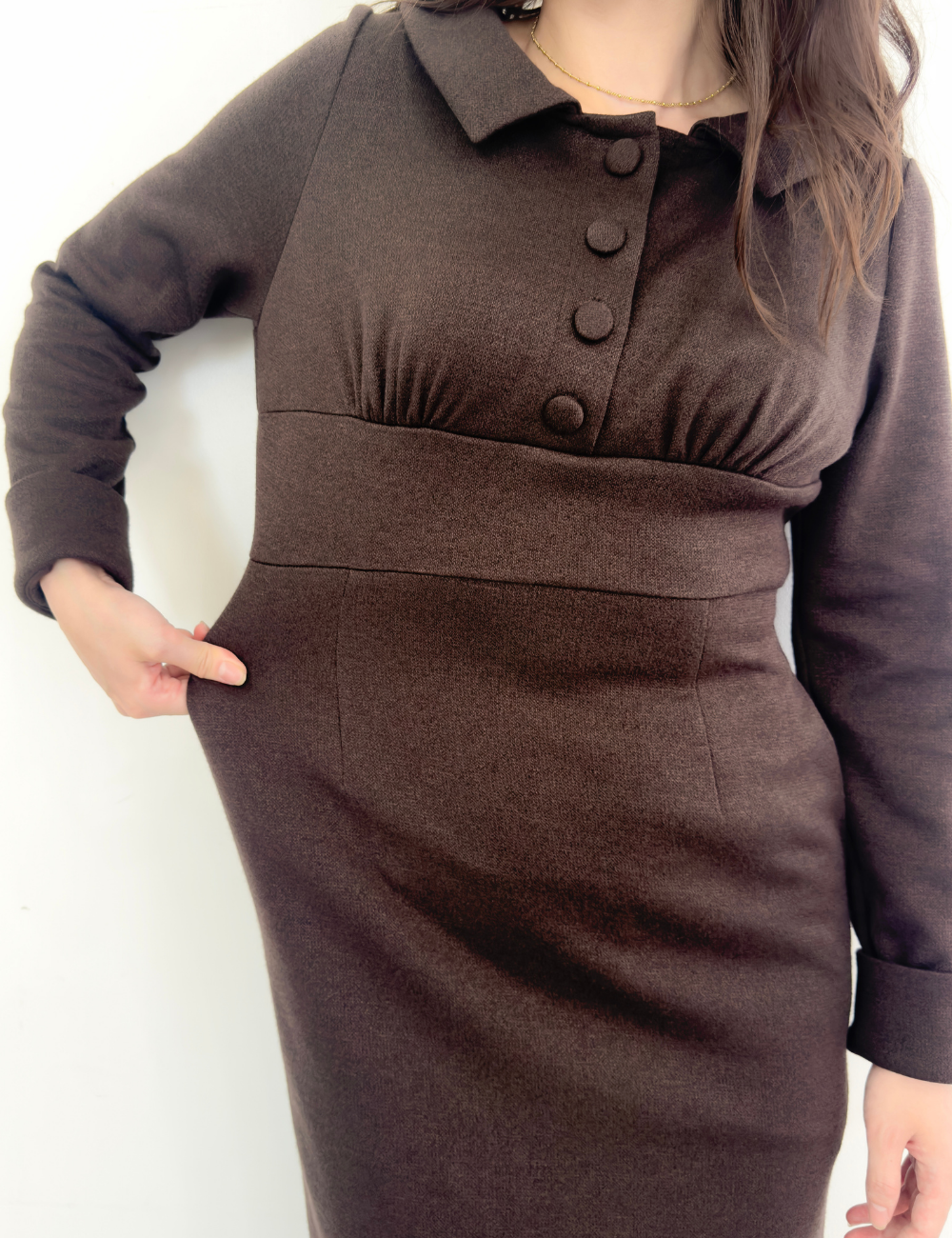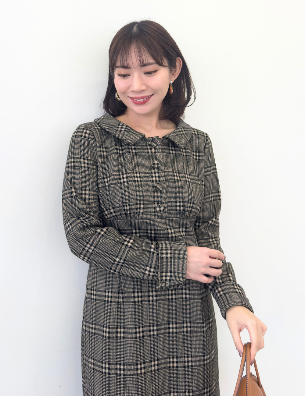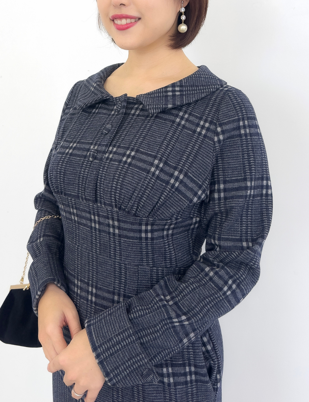 袖口のカフスに並んだクルミボタンがクラシカルな可愛さを添え、バスト下からの切り替えでスタイルアップを叶えます。