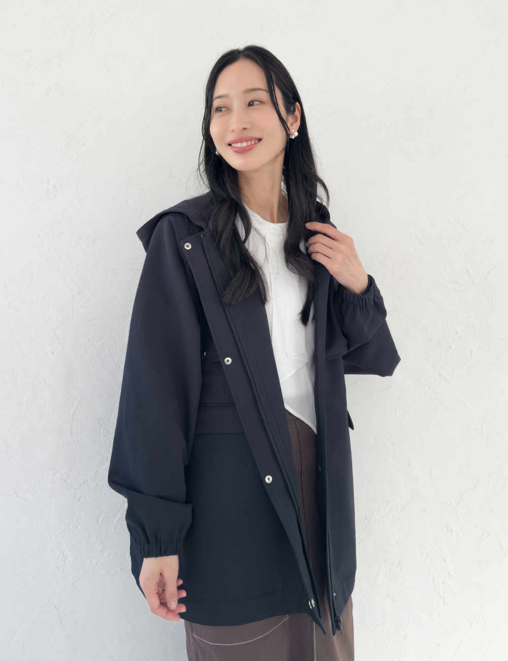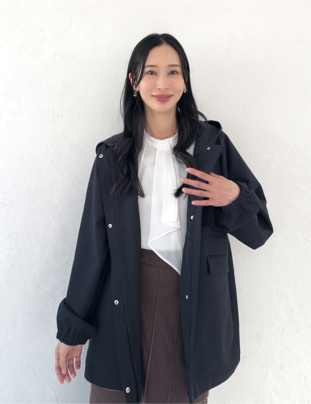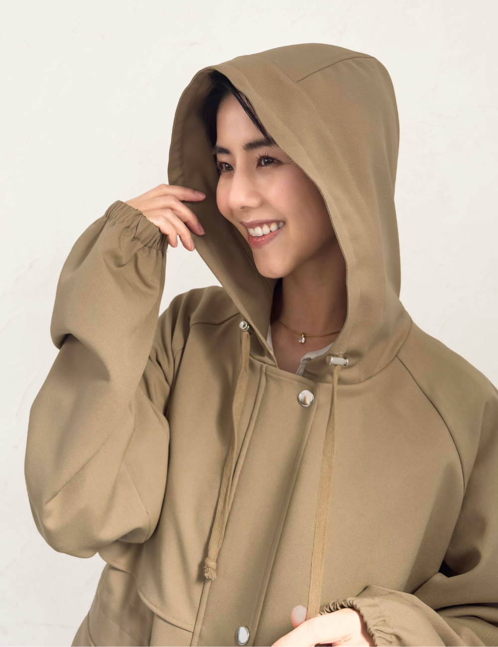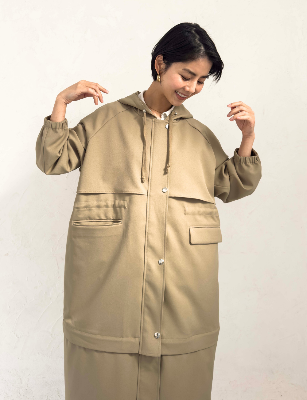 梅雨時期や突然の雨はもちろん、制電生地だから嫌な埃や花粉が付きにくい。季節を問わずアウターとしてデイリーにお使いいただけます。