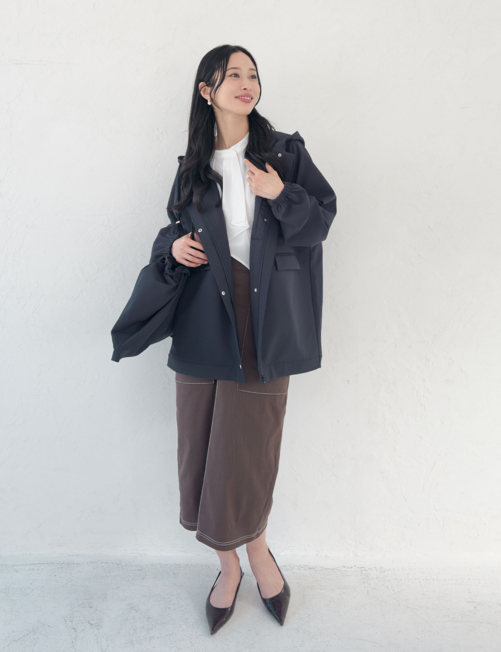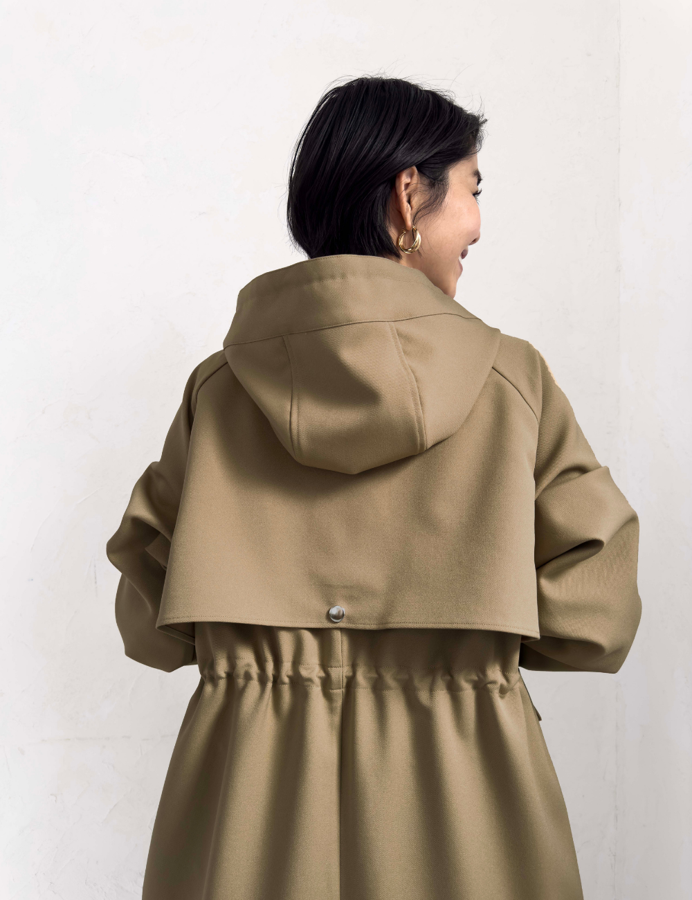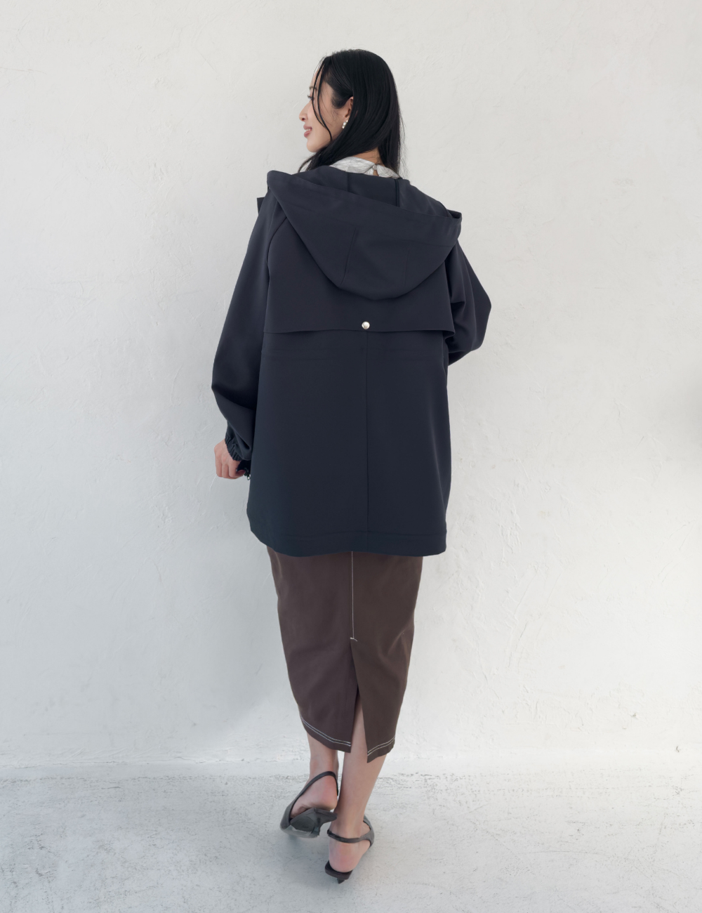 梅雨時期や突然の雨はもちろん、制電生地だから嫌な埃や花粉が付きにくい。季節を問わずアウターとしてデイリーにお使いいただけます。
