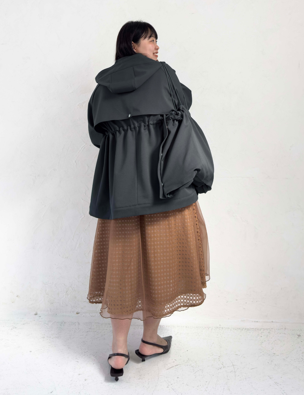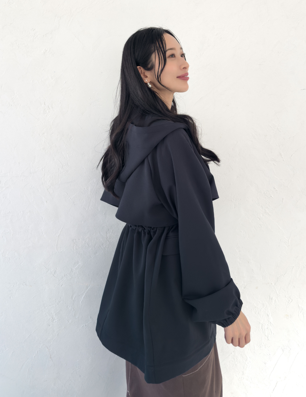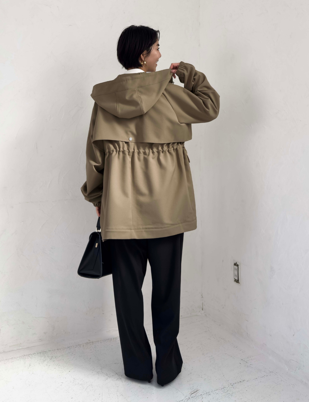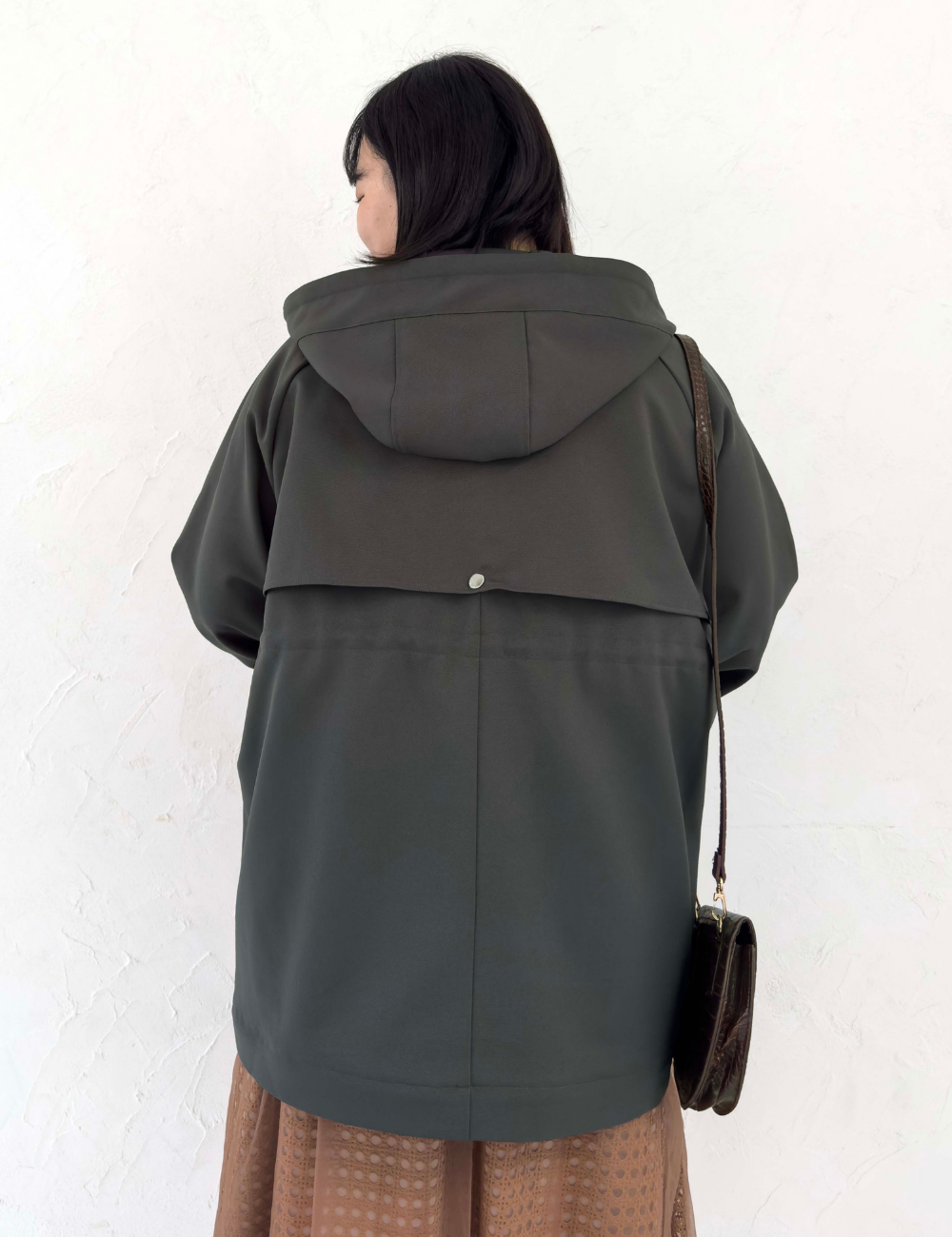 フード付きなので急な雨にも対応でき、フード口にはドローストリングを施し、フィット感の調整も可能。