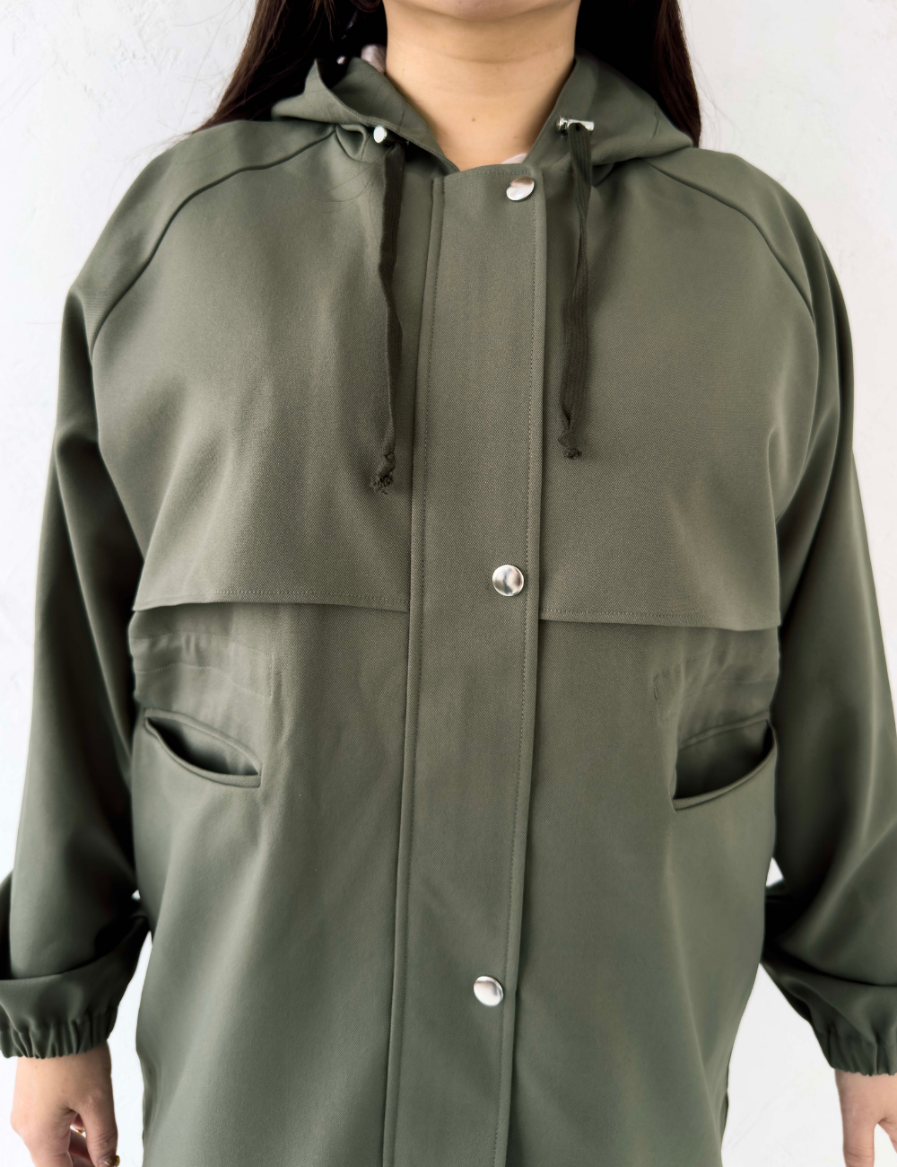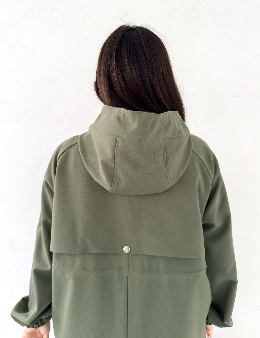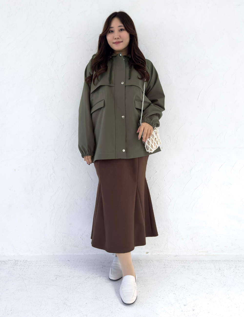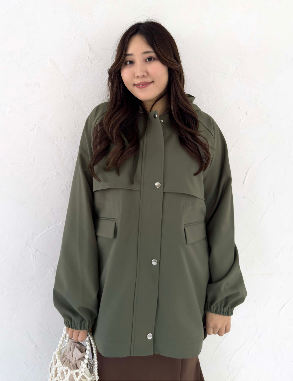 フード付きなので急な雨にも対応でき、フード口にはドローストリングを施し、フィット感の調整も可能。