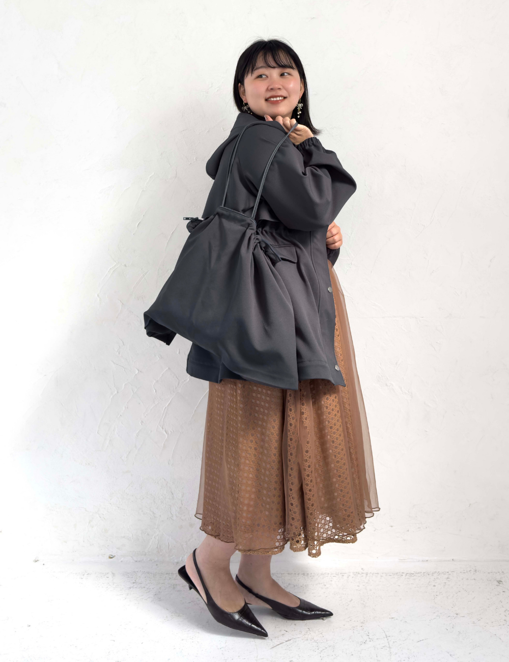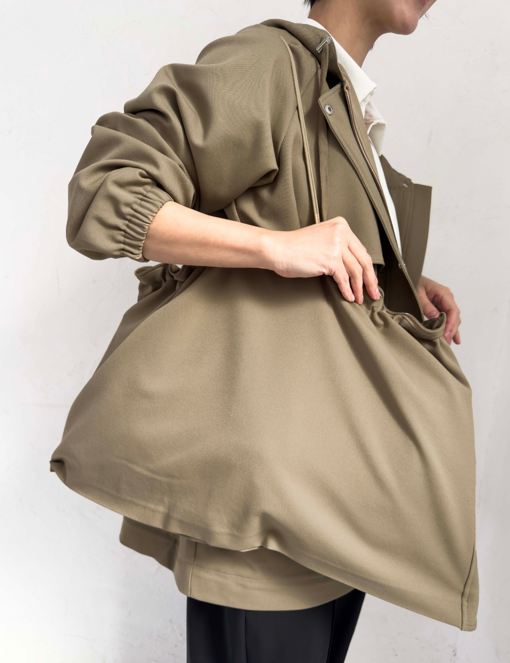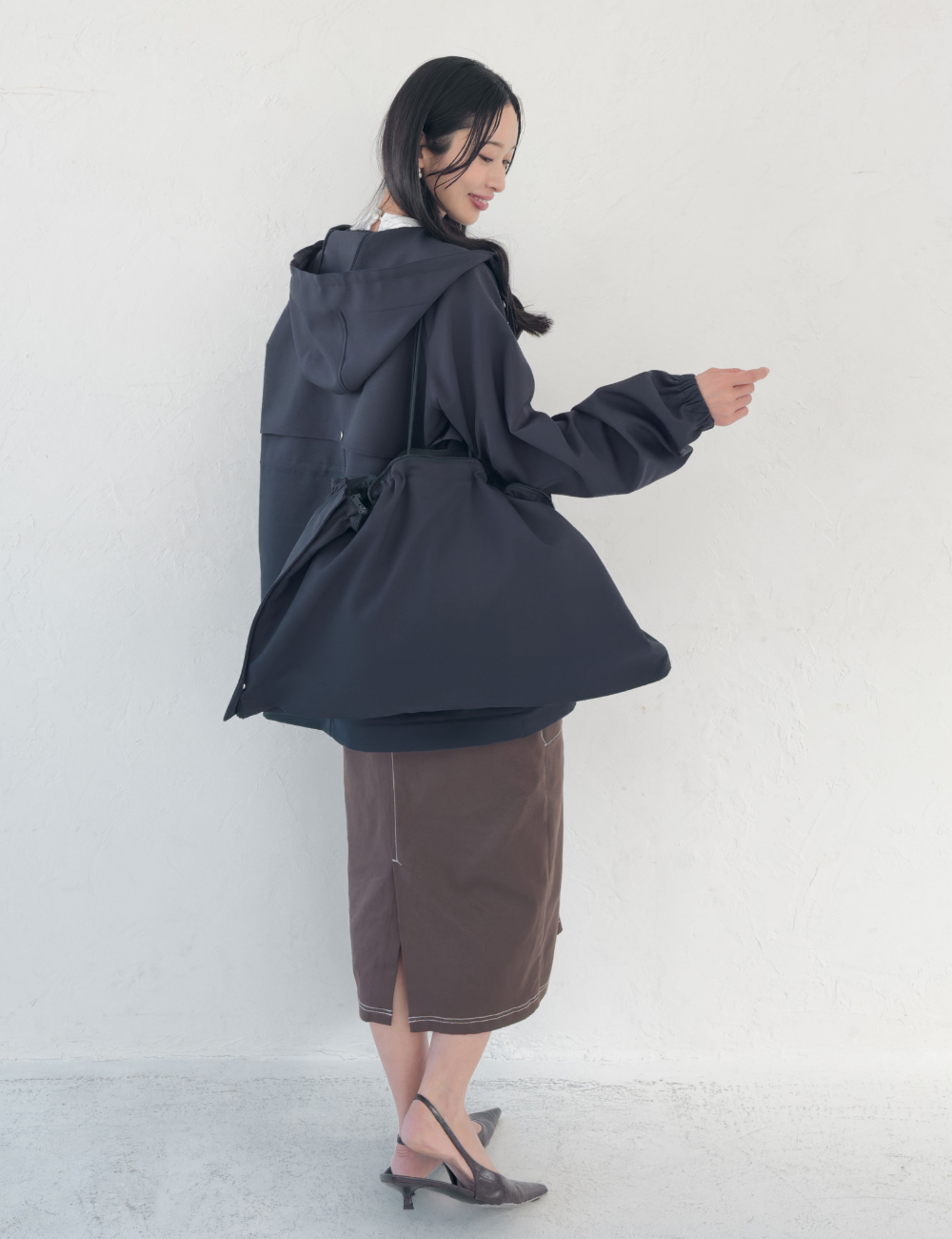 裾部分はファスナーで取り外しができ、外すことで大きめのバッグとして使える機能的なデザインになっています。