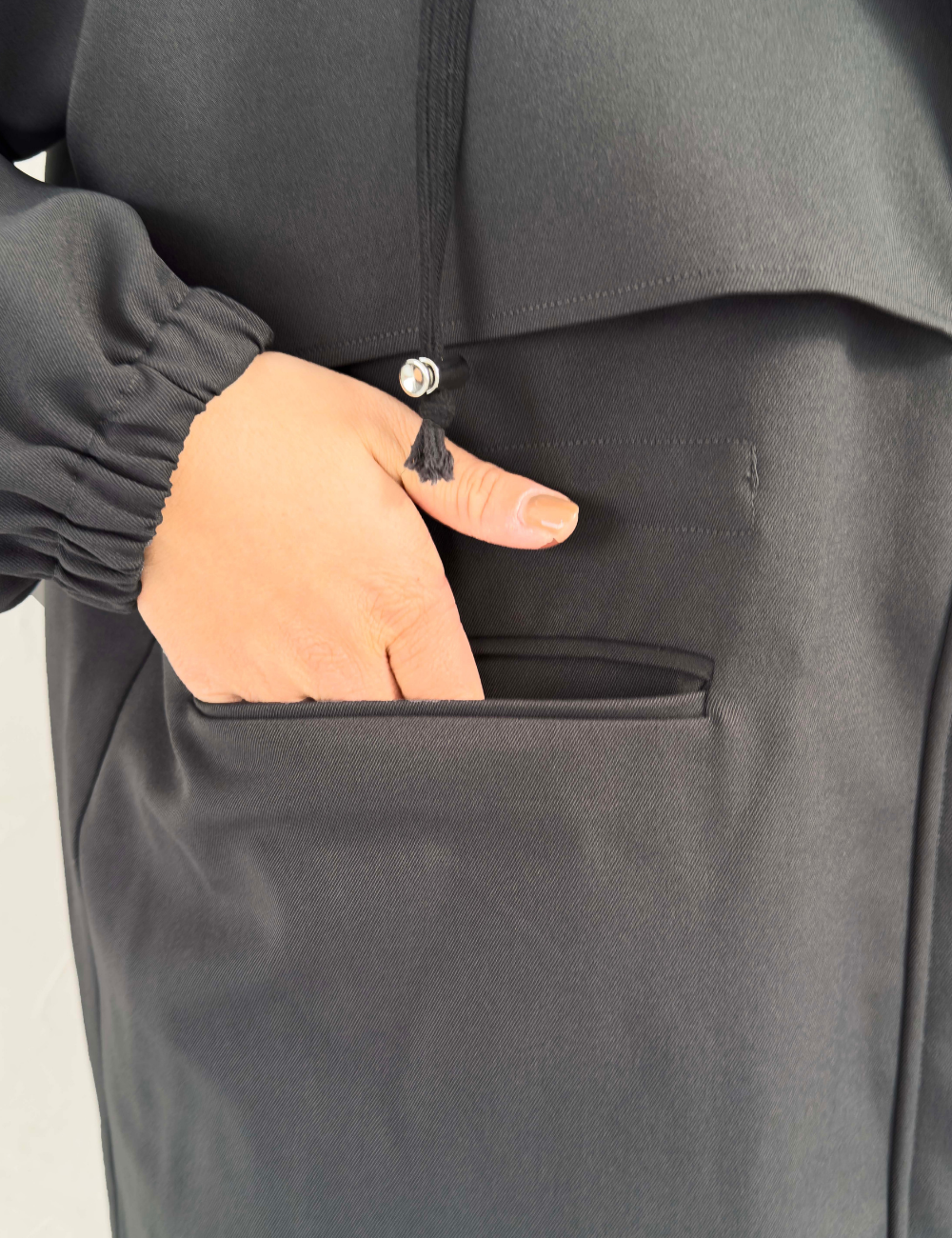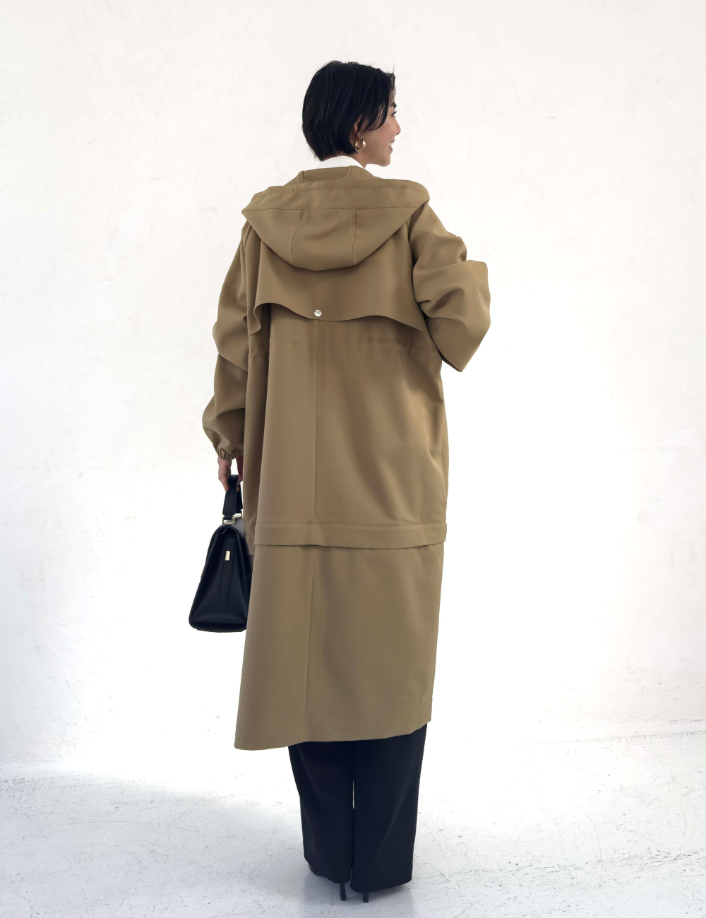 ロングコートの裾部分を切り離して丈調整が可能なだけでなく、切り離した裾は大きなバッグになる仕様!