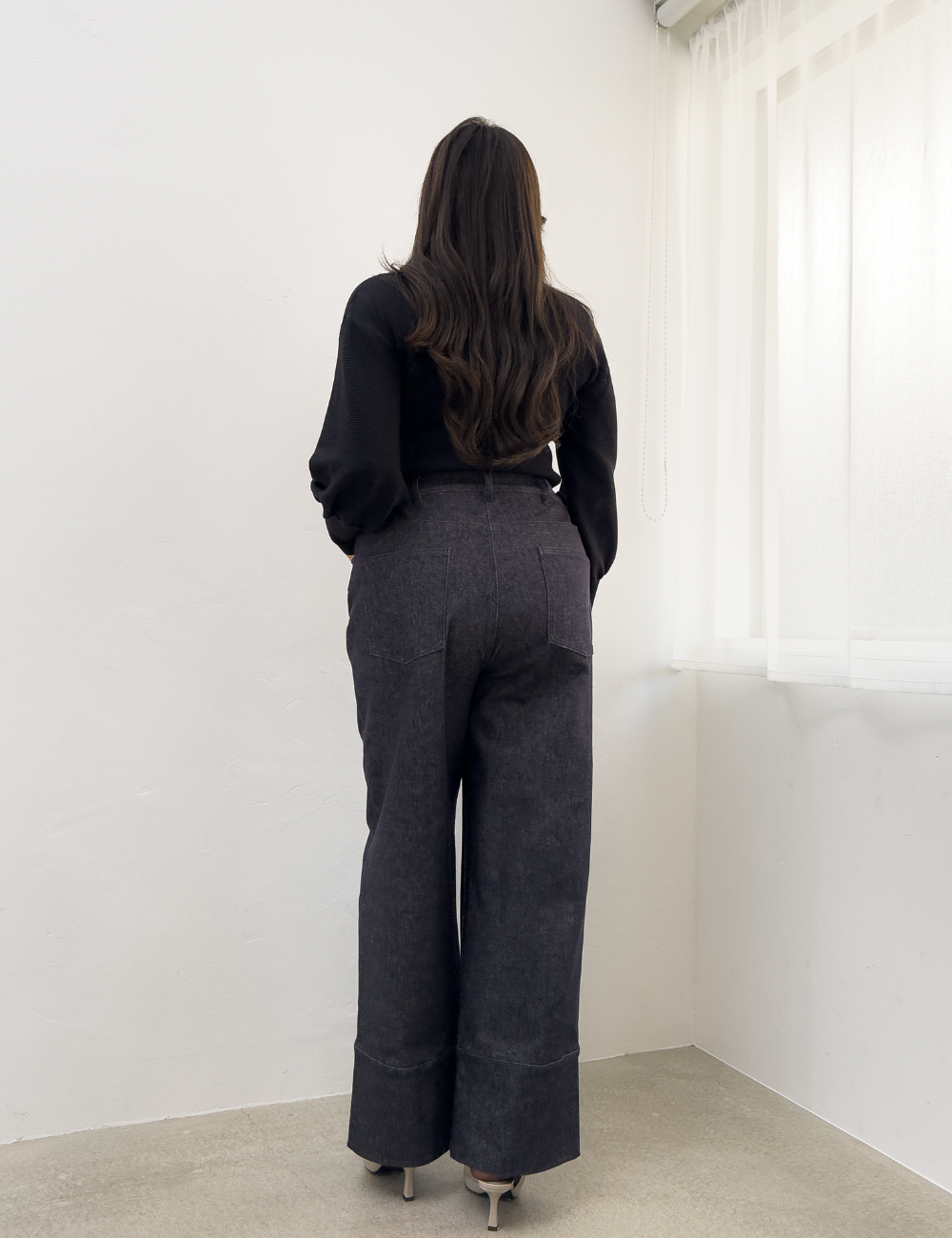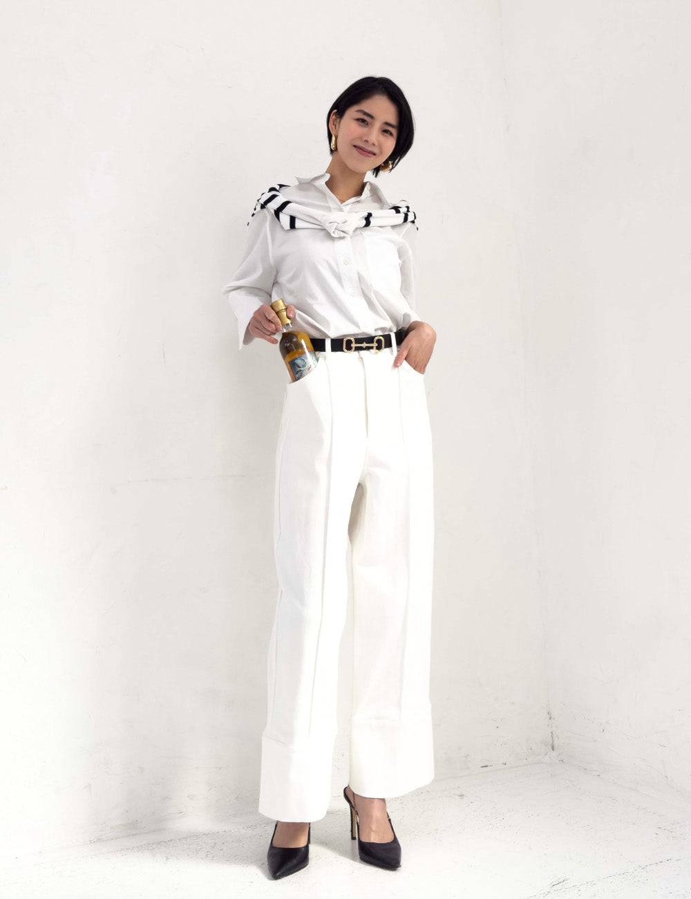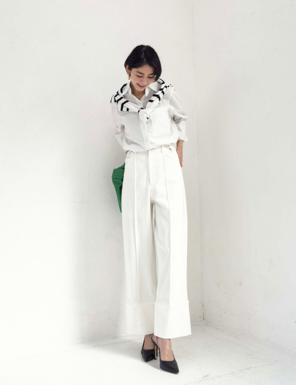 裾にはワイド幅の切り替えデザインを採用。程よい重みが生まれ、足もとにかけてまっすぐ落ちる美しいシルエットを演出します。