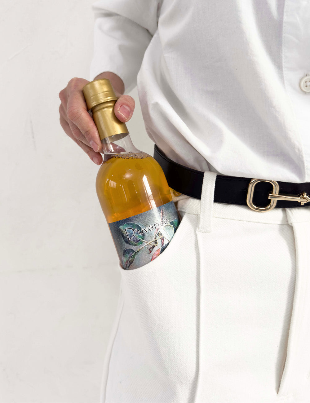 前開きファスナーとタックボタンを組み合わせた仕様にベルトループも備え、トップスをインしてもきちんとした印象に。