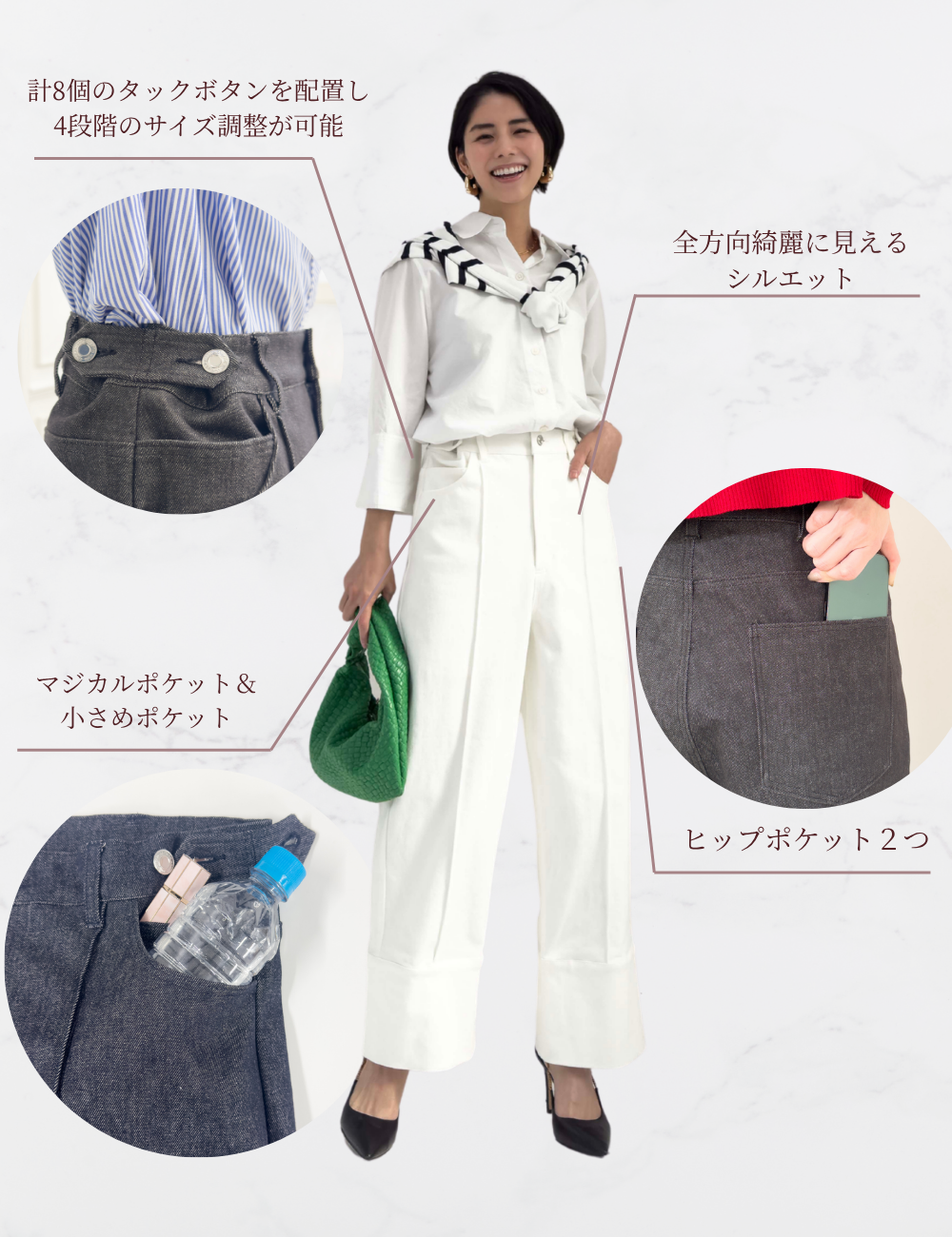 ウエストにはタックボタンを配置し、前後左右に計8個のボタンで4段階のサイズ調整が可能です。