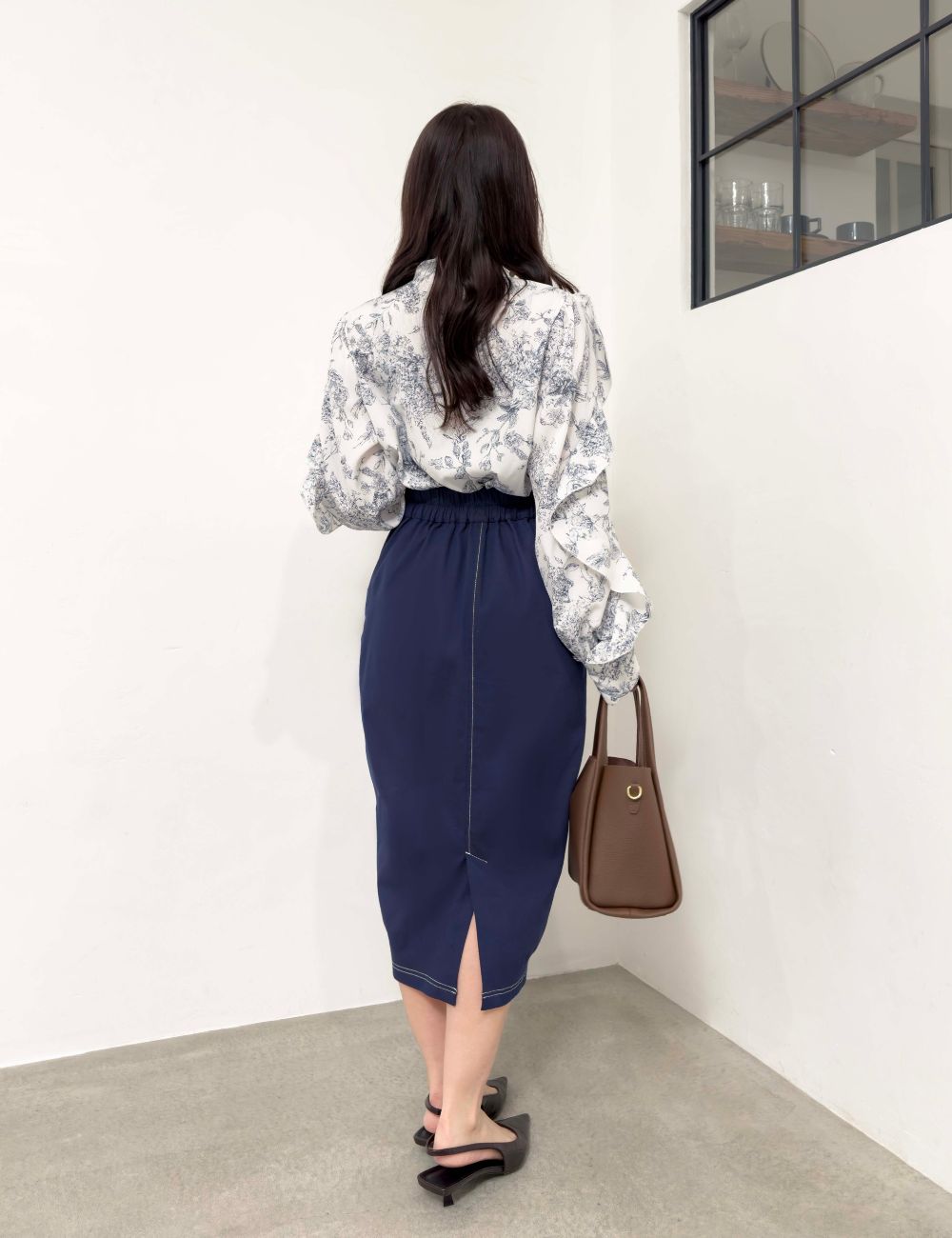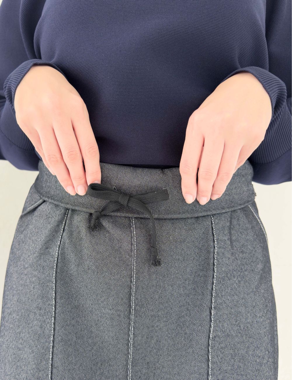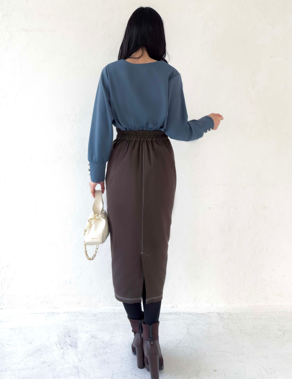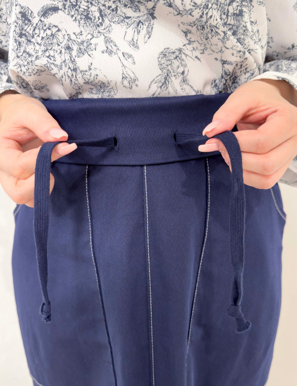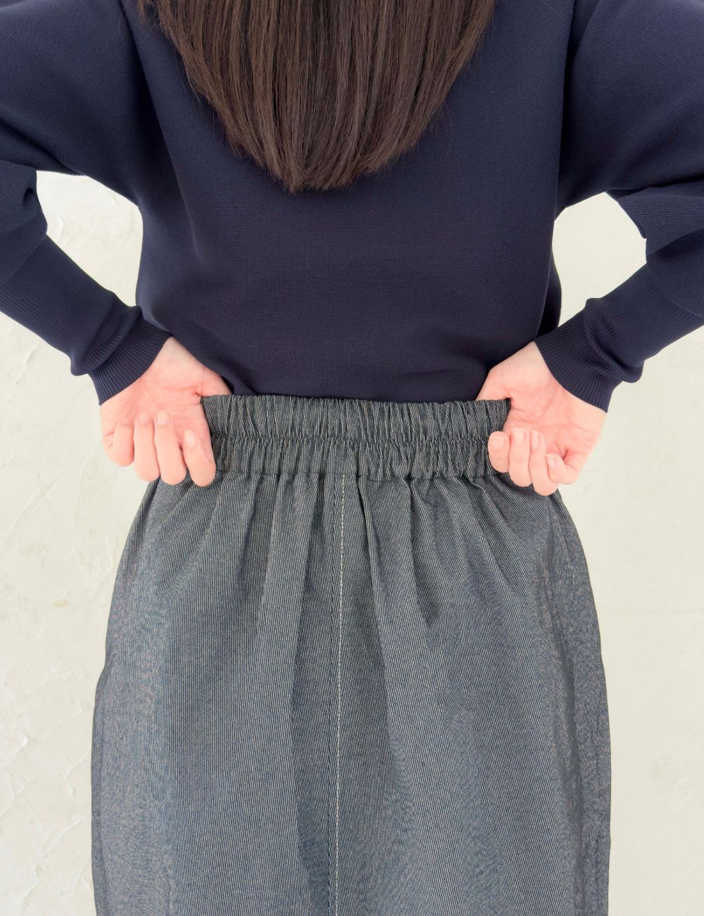 全周ウエストゴム仕様ながら、背面のみにギャザーを寄せることで正面はすっきり見え。