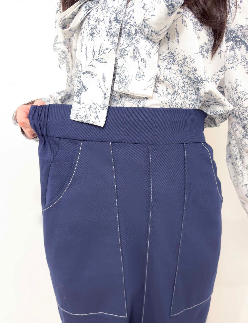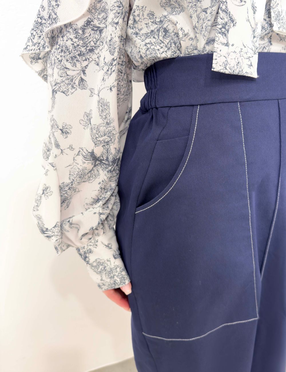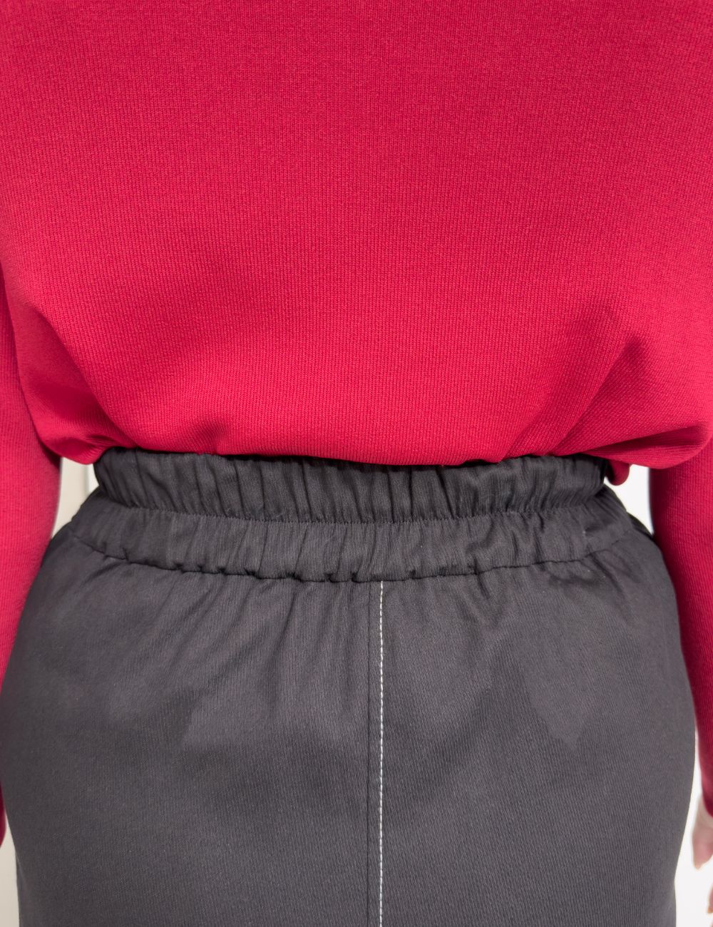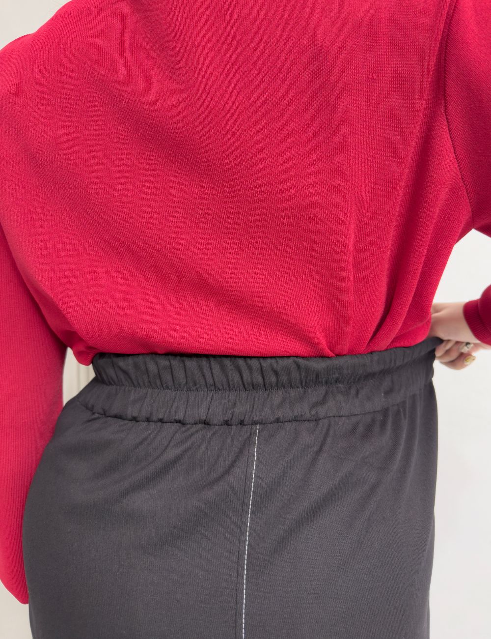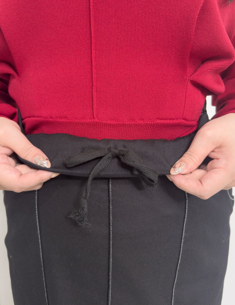 全周ウエストゴム仕様ながら、背面のみにギャザーを寄せることで正面はすっきり見え。