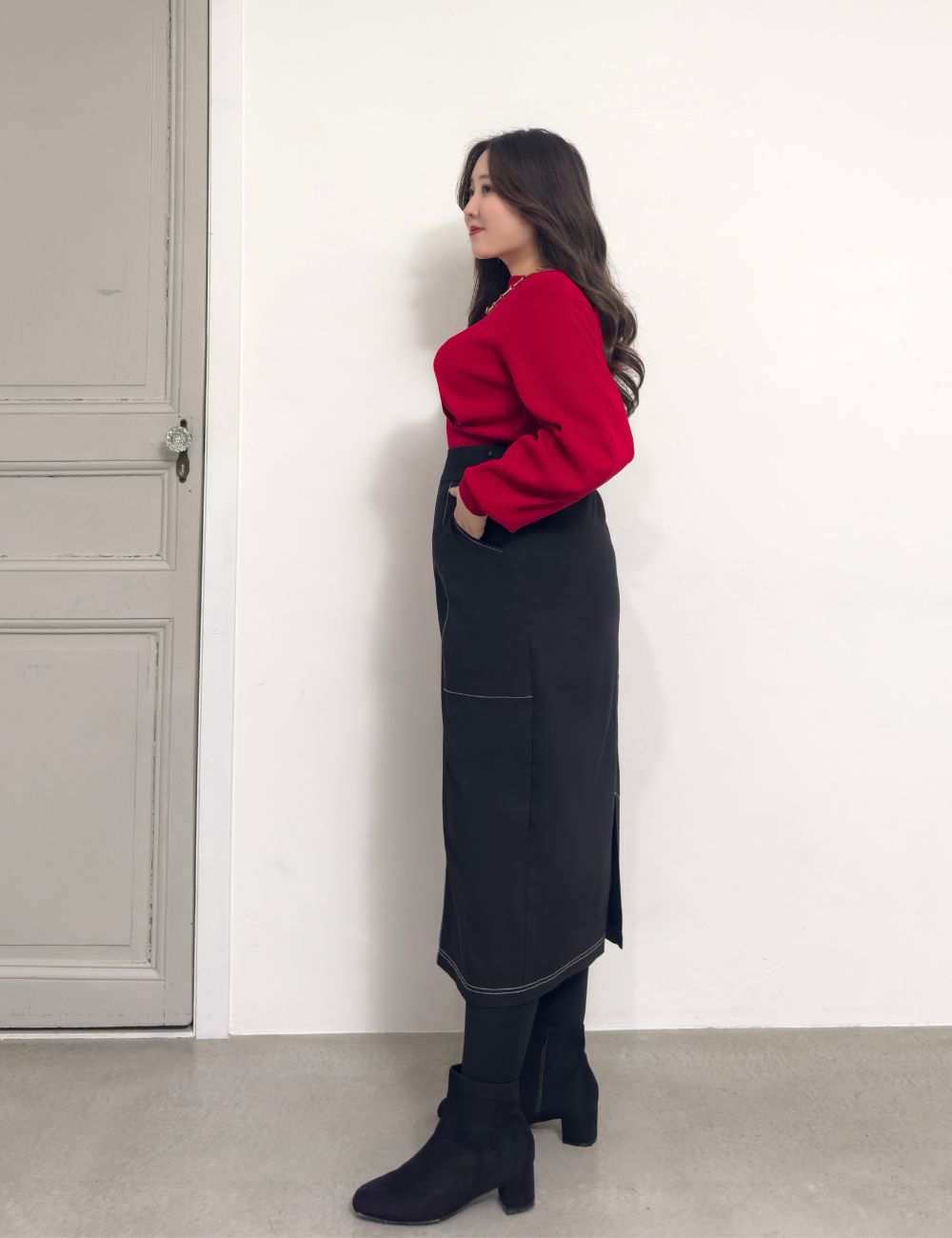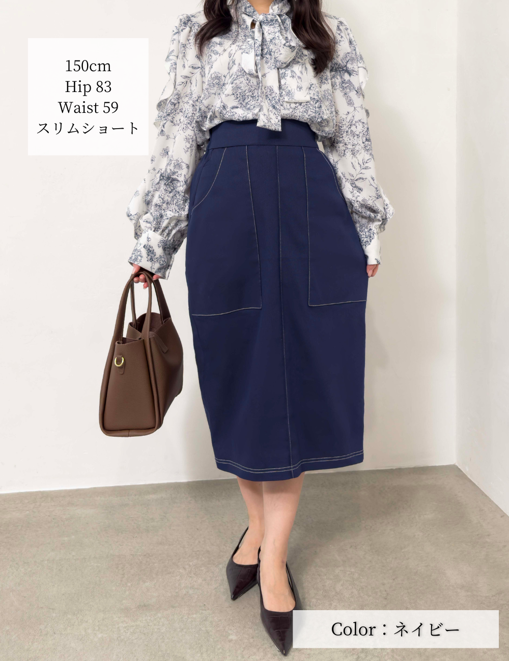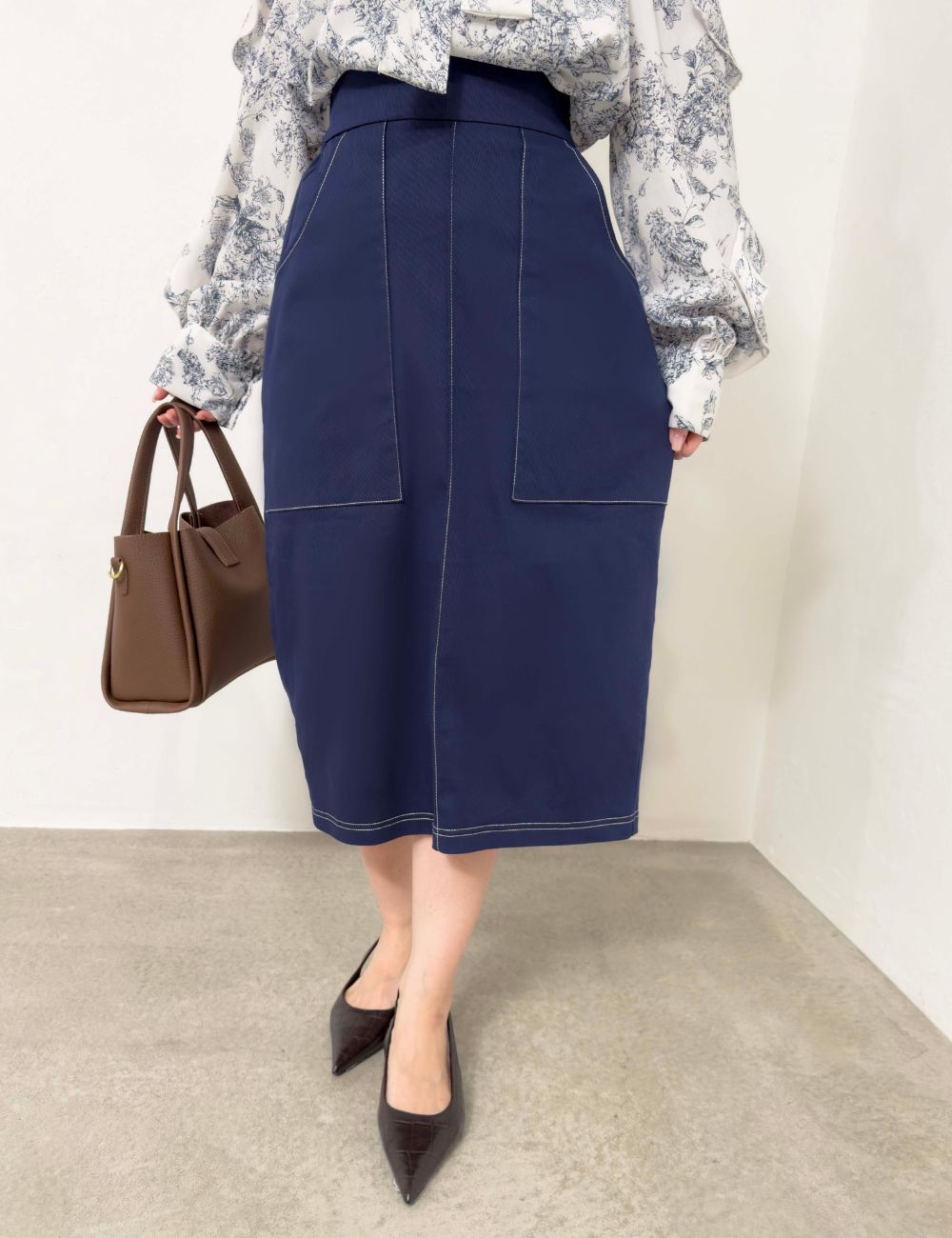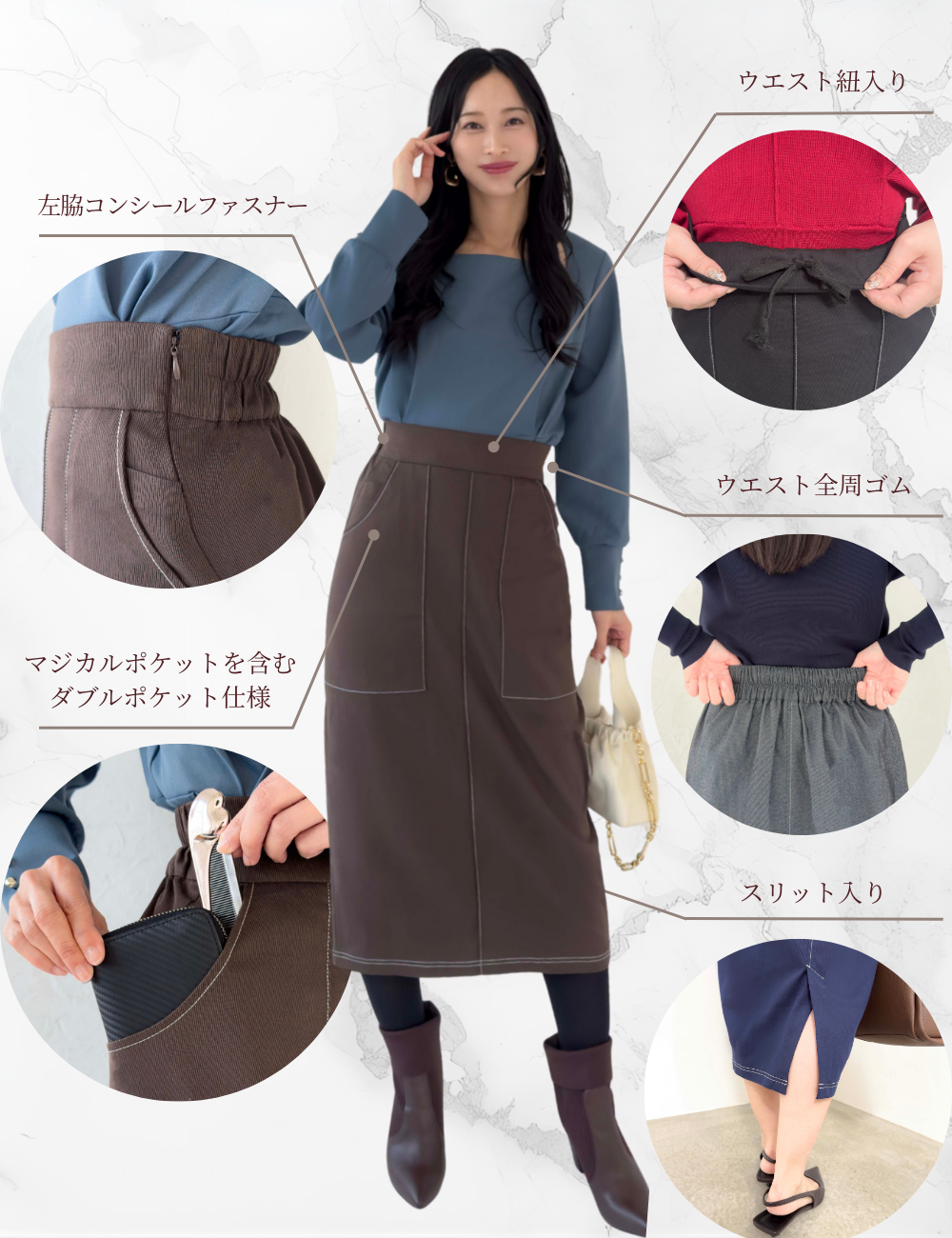 マジカルポケットの中にミニポケット入りだから、細かいものを取り出しやすい!センターラインやポケットにはステッチ入り。後ろスリット入りで動きやすい、足さばきが良い実用派です◎