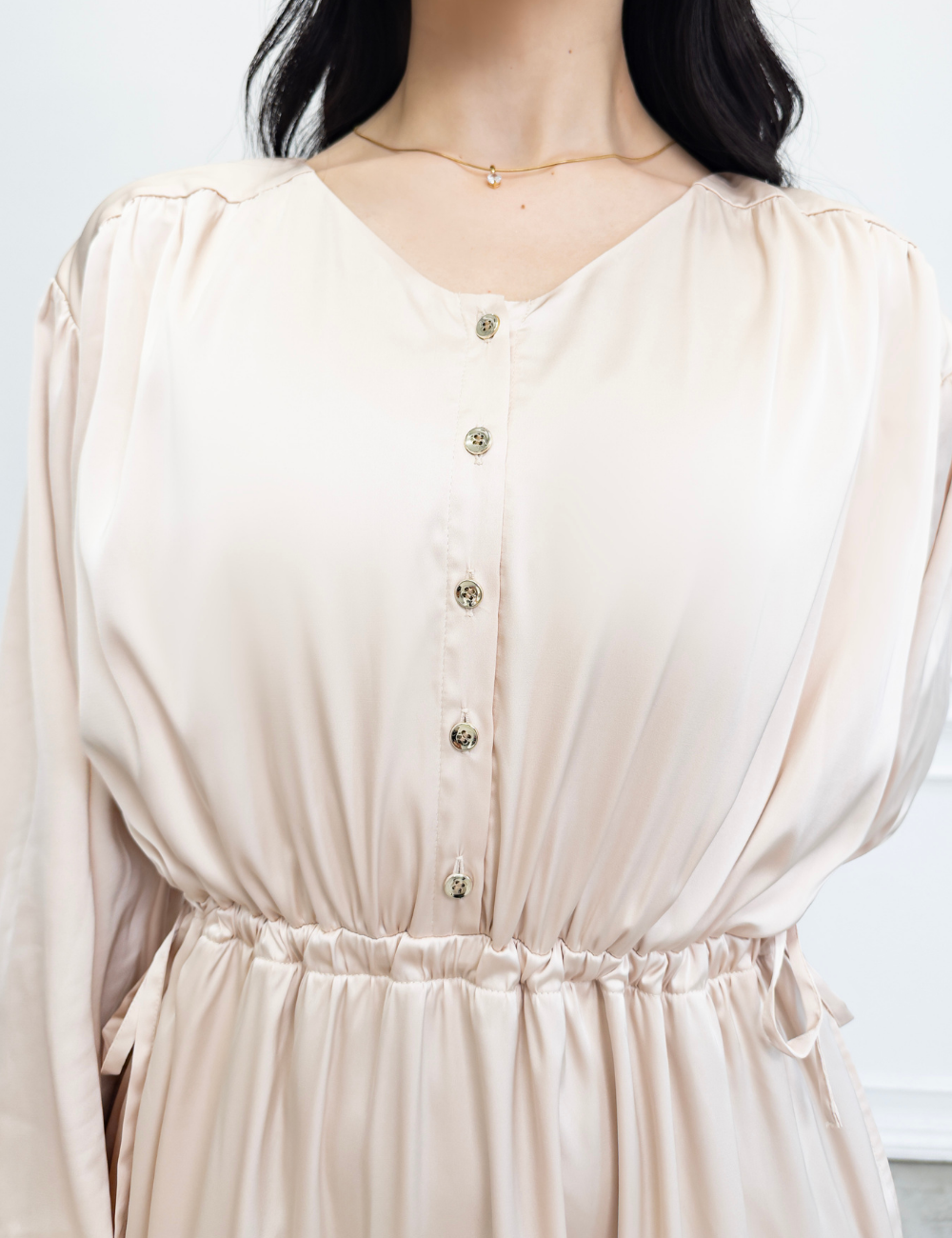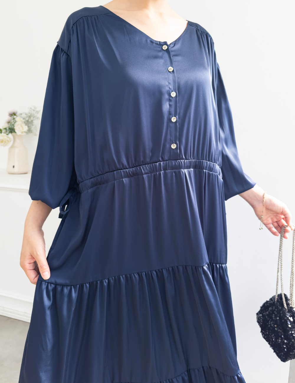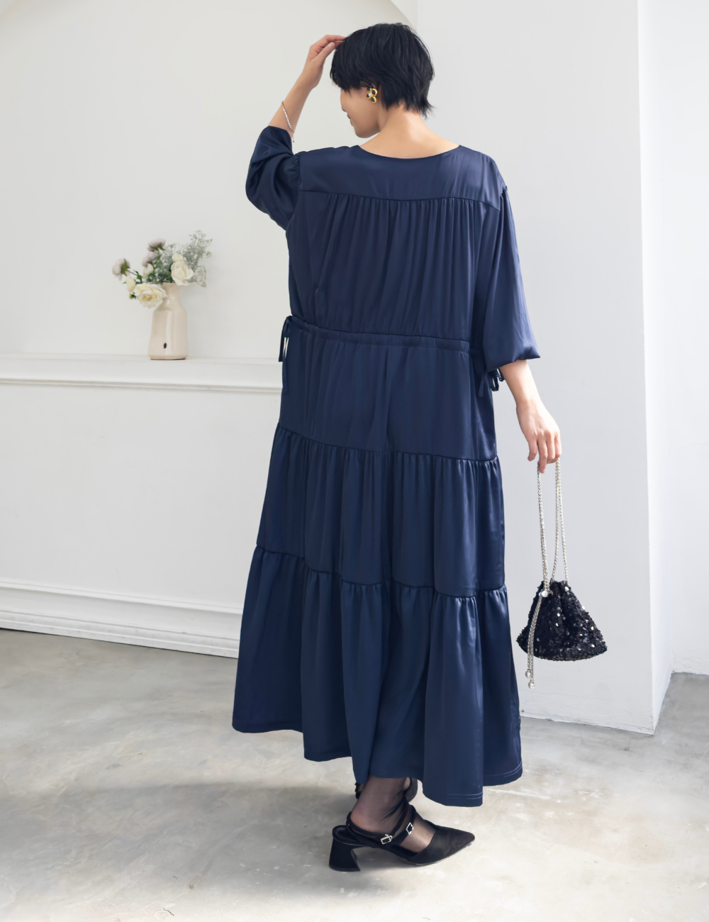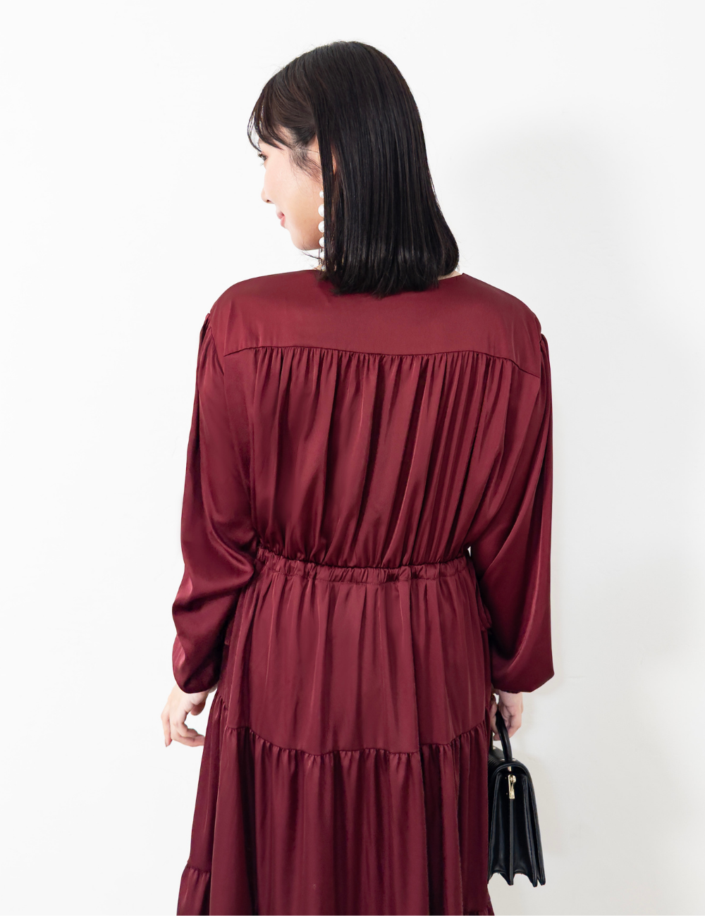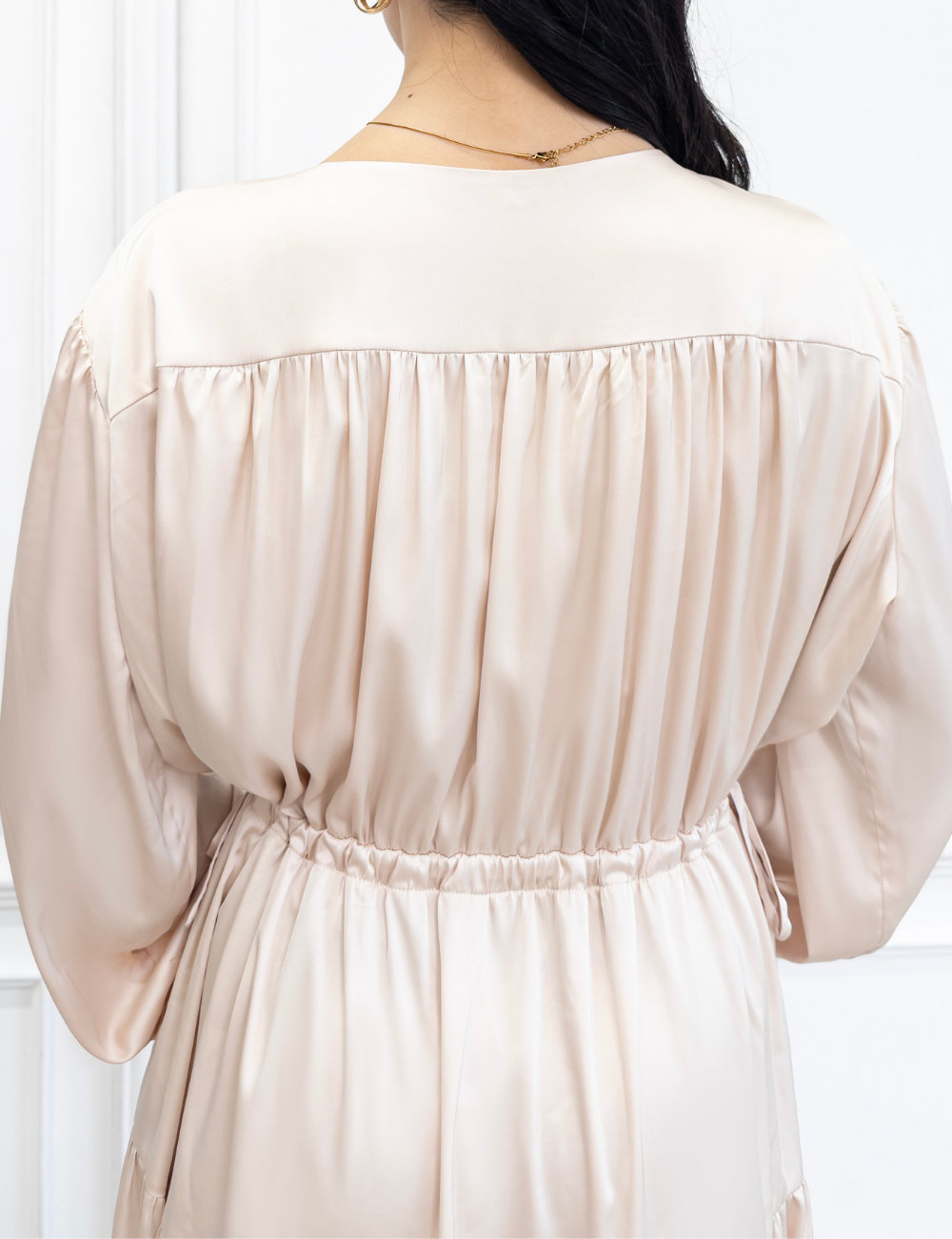 サテン風生地もたっぷり贅沢に使用。背中にもギャザーを贅沢に寄せて、下着のラインも目立ちにくくリッチ見えします。