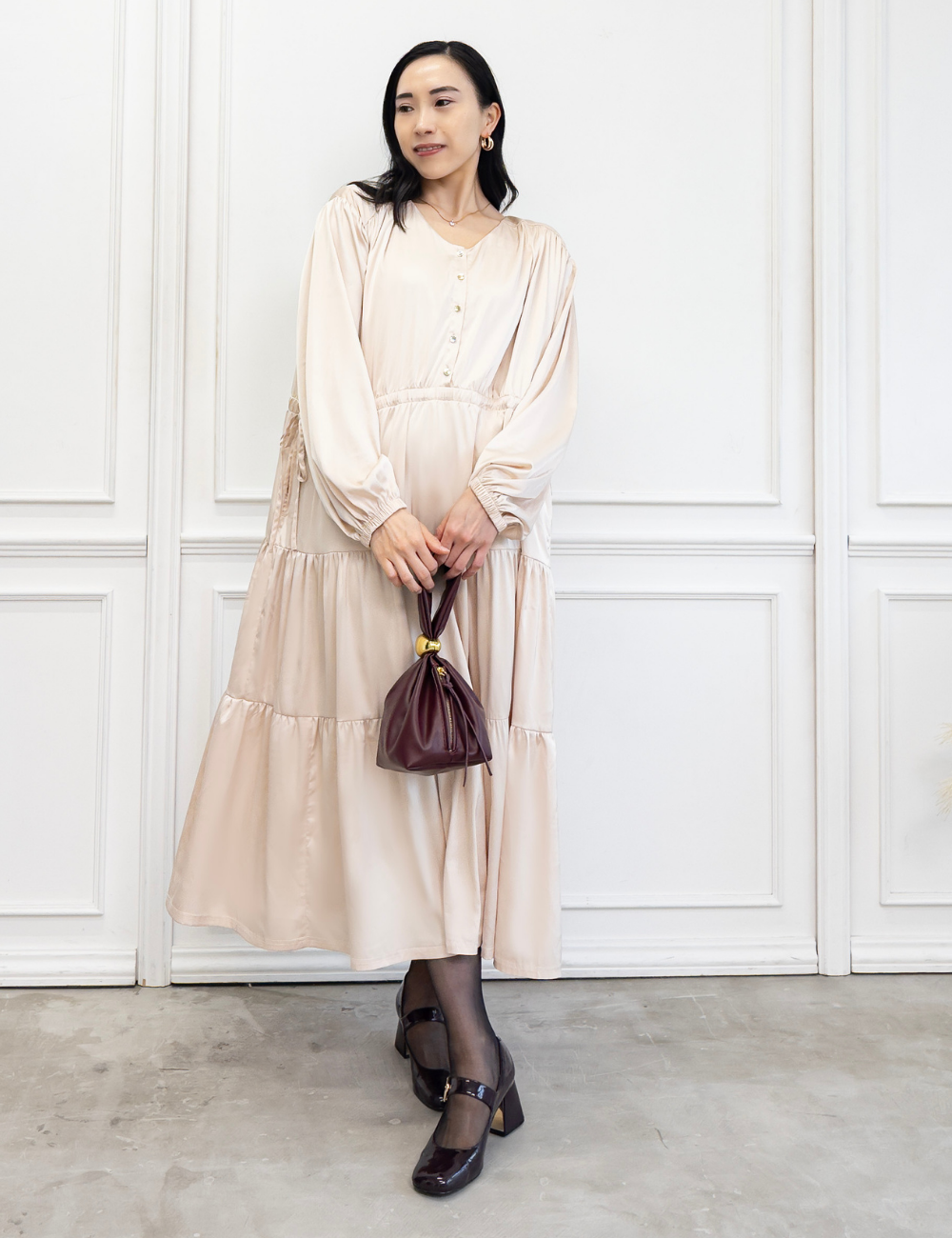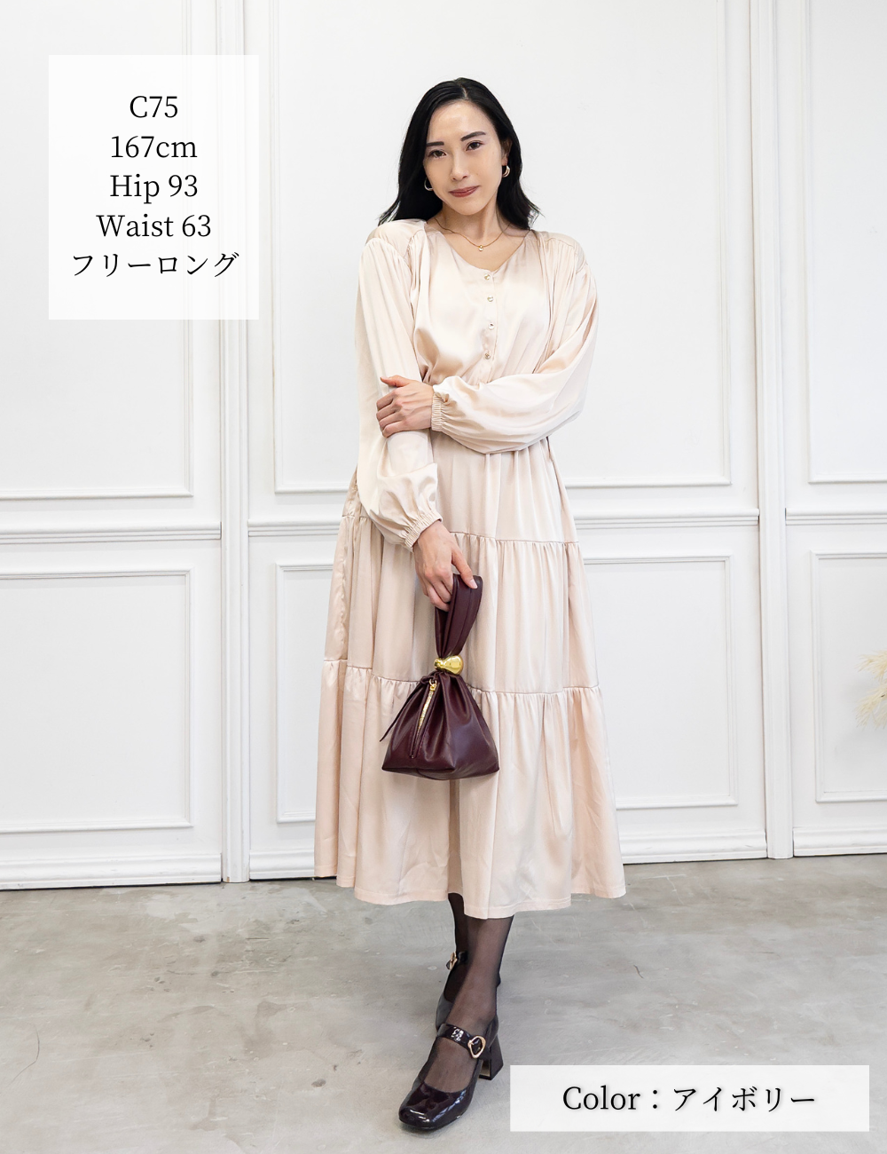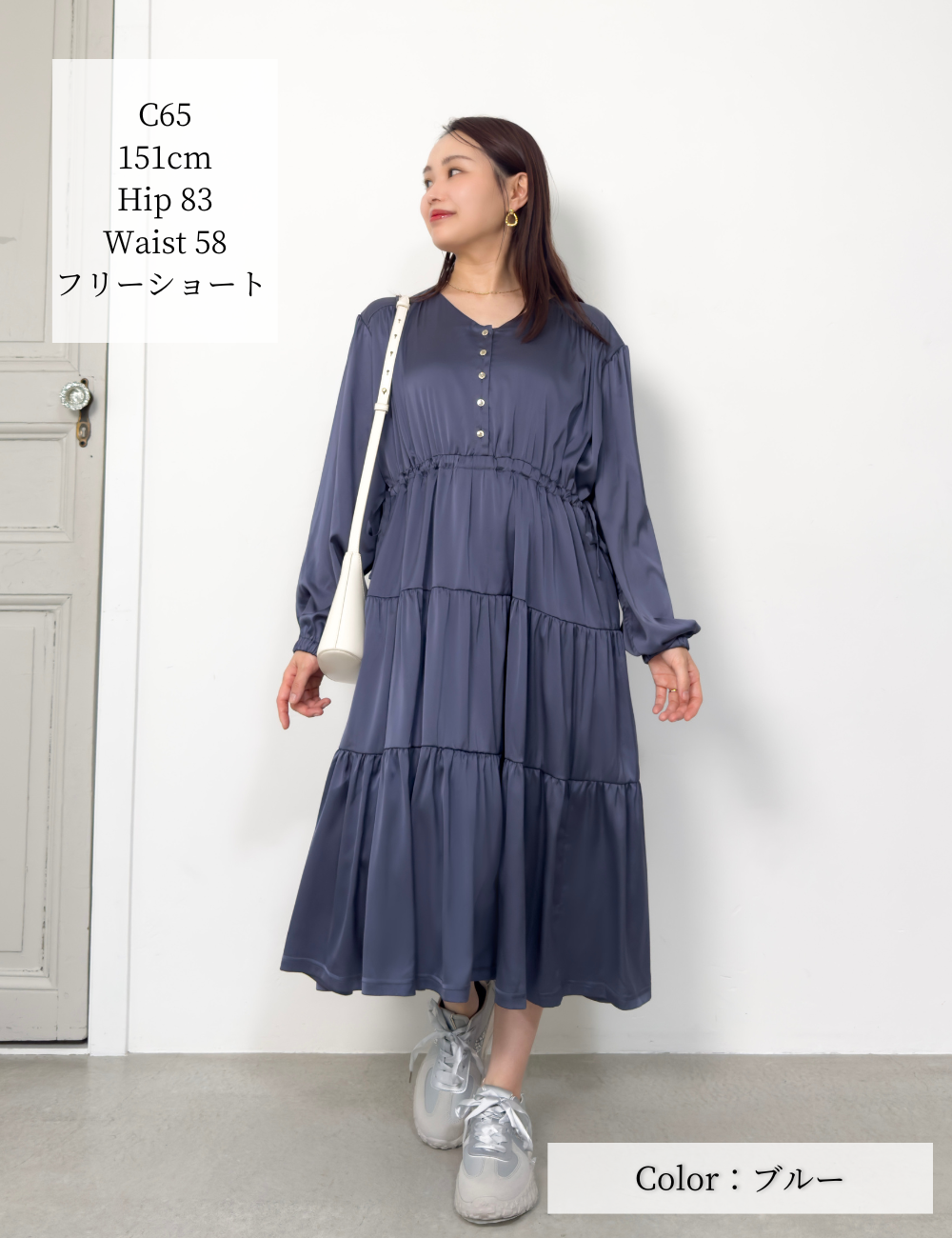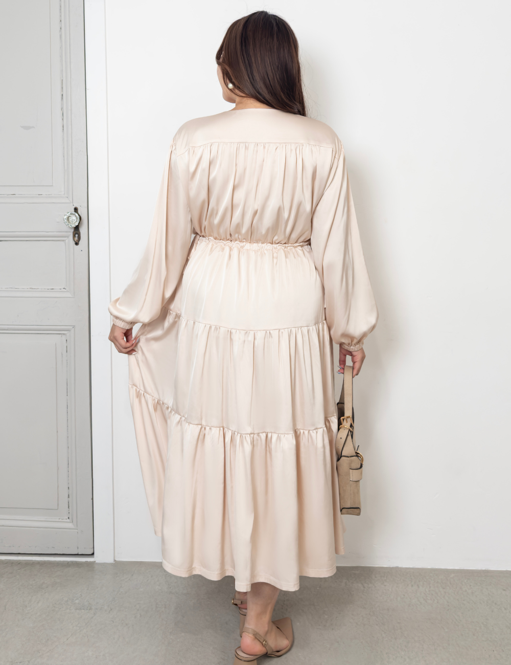 サテン風生地もたっぷり贅沢に使用。背中にもギャザーを贅沢に寄せて、下着のラインも目立ちにくくリッチ見えします。