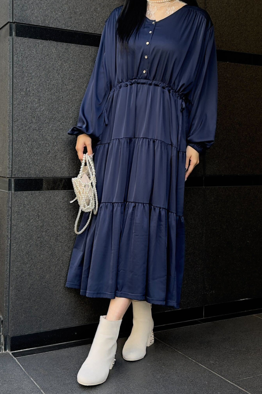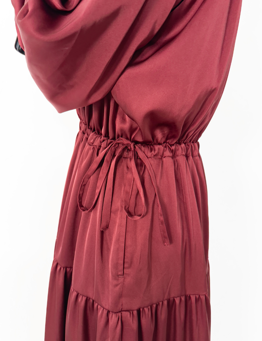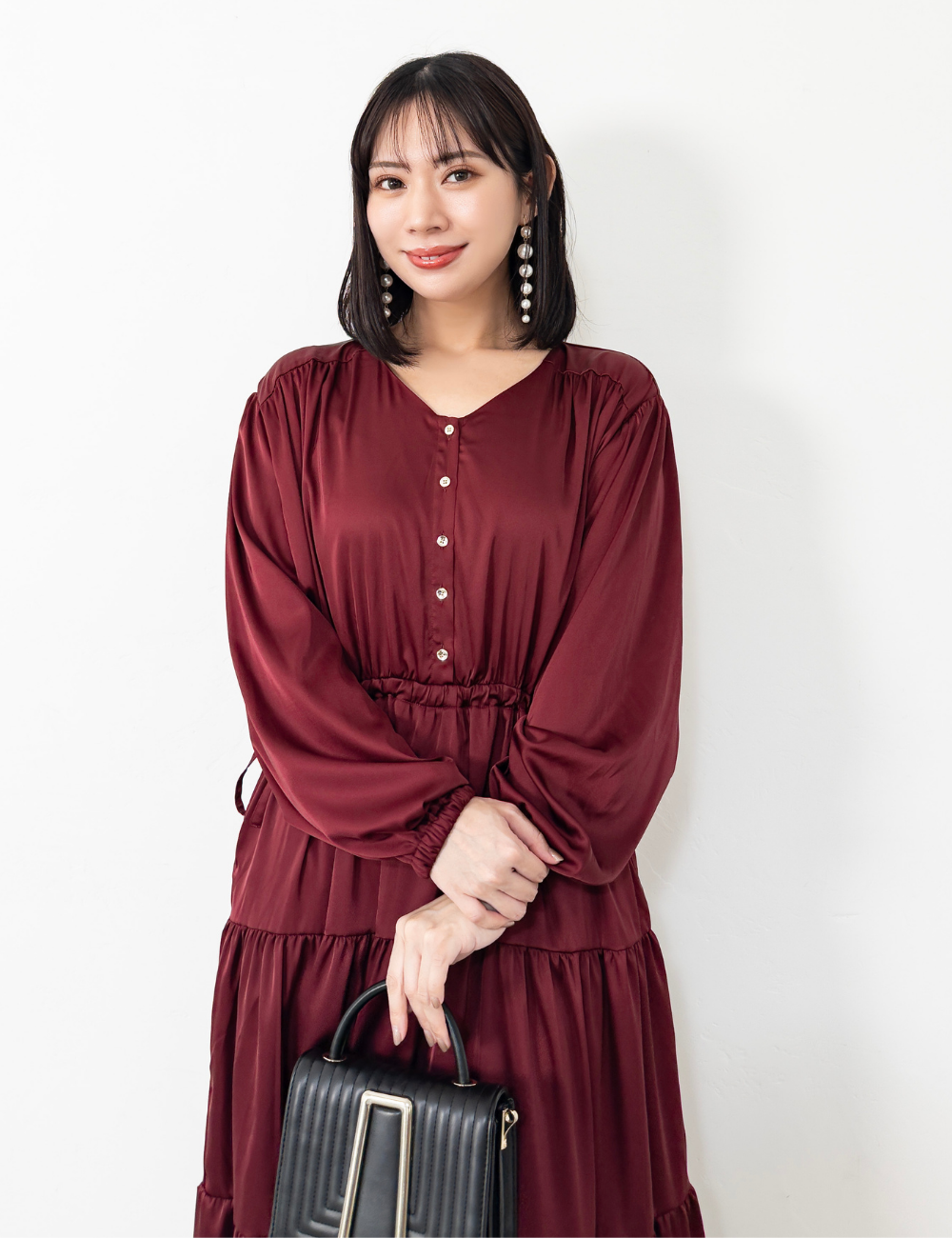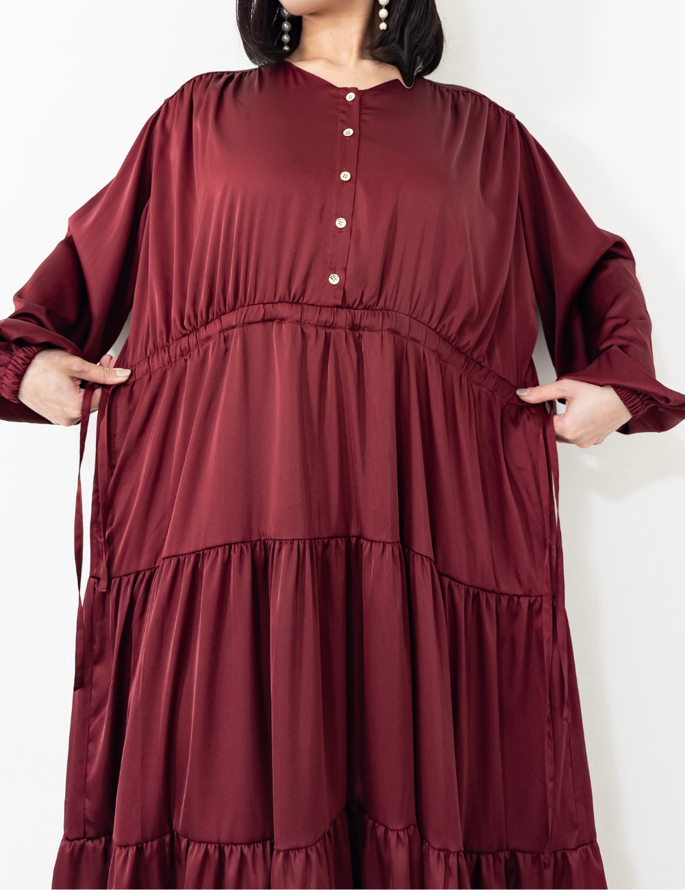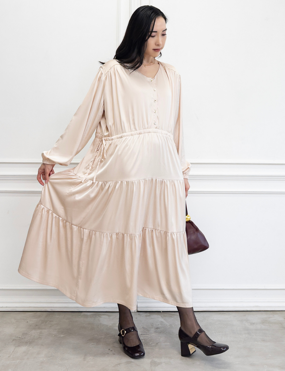 サテン風生地もたっぷり贅沢に使用。背中にもギャザーを贅沢に寄せて、下着のラインも目立ちにくくリッチ見えします。