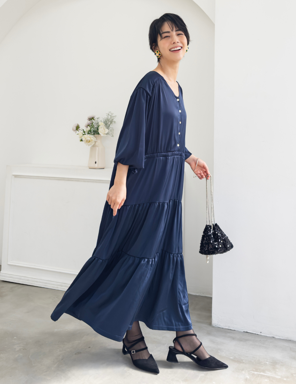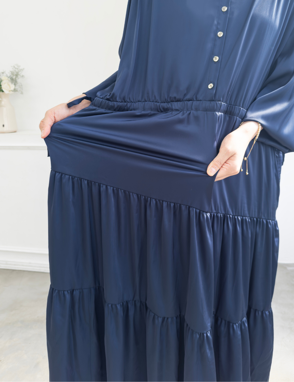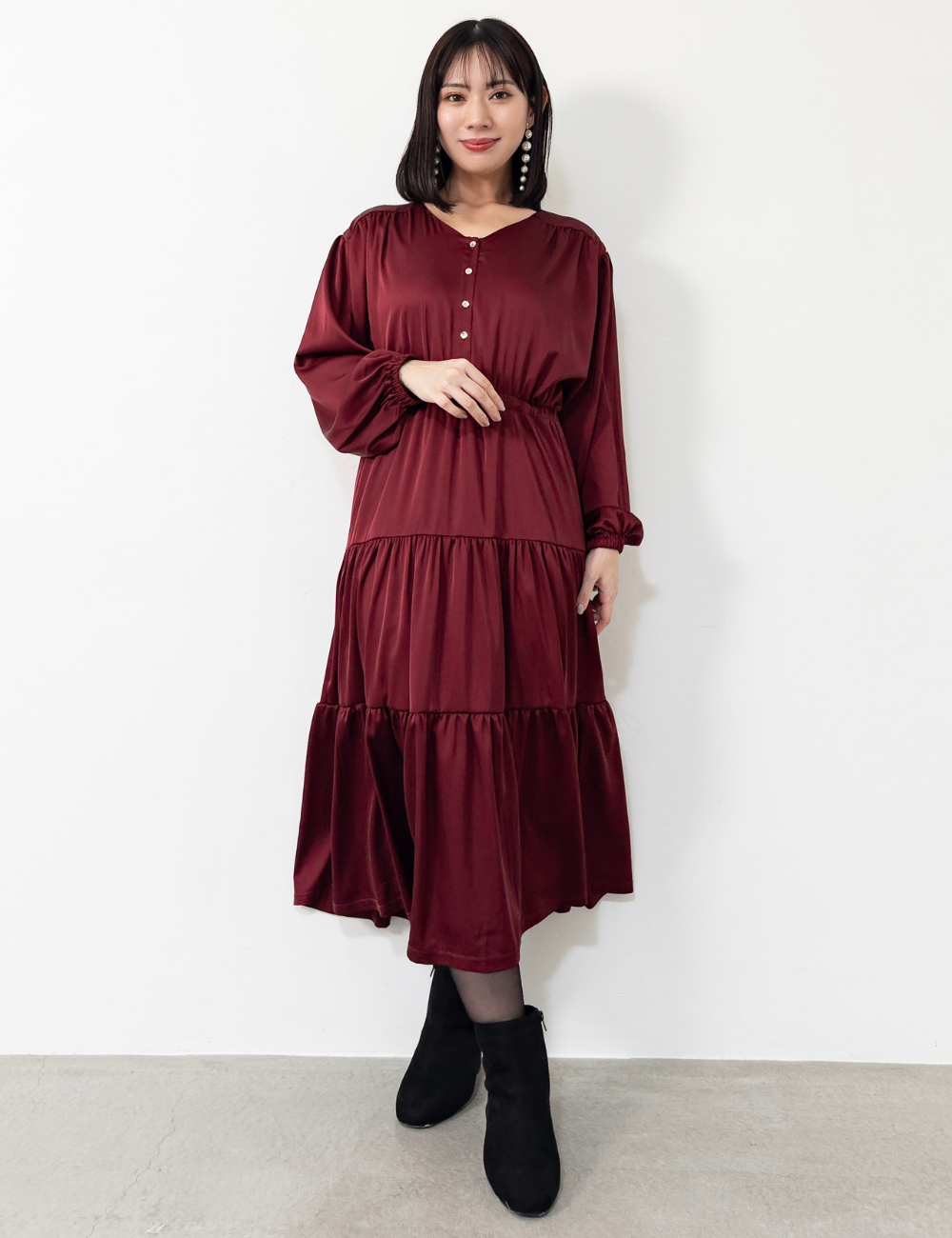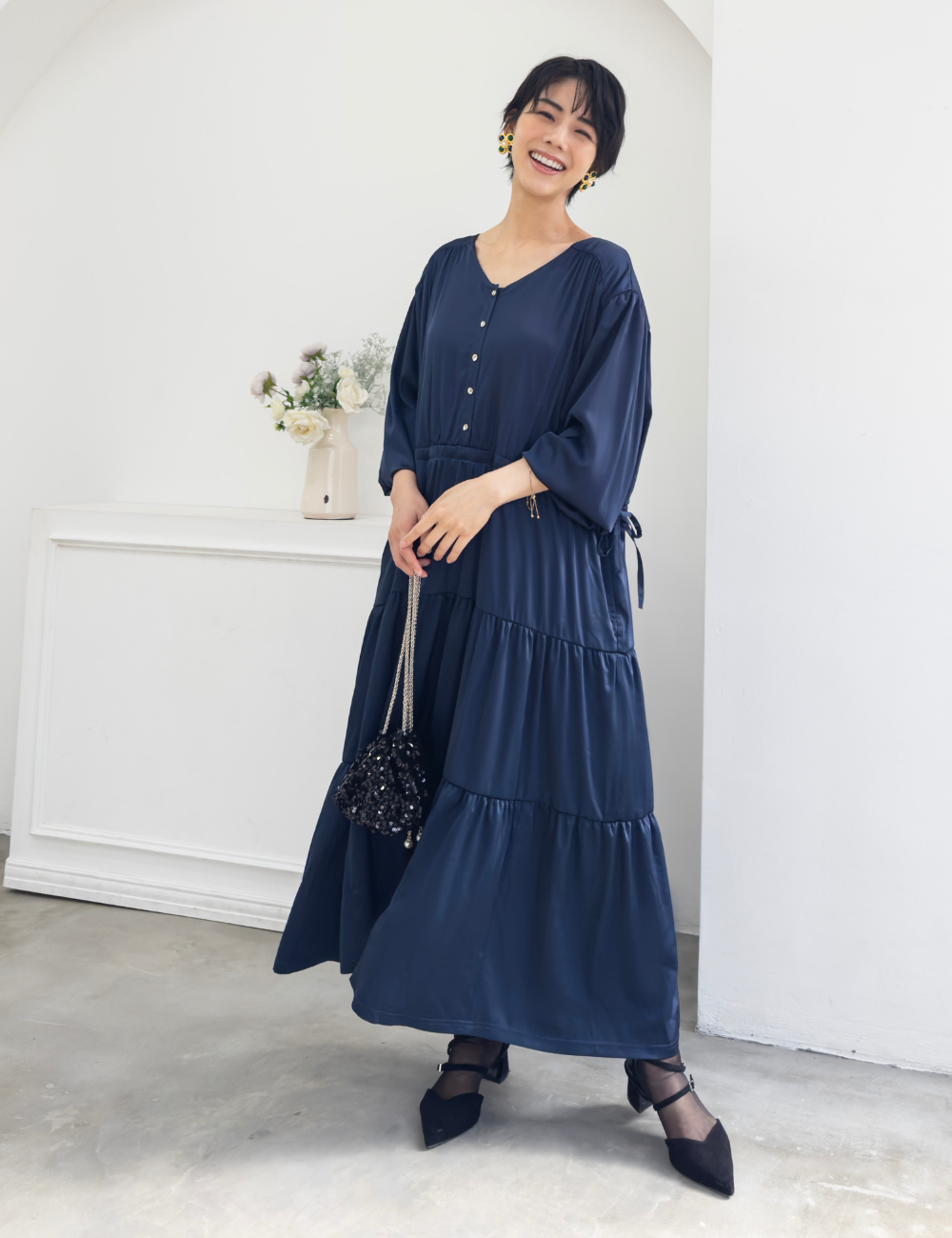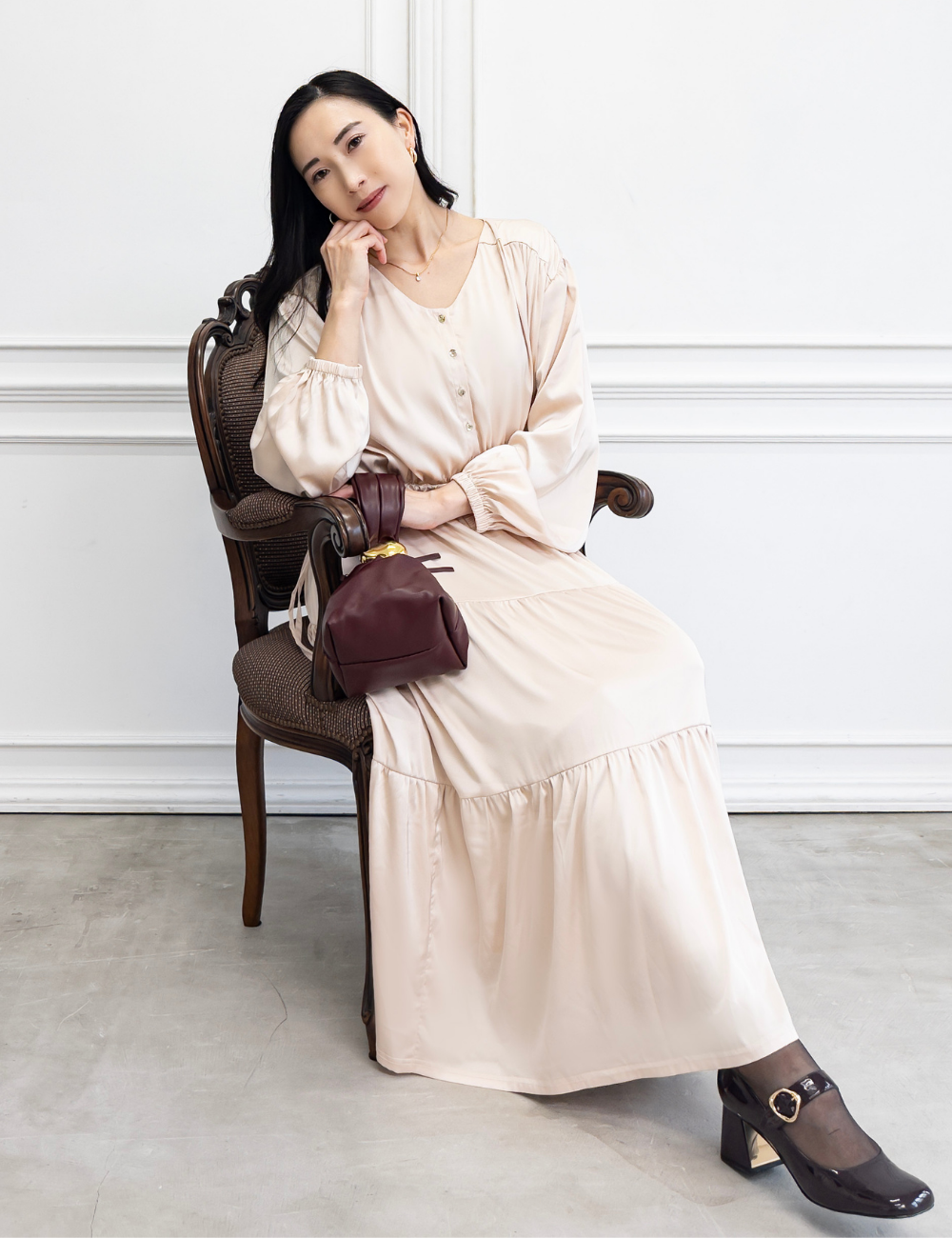 サテン風生地もたっぷり贅沢に使用。背中にもギャザーを贅沢に寄せて、下着のラインも目立ちにくくリッチ見えします。