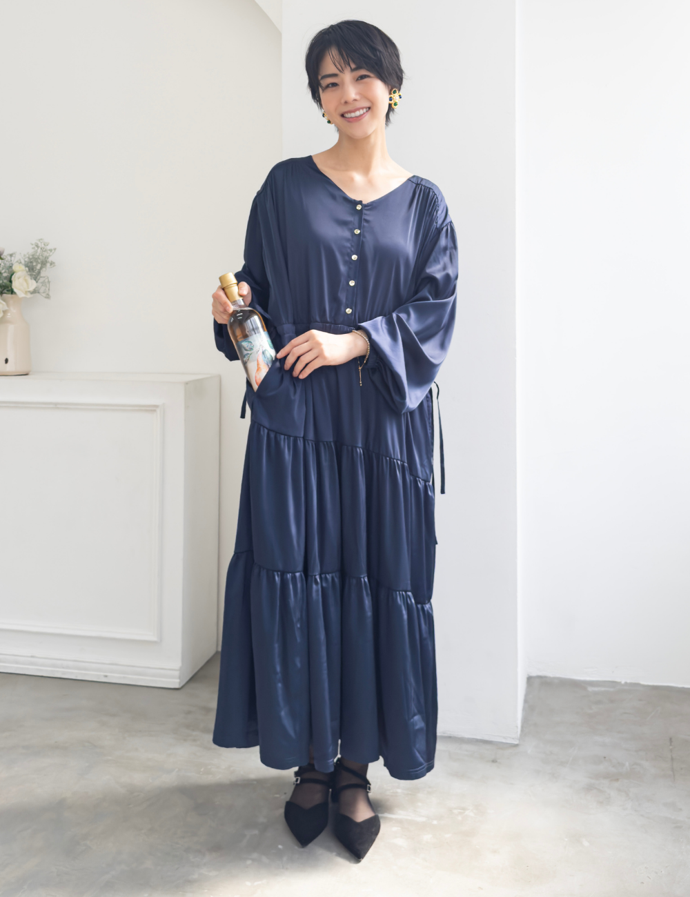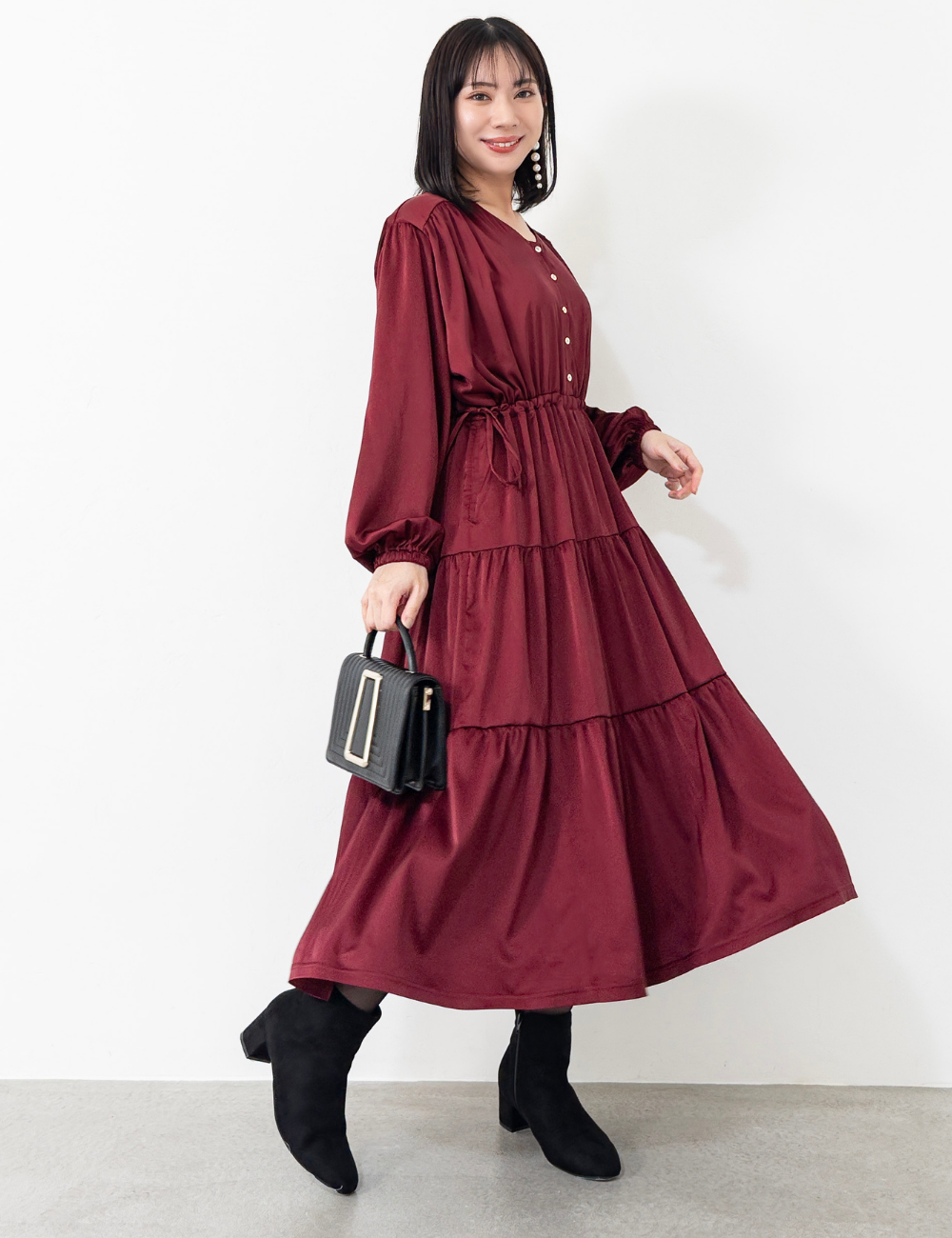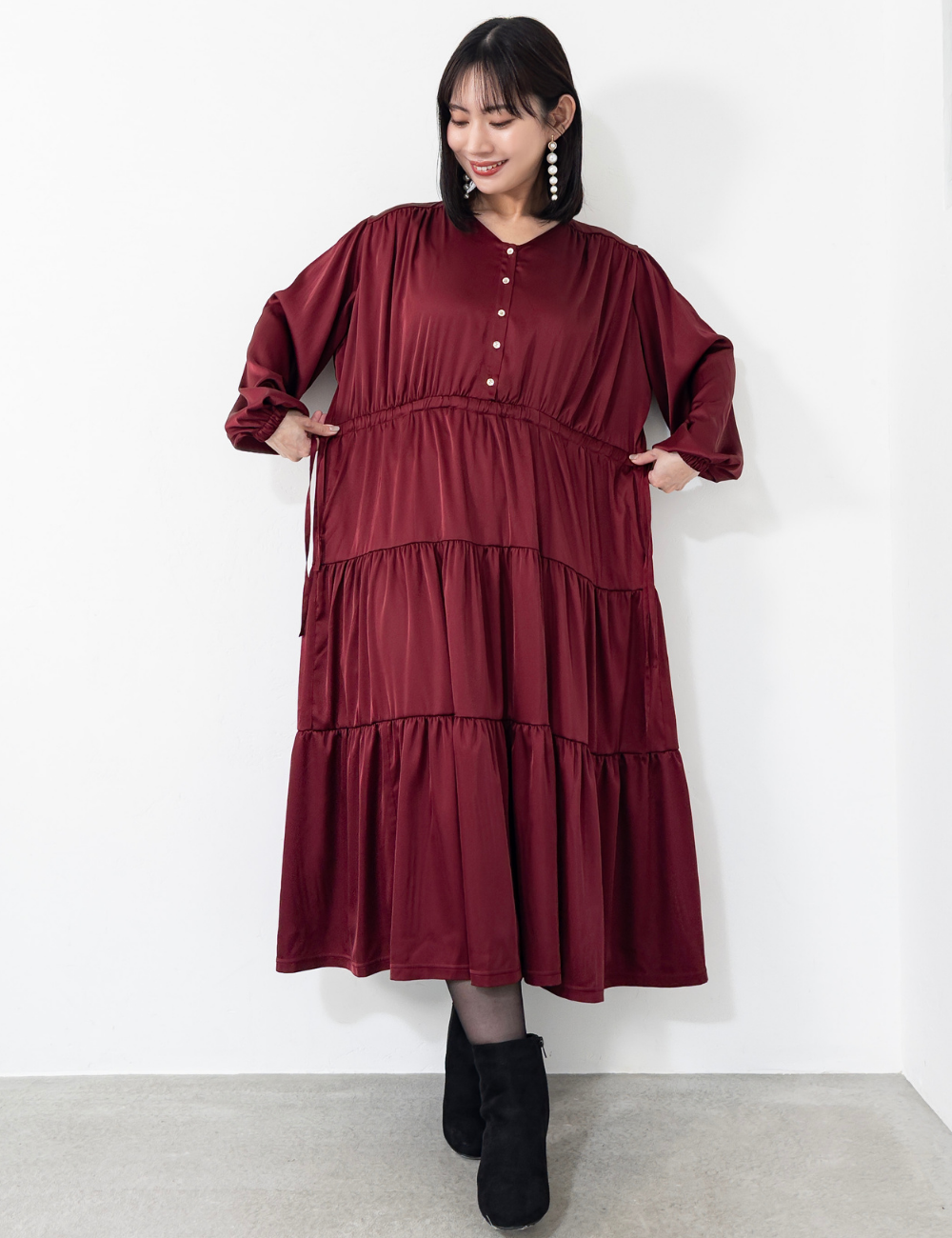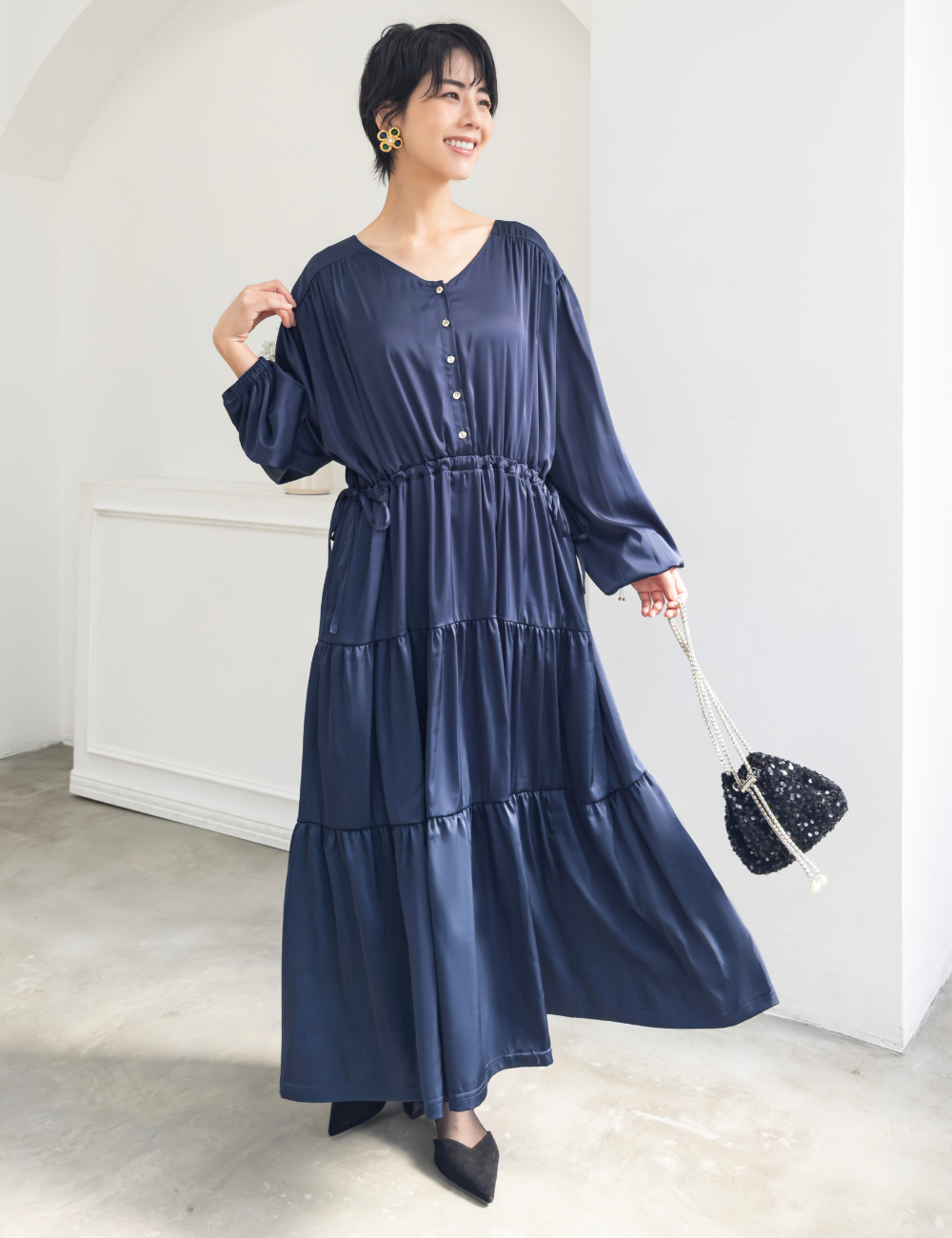 ウエストのドロストをぎゅっと絞ればくびれをつくったメリハリシルエットに。絞らずに着ればゆったりとしたAラインに広がり、骨格や体型を選ばず自分らしいバランスで楽しめます。