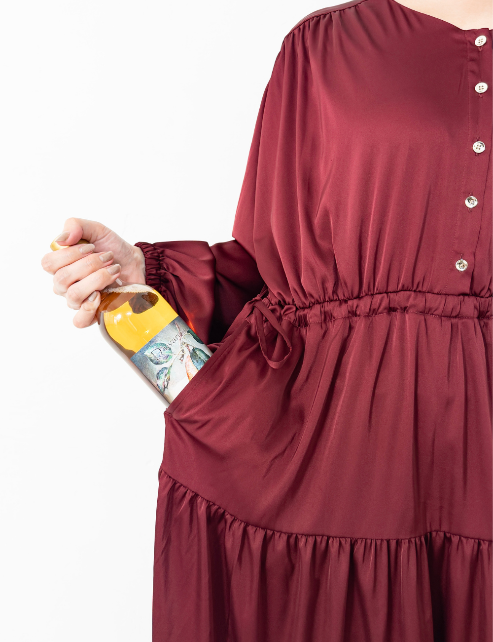 ・幅広い体型の方が綺麗に着られるリアルフリーサイズ・丈は選べる2サイズ・シャンパンゴールドの前開きボタン×5・前開きで授乳可能・ウエストドロスト・袖口ゴム・裏地付き・600mlボトルがすっぽり入るマジカルポケット・シワになりにくい・マシンウォッシャブル・ポケット袋布は伸びない生地使用