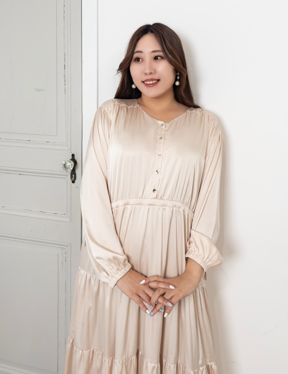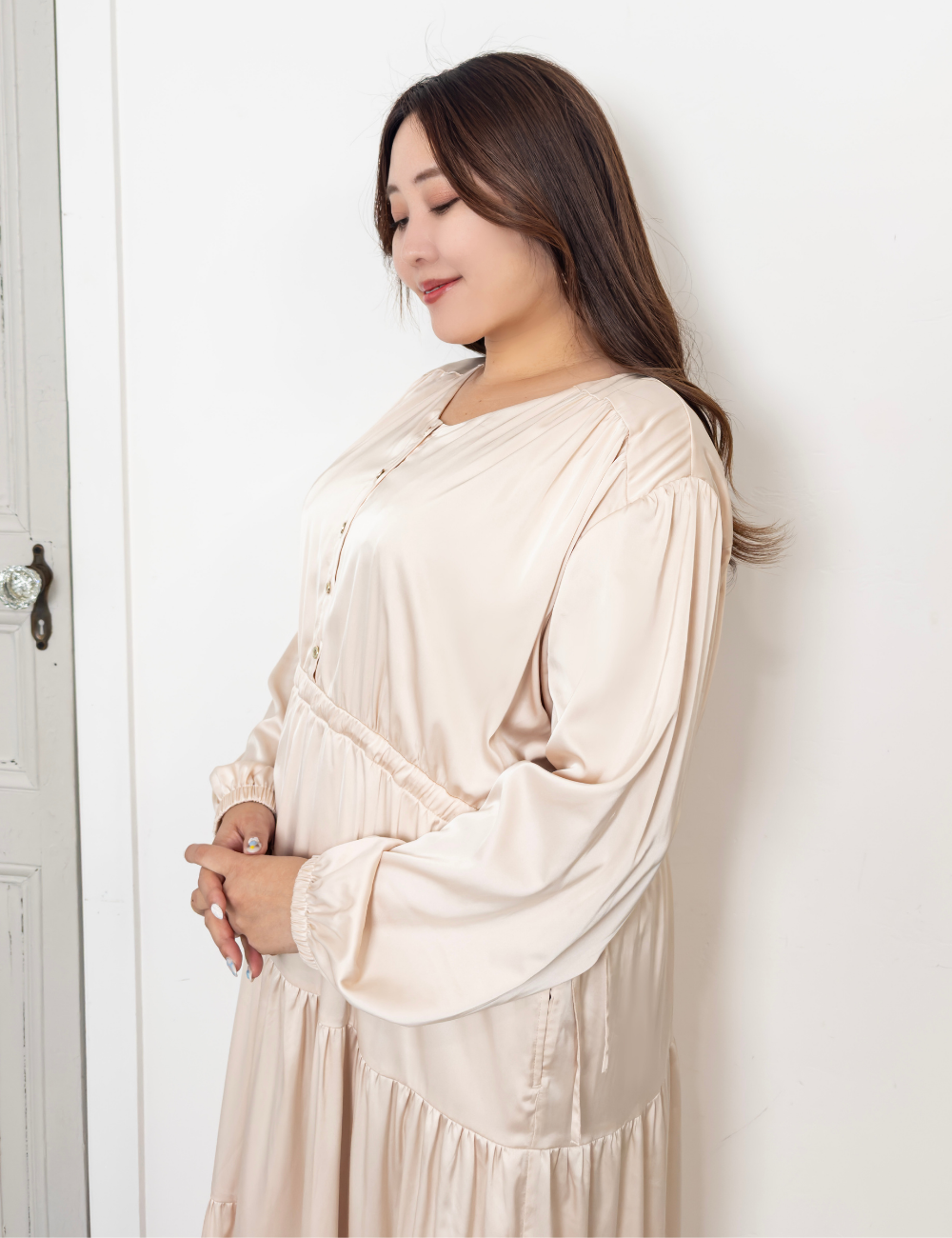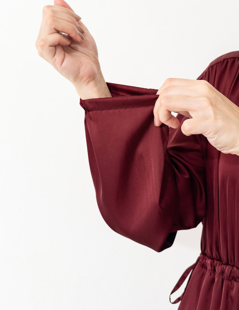 ツヤ感があり、さらっと肌触りの良いサテン風素材を使用。たっぷり生地を使っているのに軽く、ストレスのない着心地が魅力です。