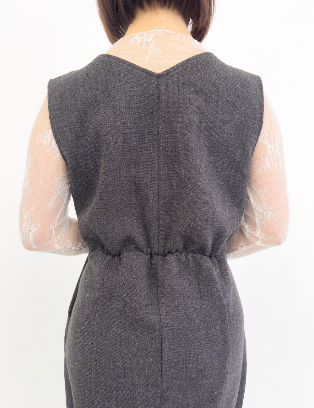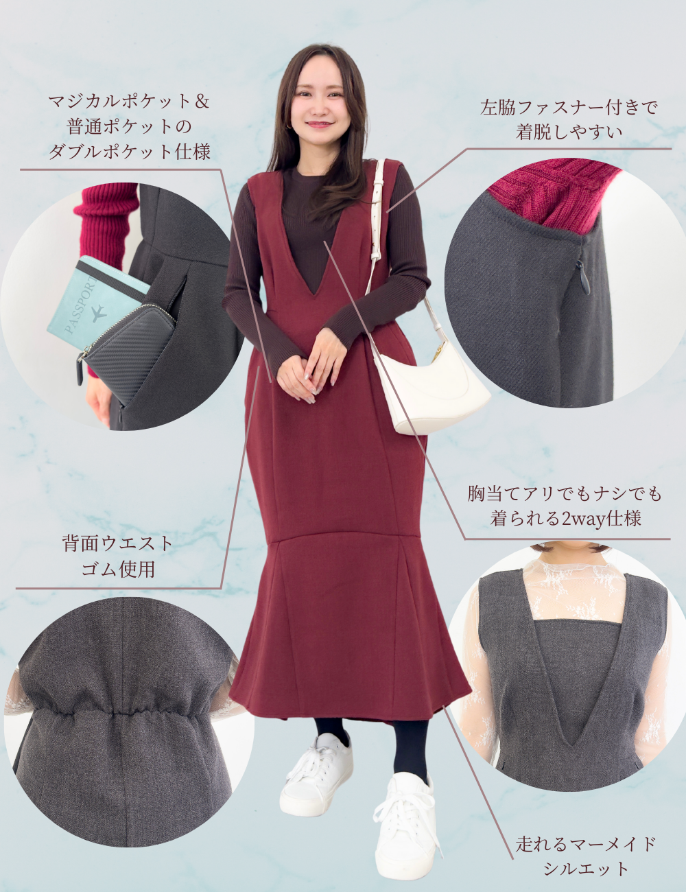 ・インナーベア風の胸元はスナップボタンで取り外し可・背中ゴム・左脇あき・シワになりにくい・マシンウォッシャブル・ダブルポケット仕様・ポケット袋布は伸びない生地使用・後ろ下がりデザイン