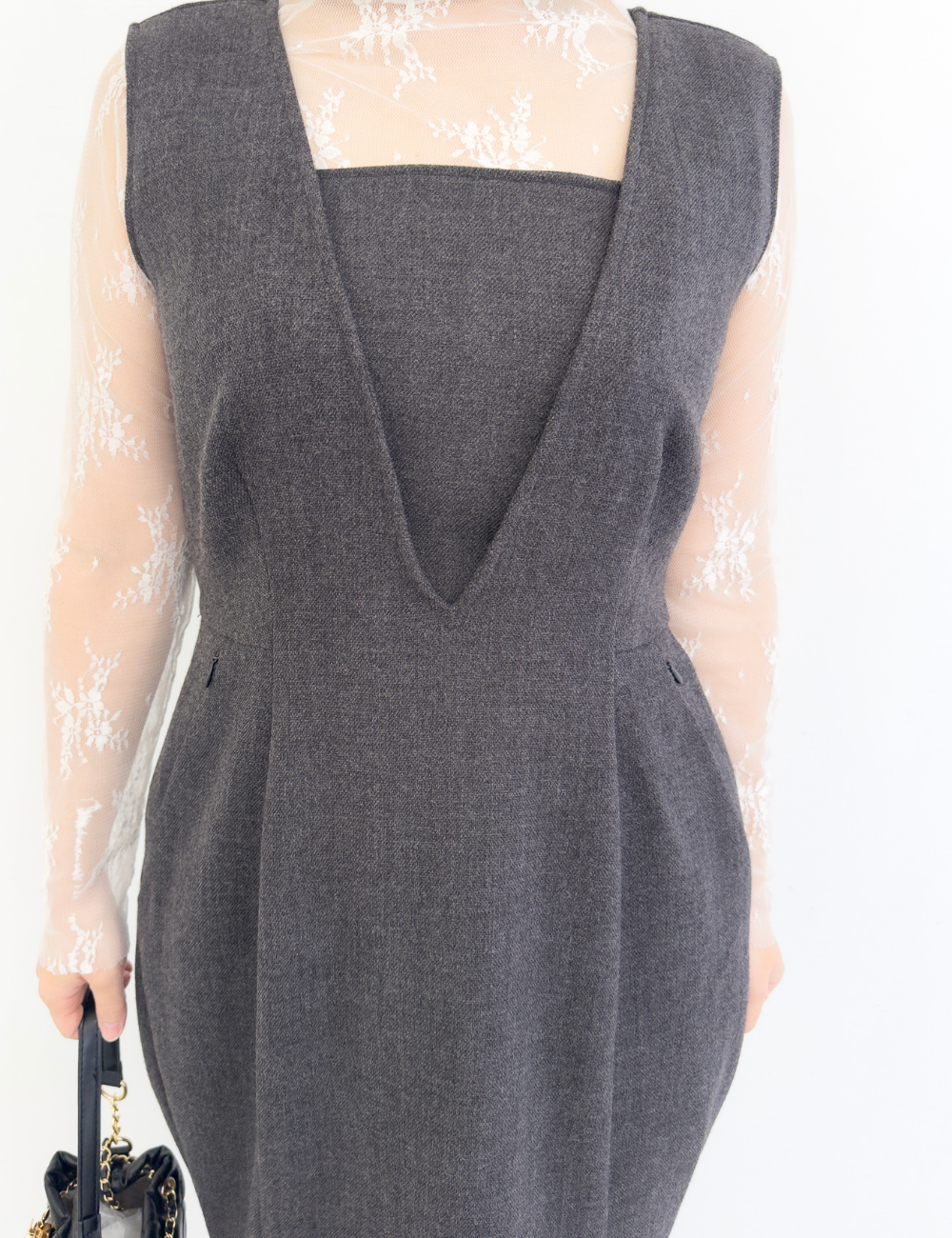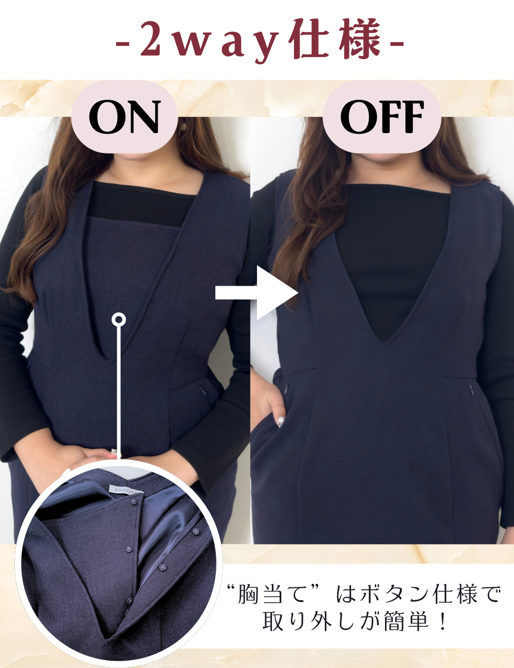 張りのあるストレッチ性の高い生地を使用したきれいめな仕上がり。Vでスッキリ見せても、谷間が見えないくらいに設計した胸当てアリでも着られる2wayです。