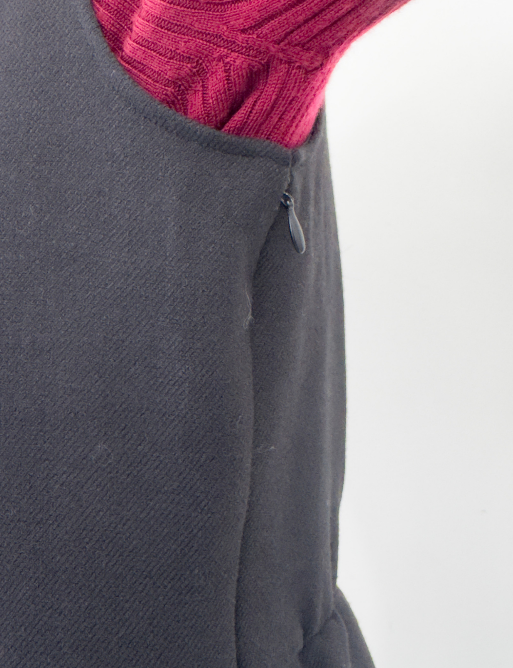 左脇にはファスナーが付いているため着脱がしやすく、背面ウエストのゴム仕様で、フィット感がありながら窮屈さを感じにくい設計です。