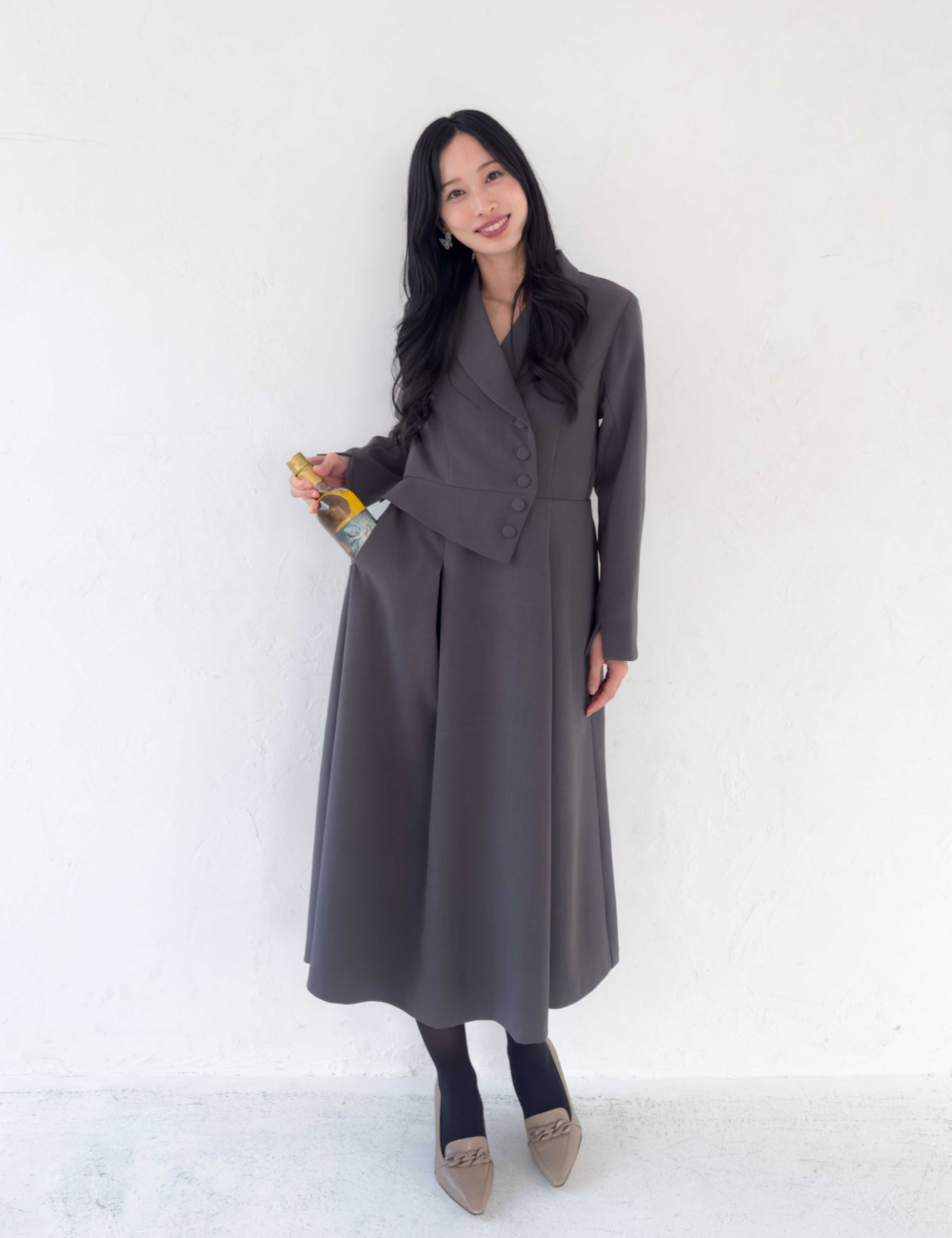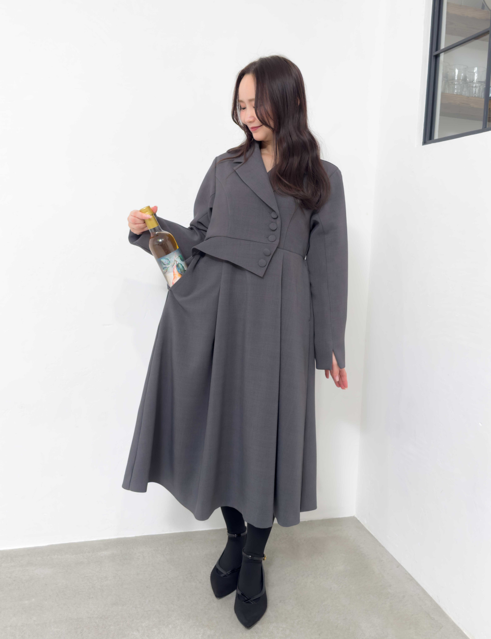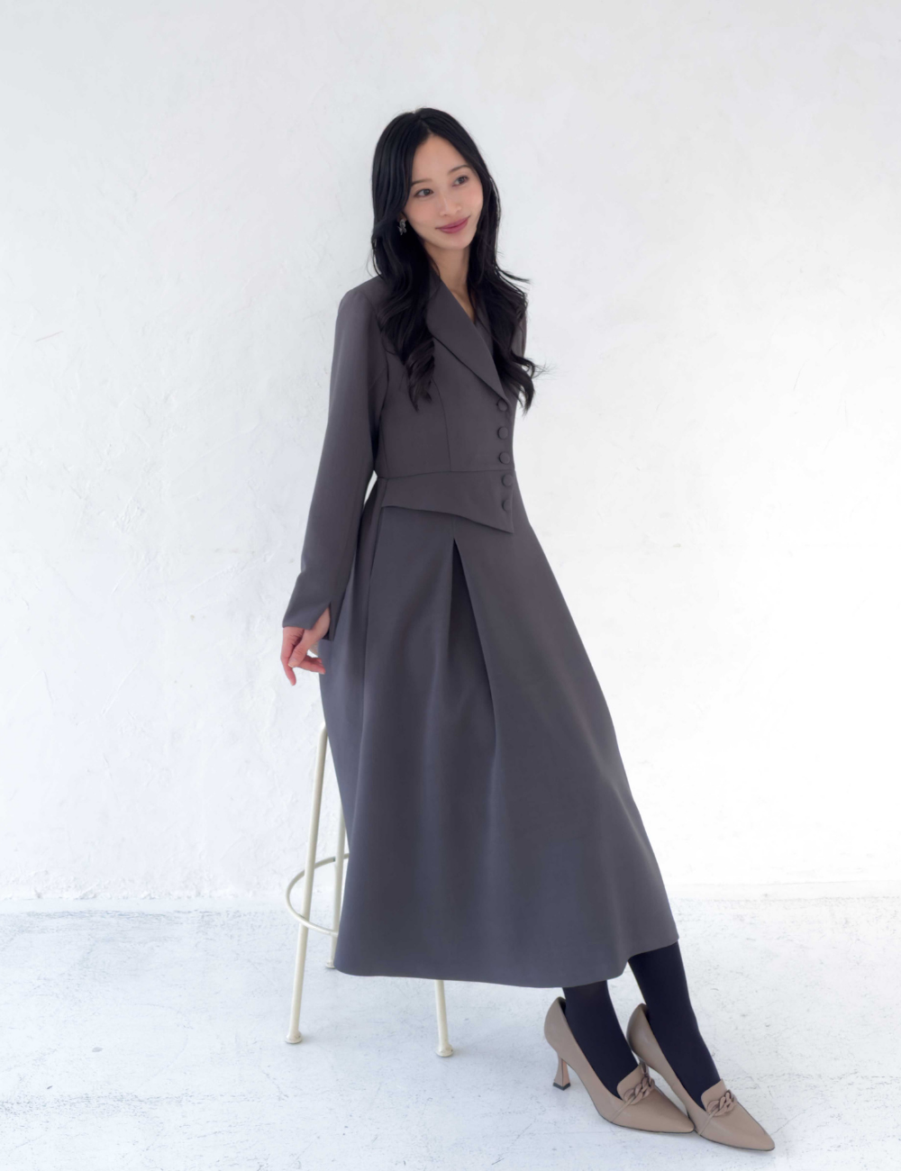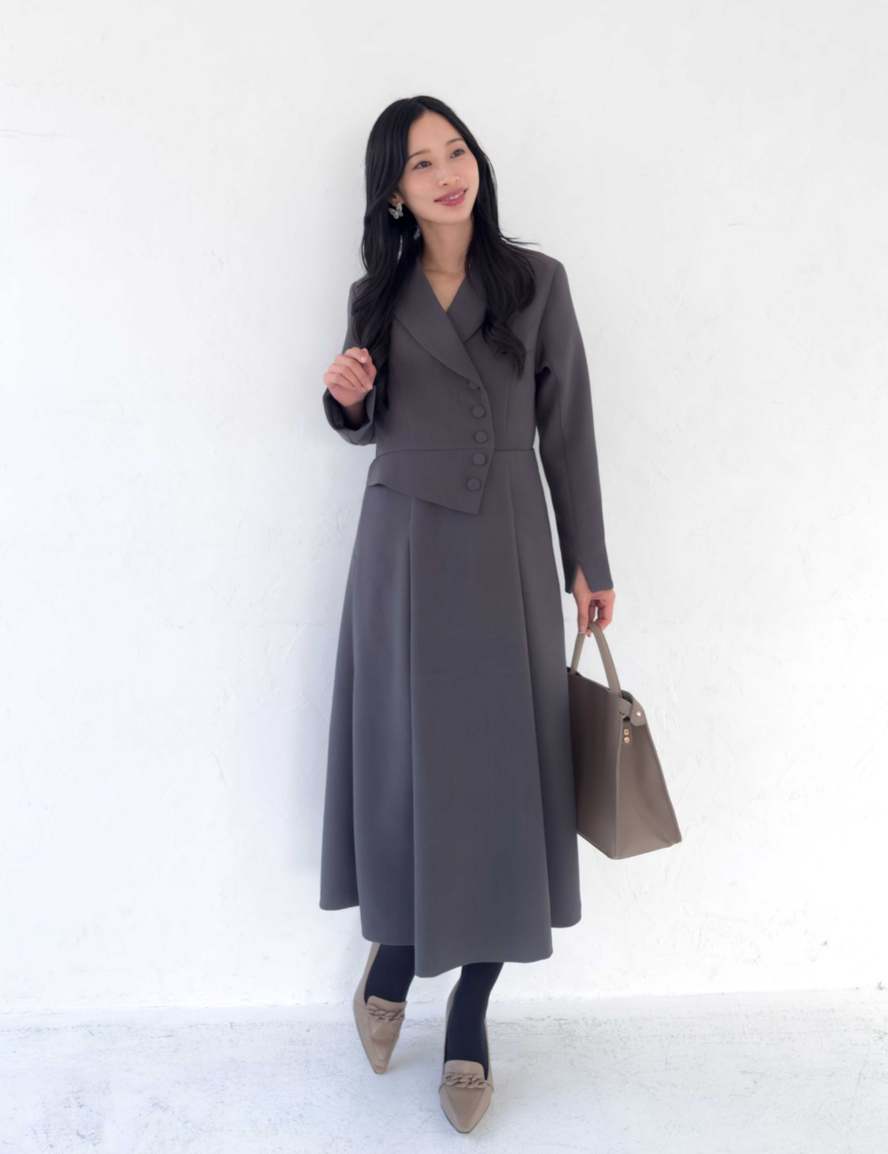 パネルラインが胸元に立体感を与える、上品なジャケット風ワンピース。