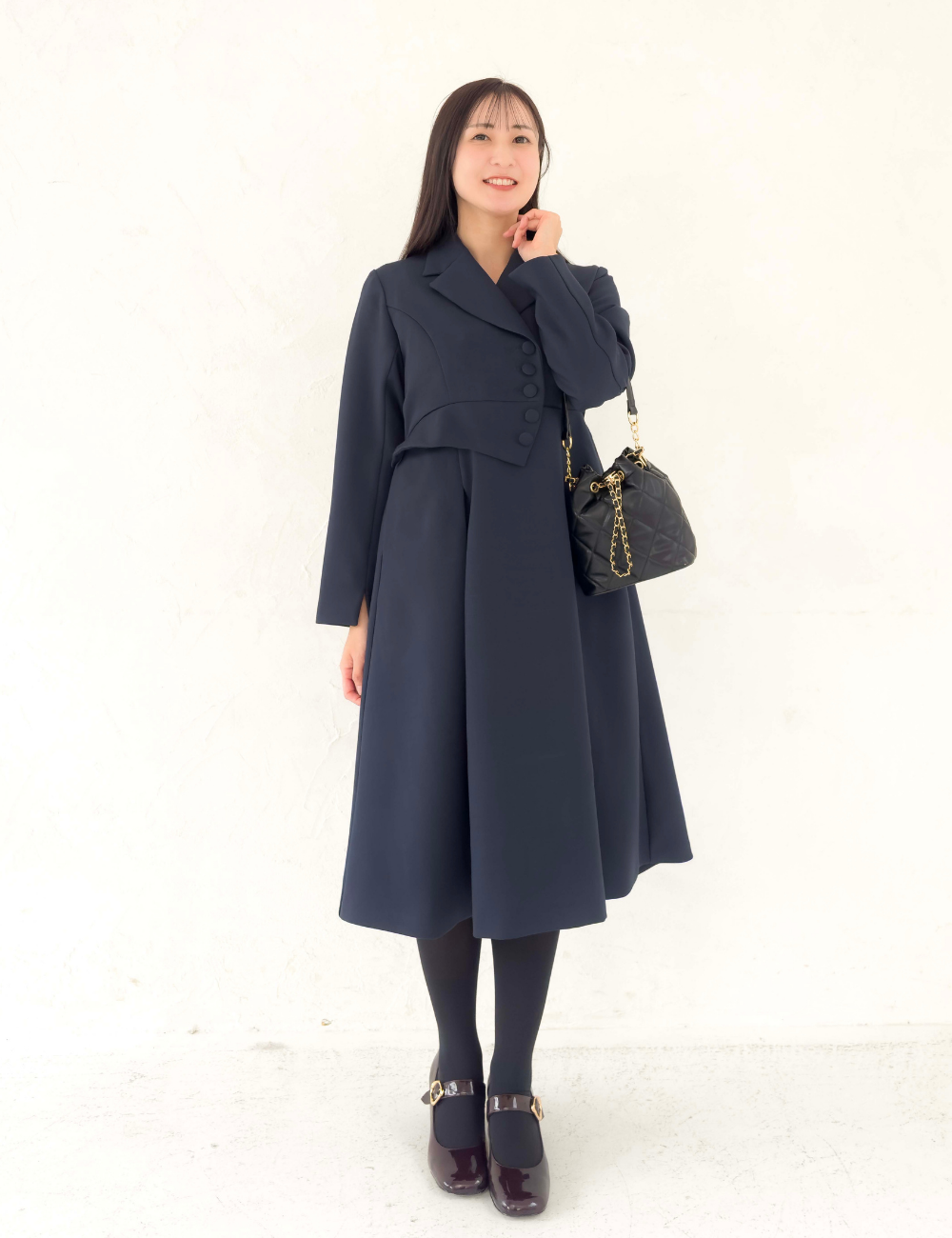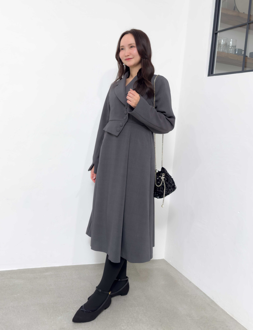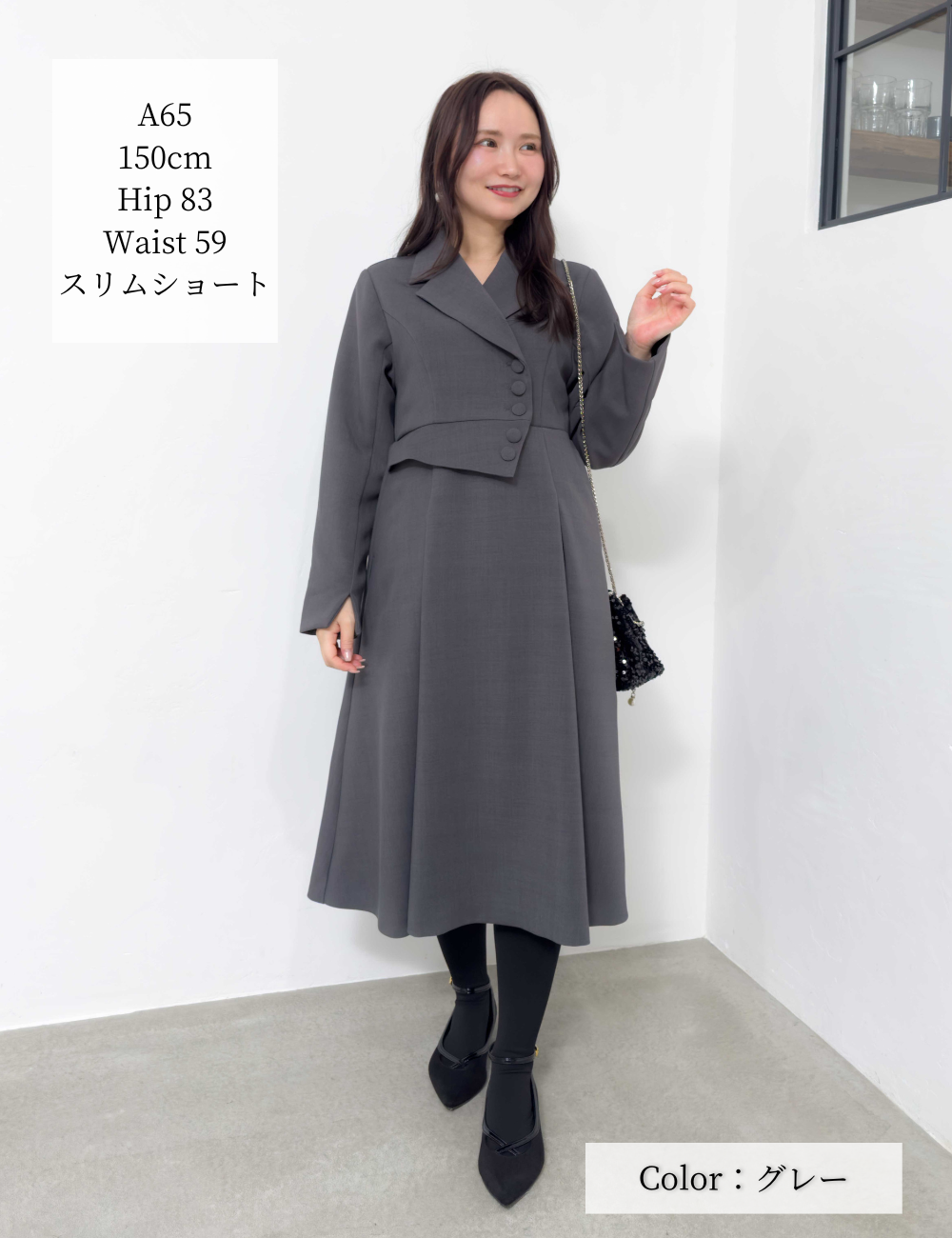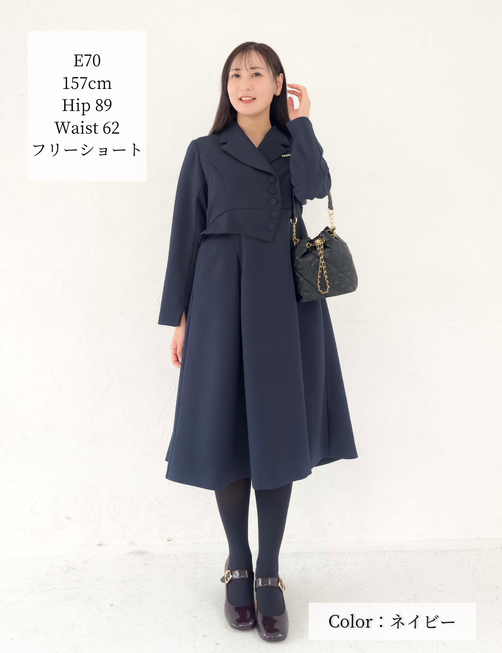 パネルラインが胸元に立体感を与える、上品なジャケット風ワンピース。