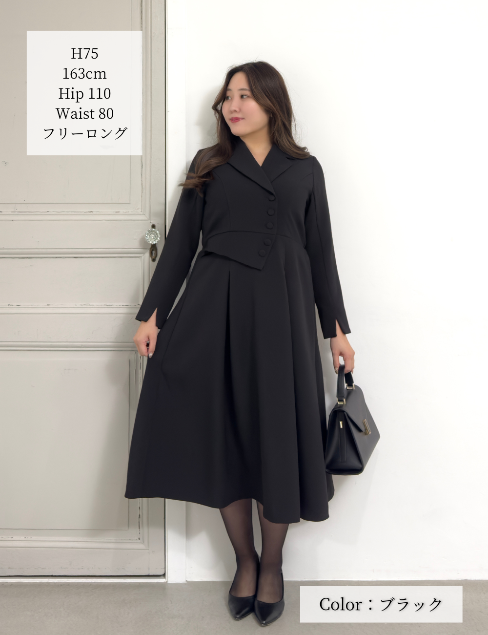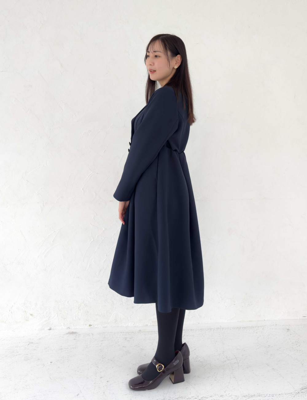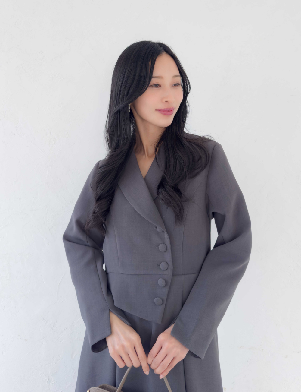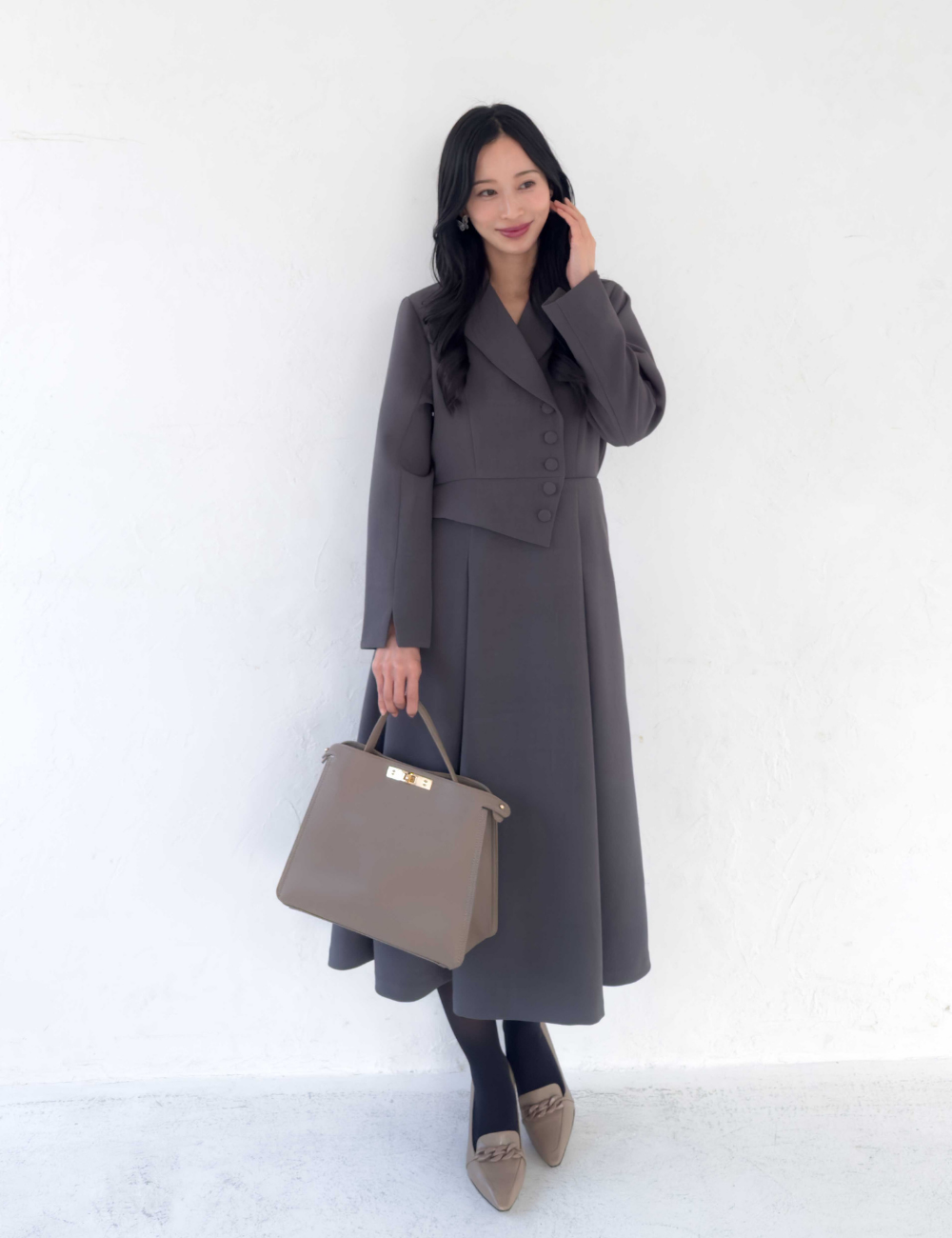 パネルラインが胸元に立体感を与える、上品なジャケット風ワンピース。