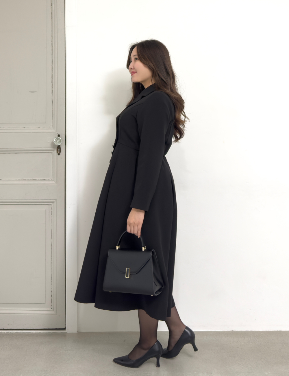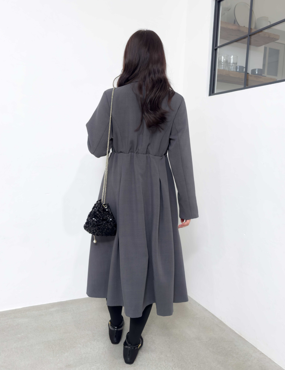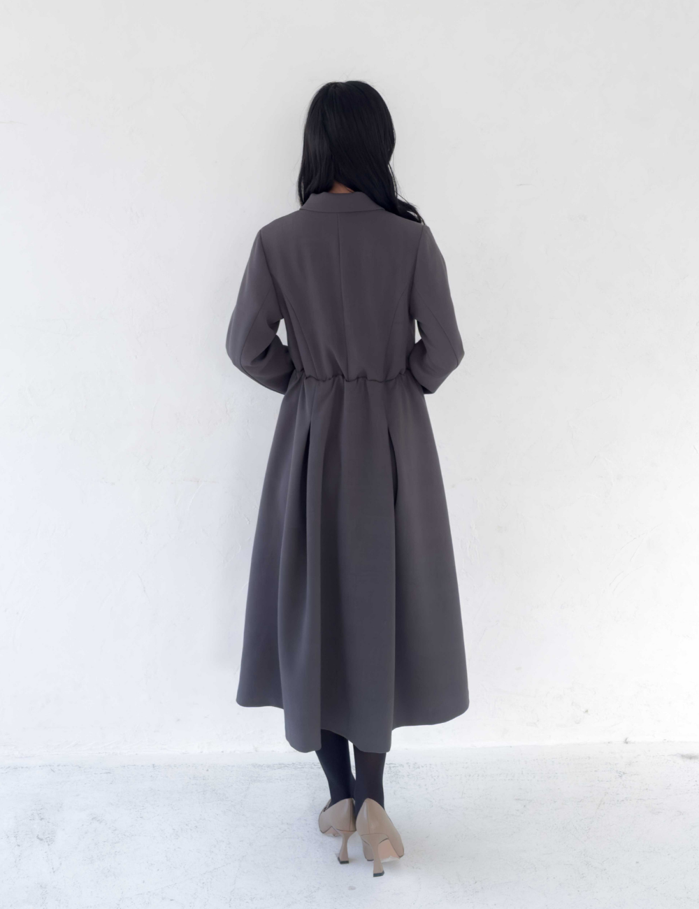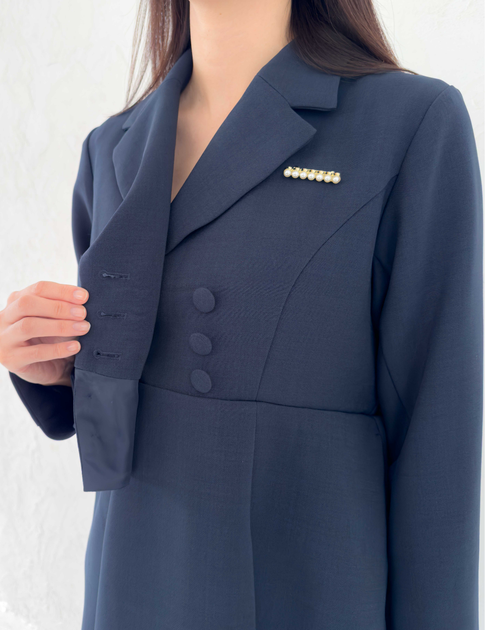 前開きに並ぶ飾りのクルミボタンが、クラシカルで洗練された印象を引き立てます。