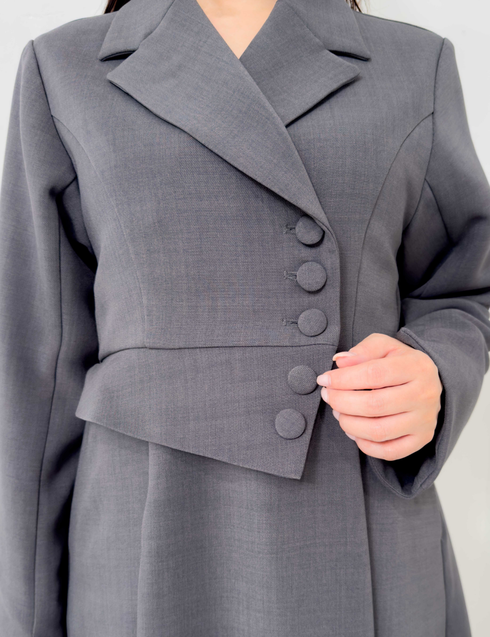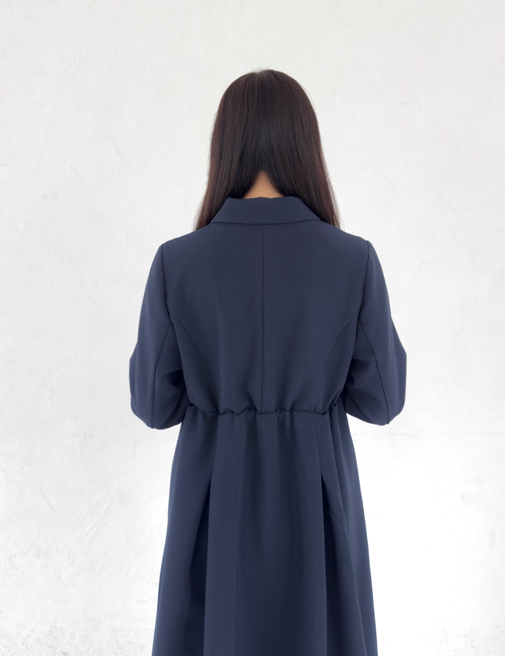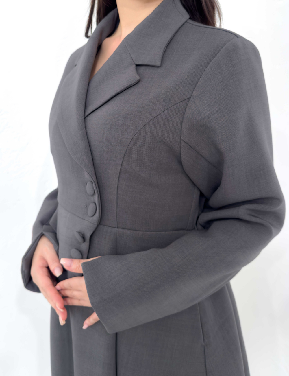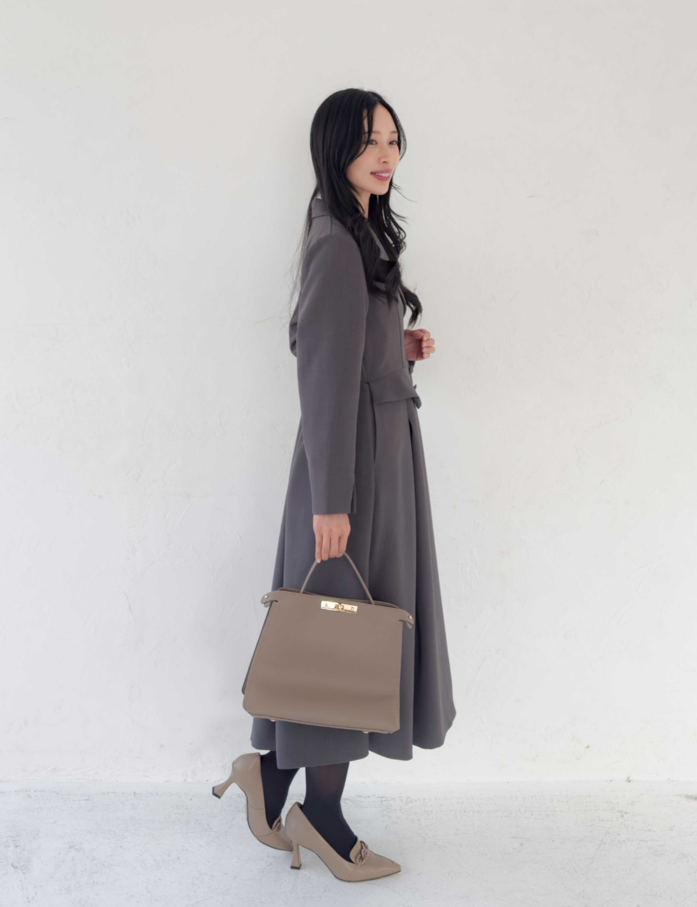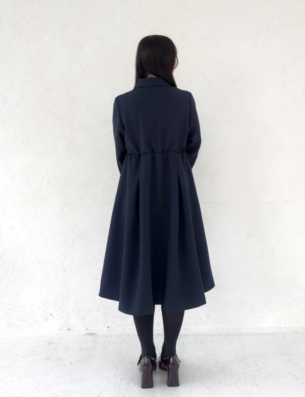 前開きに並ぶ飾りのクルミボタンが、クラシカルで洗練された印象を引き立てます。