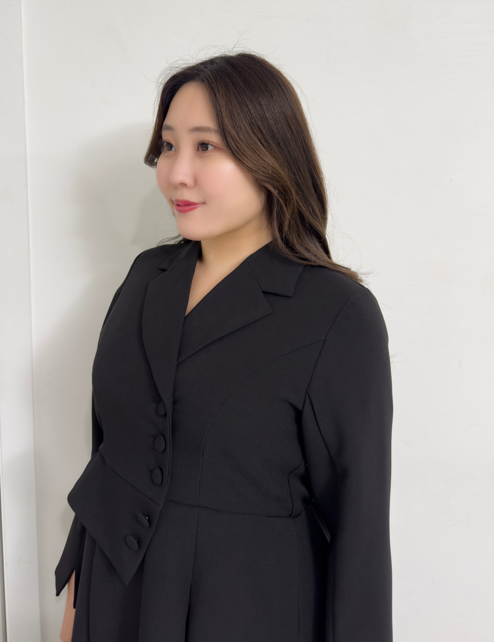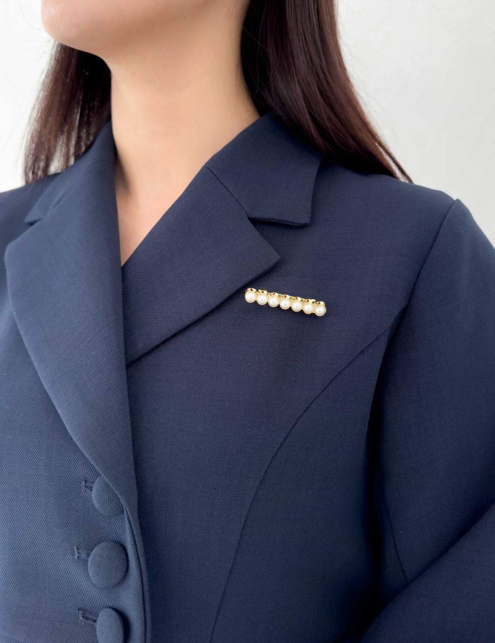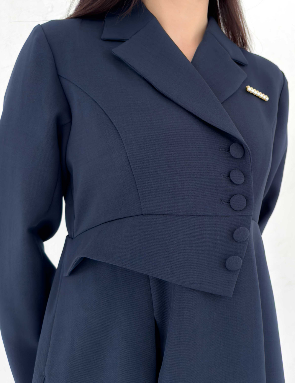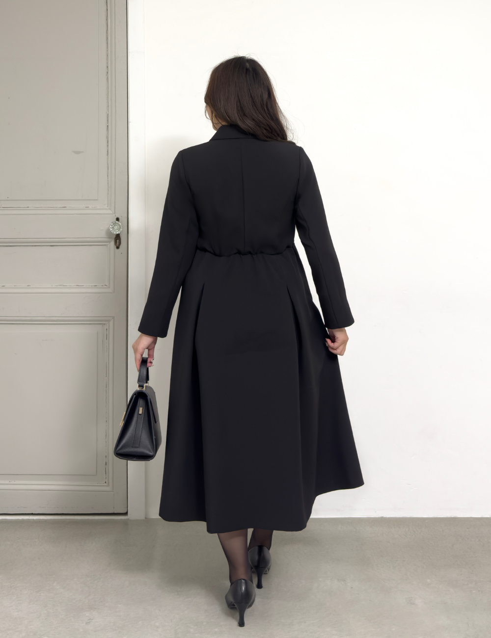 前開きに並ぶ飾りのクルミボタンが、クラシカルで洗練された印象を引き立てます。