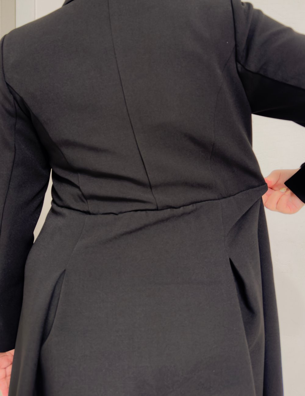 ボックスプリーツでおなかをまやかし、背面ゴムでは