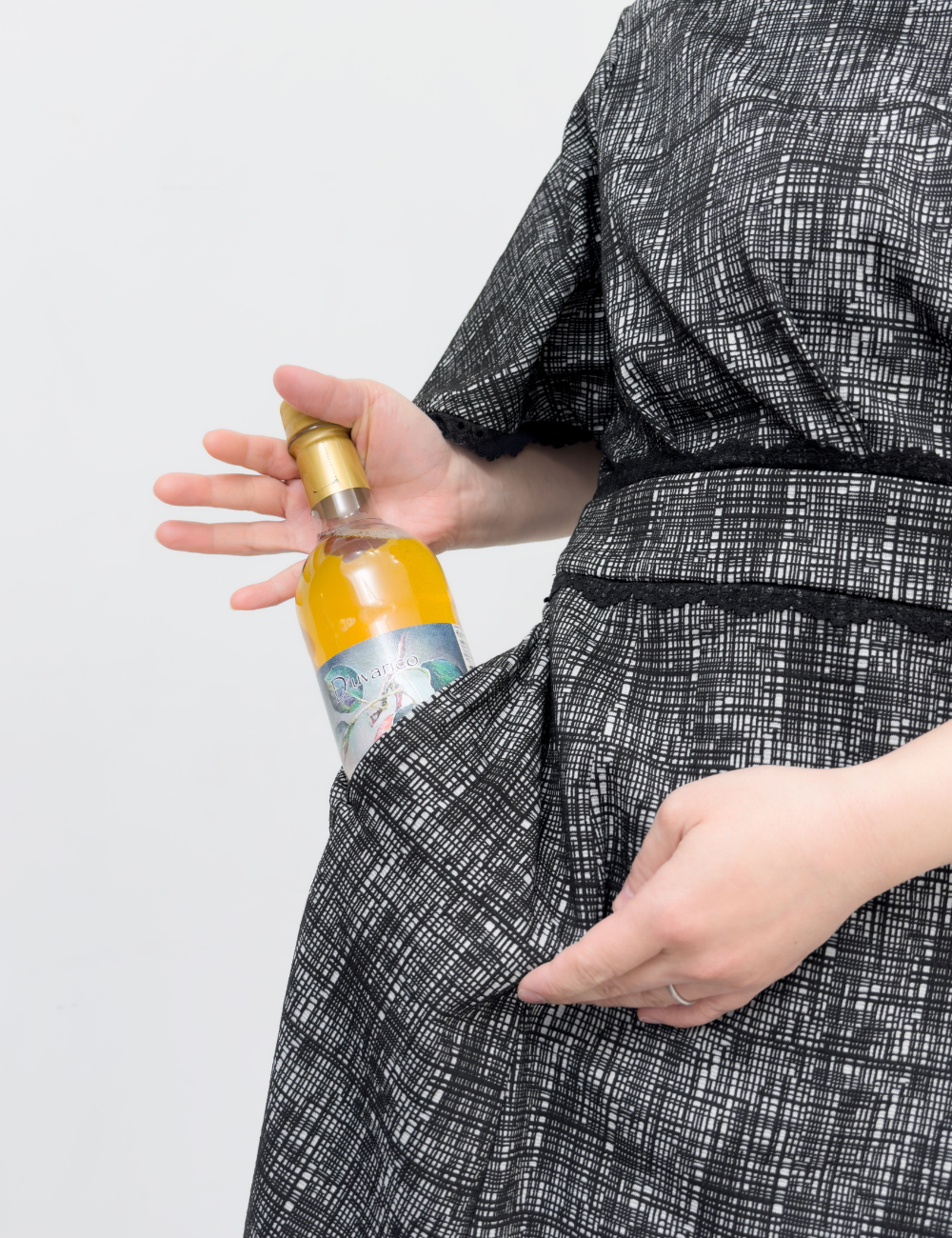 カシュクールの前立ては胸下まで開く仕様で、着脱しやすく授乳にも対応。妊娠中から産後まで長くご着用いただけます。