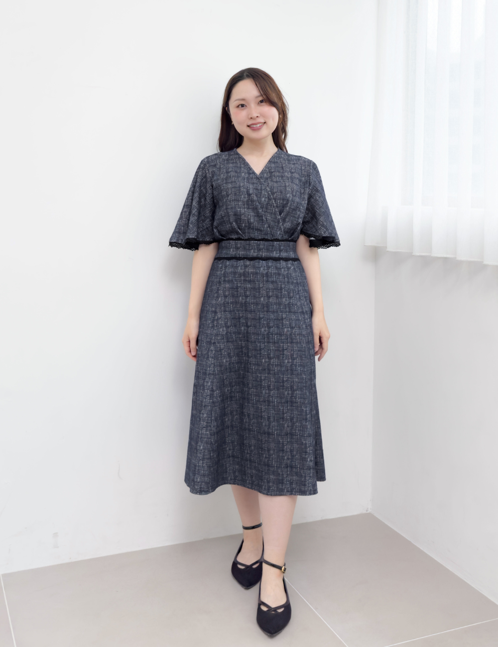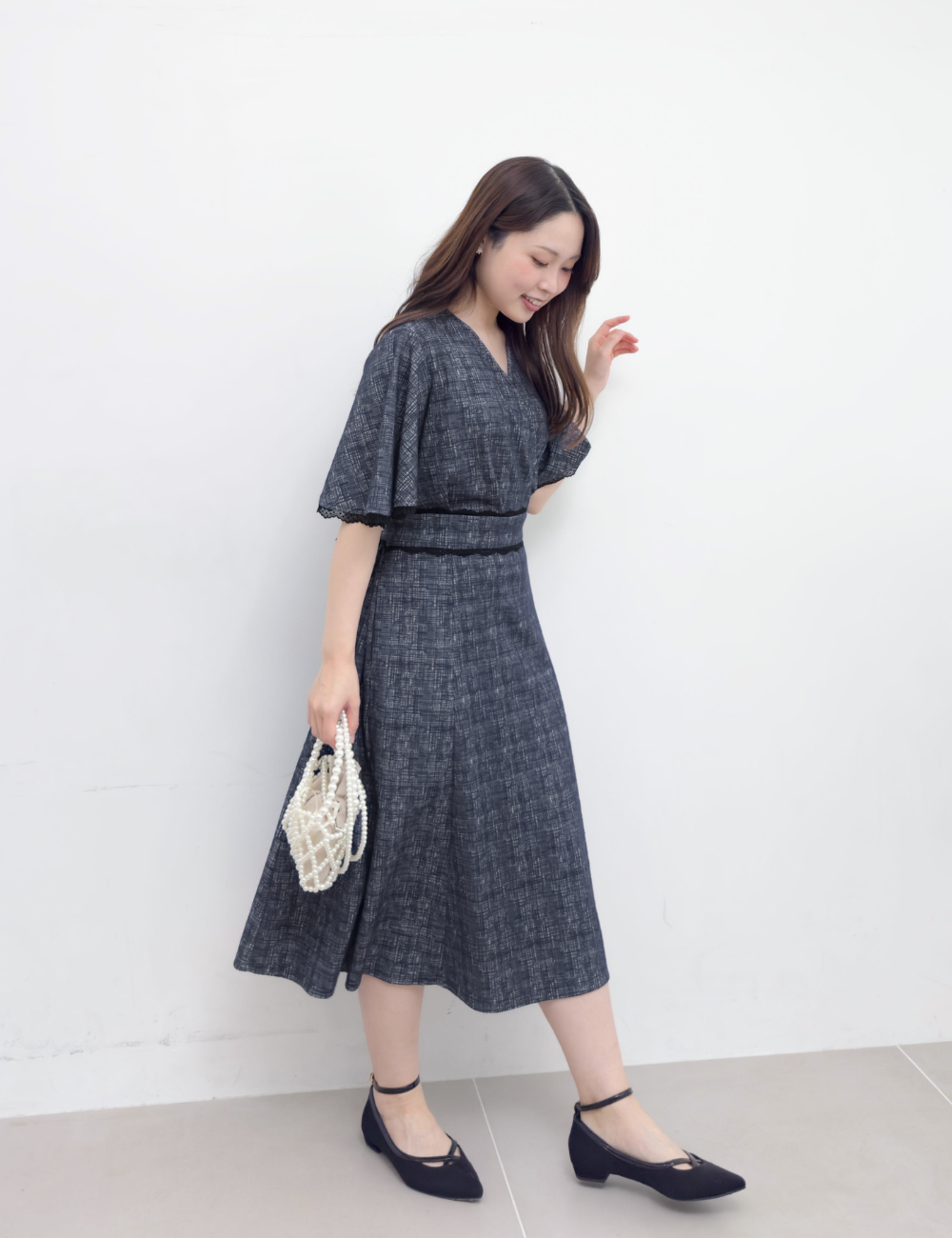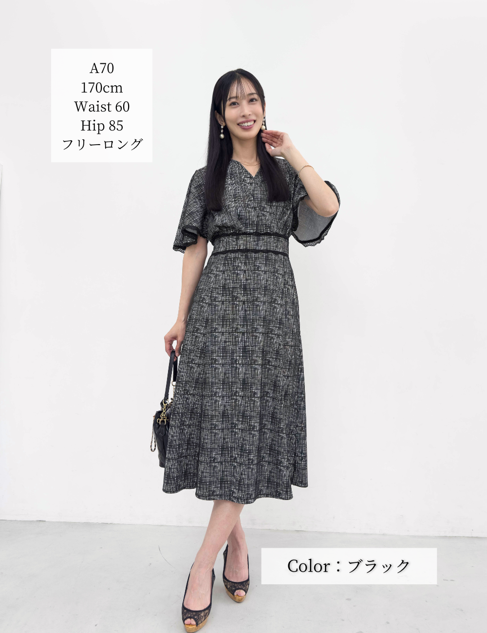 フレアスリーブが二の腕を自然にカバーしつつ、アームホールは脇高仕様で下着が見えにくい安心設計になっています。