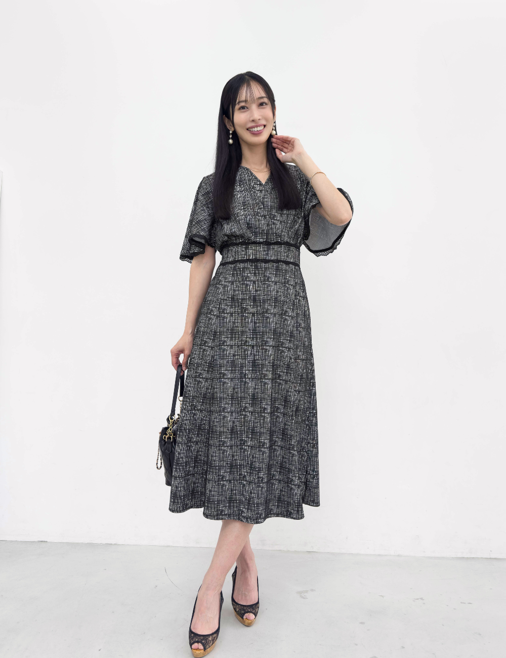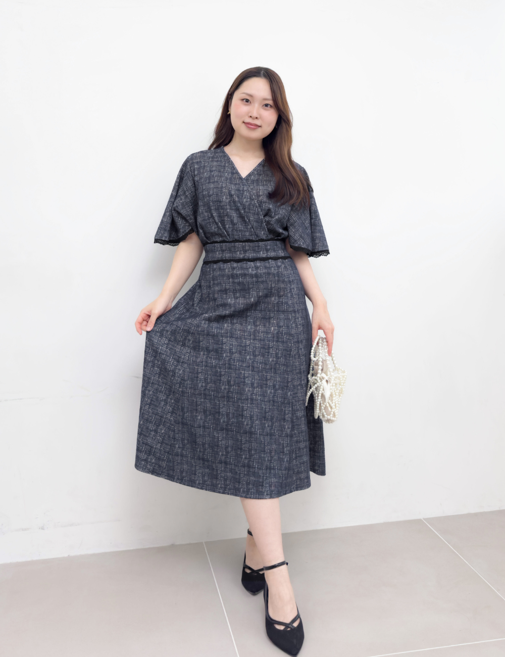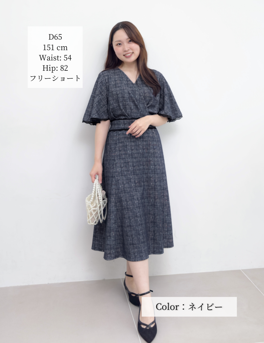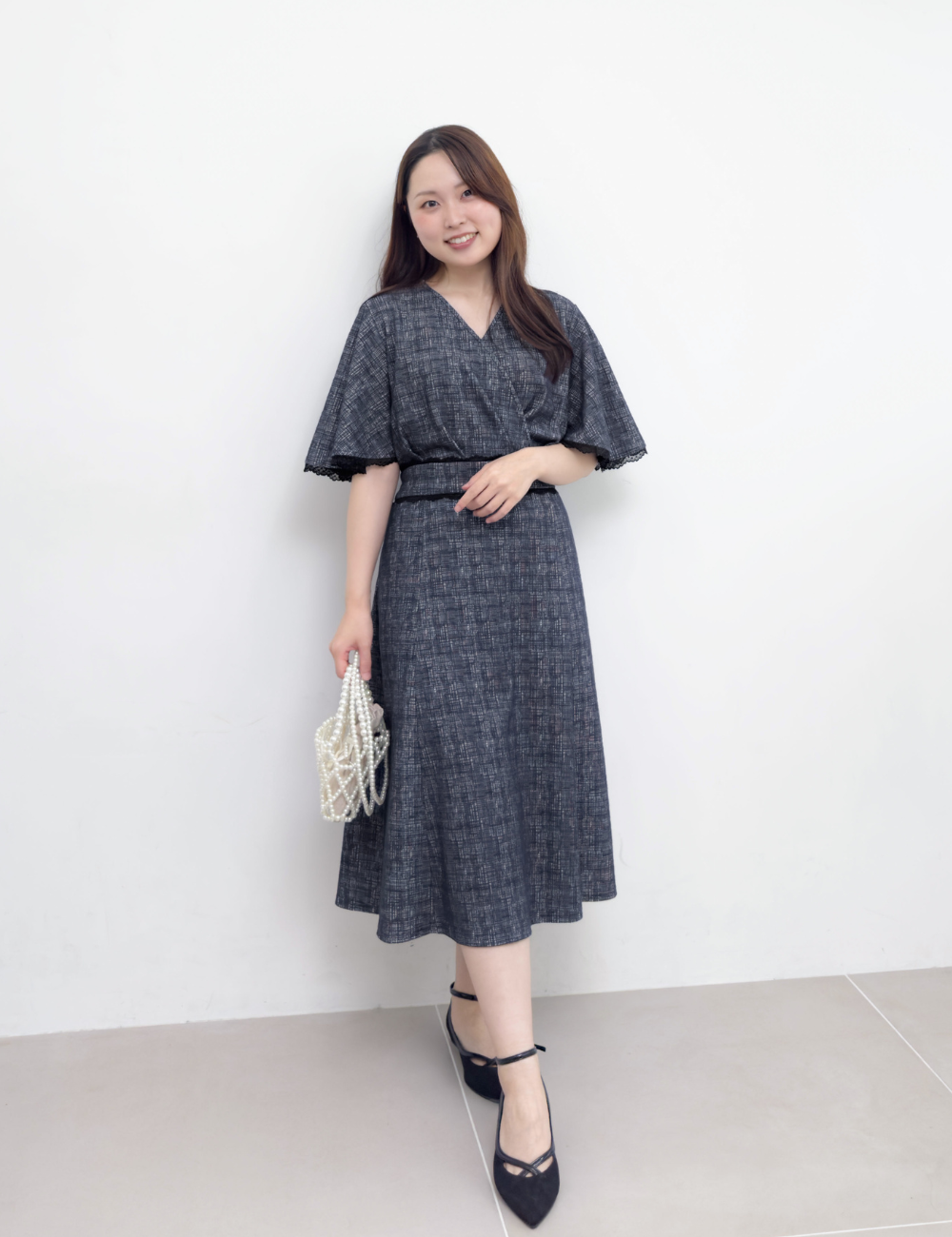 フレアスリーブが二の腕を自然にカバーしつつ、アームホールは脇高仕様で下着が見えにくい安心設計になっています。