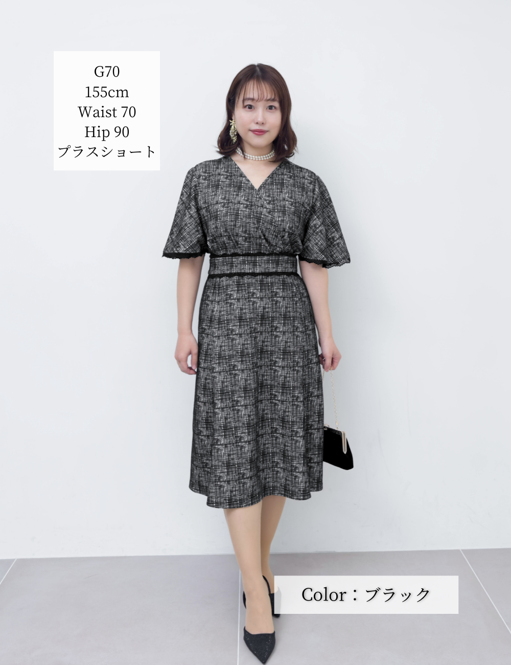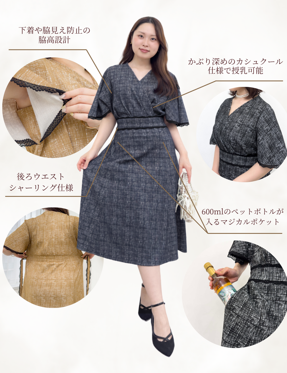 深めのカシュクール仕様で授乳もしやすく、産後にも嬉しいデザイン。